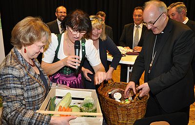 Die jüngst stattgefundene Begegnung zwischen ihm und den BBV-Kreisobmännern aus Niederbayern und der Oberpfalz sowie seine eigenen „starken Wurzeln im Bauernstand“ durch seine beiden Großmütter führte Bischof Voderholzer einleitend an. Mit großem Dank und Anerkennung verwies er auf das Engagement der Frauen in Gesellschaft und Kirche – oft ehrenamtlich in Vereinen und Verbänden, Gremien und kirchlichen Feldern. Aber auch die Weitergabe der geistig-geistlichen Grundlagen an die Kinder ruhe meist auf den Schultern der Frauen, so Bischof Voderholzer. Wichtig ist ihm, dass den Menschen der „ursprüngliche Zugang“ zur Schöpfung nicht verloren geht, der Mensch das Staunen über die Vorgänge in der Natur nicht verliert. Darüber hinaus warb der Diözesanbischof für eine „gute Sonntagskultur“, d.h. den sonntäglichen Kirchgang eventuell auch in ein besonderes Erlebnis einzubetten. Und er betonte den Wert von Ehe und Familie – insbesondere der Ehe von Mann und Frau, die im christlichen Sinn einzig die Basis für die Zukunft der Schöpfung ist. „Wir Christen schreiben niemandem vor, wie er leben möchte“, stellte Bischof Voderholzer ebenfalls fest. „Aber nicht alle Formen des Zusammenlebens sind gleich schöpfungsgemäß. Die Form des Zusammenlebens, welche die Zukunft sichert, soll privilegiert werden“, bezog der Oberhirte deutlich Stellung zu den Diskussionen über die Gleichstellung der Ehe mit gleichgeschlechtlichen Partnerschaften. Daher ist ihm auch der Schutz und die Aufmerksamkeit für Ehe und Familie ein Anliegen.