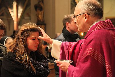 40 Tage in der Wüste – auch für jeden Christen ein immer wieder neuer Anreiz, seinen persönlichen Versuchungen Widerstand zu leisten. So wie sich die Katechumenen auf ihre Taufe in der Osternacht vorbereiten, so kann sich jeder Christ in der Fastenzeit wieder bewusst werden, ein der Taufe entsprechendes Leben zu führen. In seiner Predigt rief Bischof Rudolf alle Gläubigen dazu auf, sich neu auf den Weg zu Christus zu machen, ein Weg, der nie endet. Die Katechumenen können dazu Hilfe und Zeichen der Ermutigung sein, um aus vollem Herzen für das Evangelium einzutreten. „Christsein ist ein lebenslanger Prozess des Christwerdens“, betont Bischof Rudolf. Sei es Fasten, ein geistliches Buch, Exerzitien oder ein intensives Lesen in der Heiligen Schrift: Durch eine solche Intensivierung des Lebens ergibt sich für jeden, der die Fastenzeit bewusst begeht, eine Möglichkeit, Freiheit und Bestand gegenüber seinen Versuchungen zu erhalten und dadurch die besondere Nähe zu Gott zu spüren. So soll die Fastenzeit nicht Zeit der Trauer sein, sondern eine Phase der geistigen Freude, die Gottes Nähe schenkt. Zum Zeichen der Buße legten der Regensburger Bischof und mehrere Priester den Gläubigen das Aschekreuz auf.