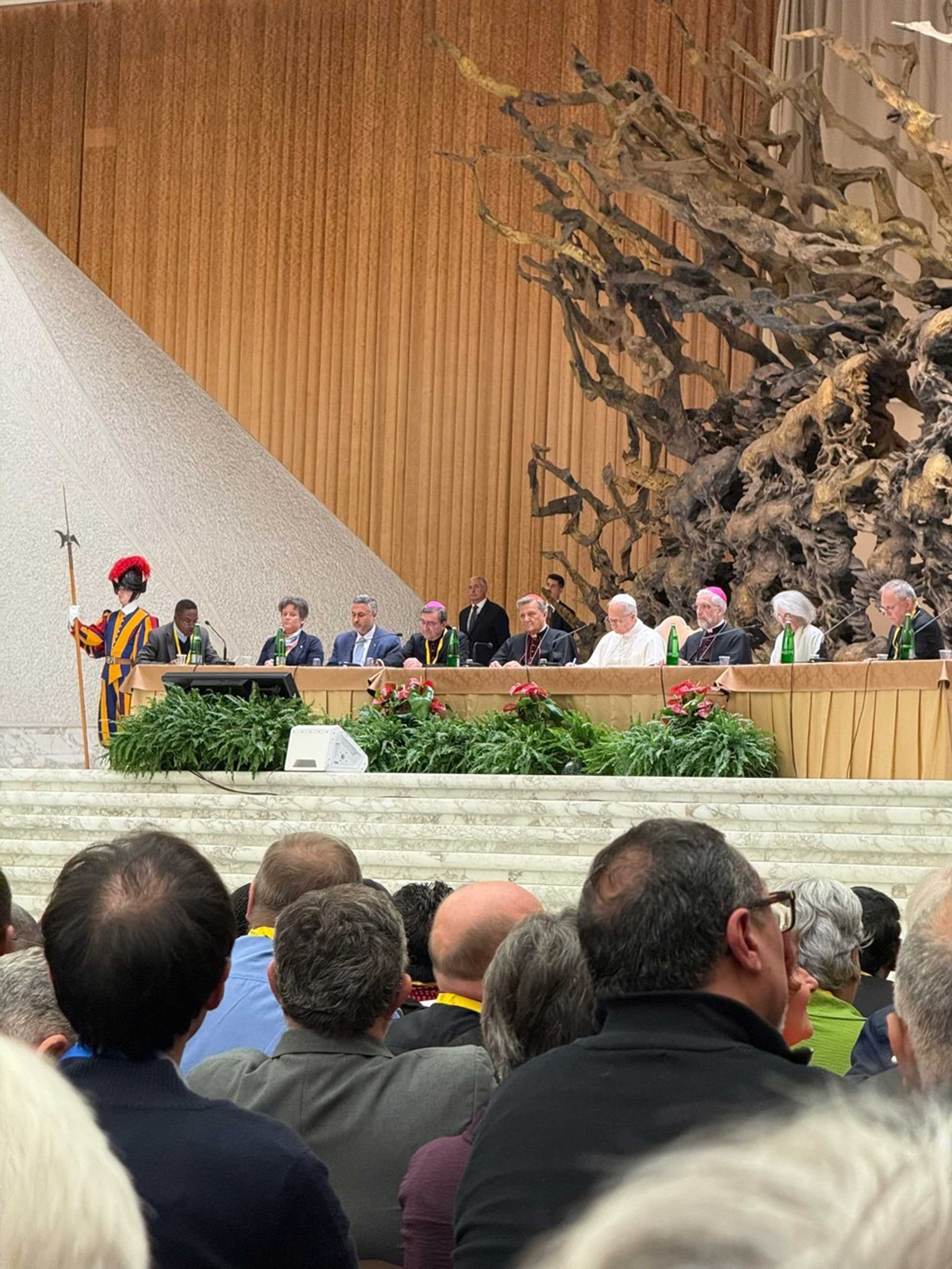 Gut 2000 Frauen und Männer, vom Kardinal bis zum Pfarrgemeindemitglied aus wirklich aller Welt waren zusammengekommen. Nach der Registrierung am Freitagvormittag und einer ersten gemeinsamen Andacht mit der Bitte um den Heiligen Geist folgten am Nachmittag drei Grundsatzimpulse zum Thema Synodalität aus unterschiedlichen theologischen Sichtweisen. Gegen Abend kam Papst Leo XIV. in die Mitte der Versammlung, lauschte gemeinsam mit ihr den Erfahrungen aus sieben unterschiedlichen Weltgegenden, die allesamt je eine Frage an ihn richteten. Den Apell aus seinen Antrittsworten nach der Wahl am 8. Mai nimmt der Heilige Vater offenbar sehr ernst und reiht sich so in die Synodale Kirche ein. Mit seinen herzlichen, profunden und in drei Sprachen auf die Menschen eingehenden Antworten, beeindruckte das Kirchenoberhaupt uns alle. Der Abend bot dann Möglichkeit, diesen ersten Tag auf sich wirken zu lassen oder erste, neue Kontakte zu vertiefen.