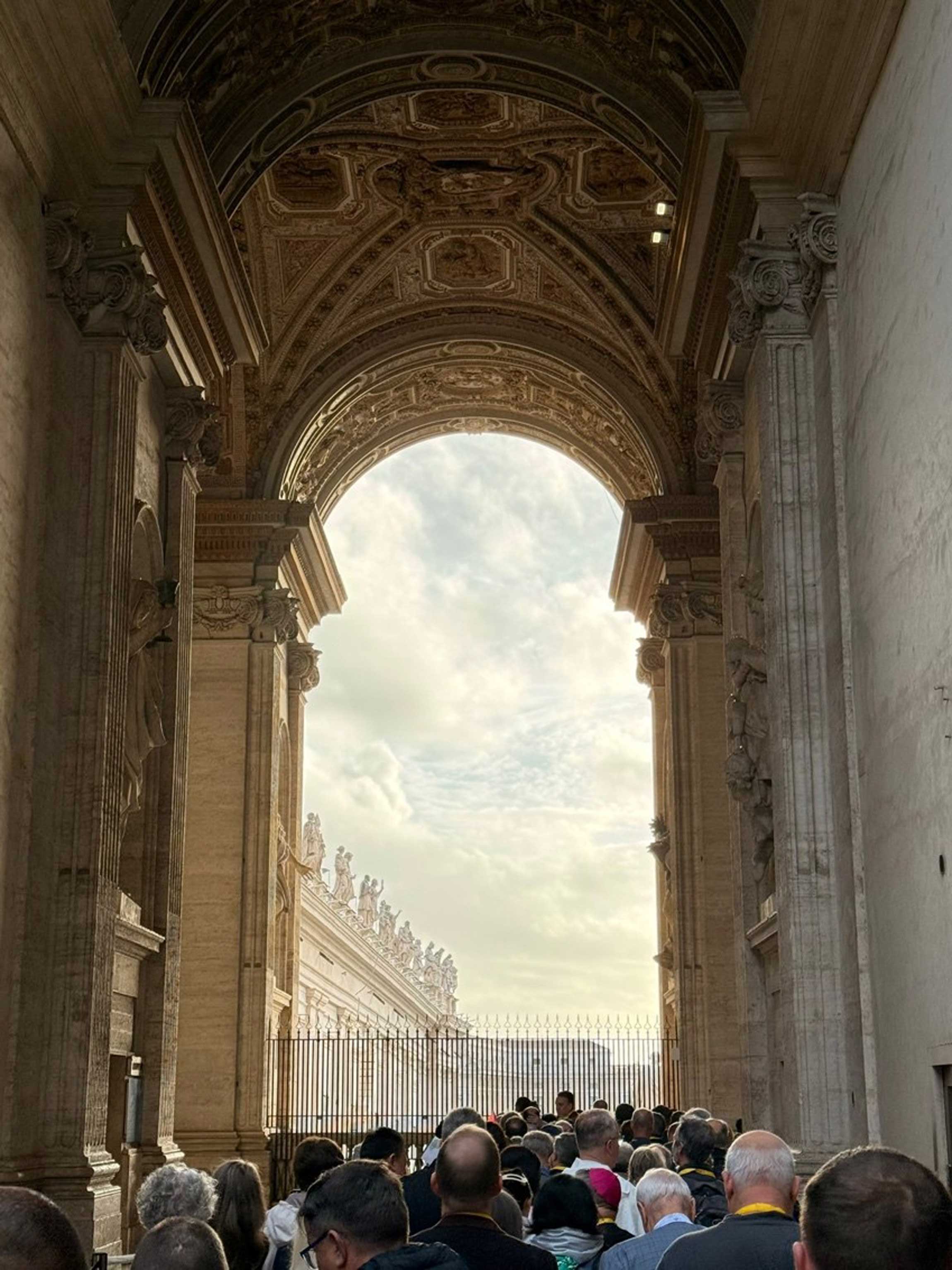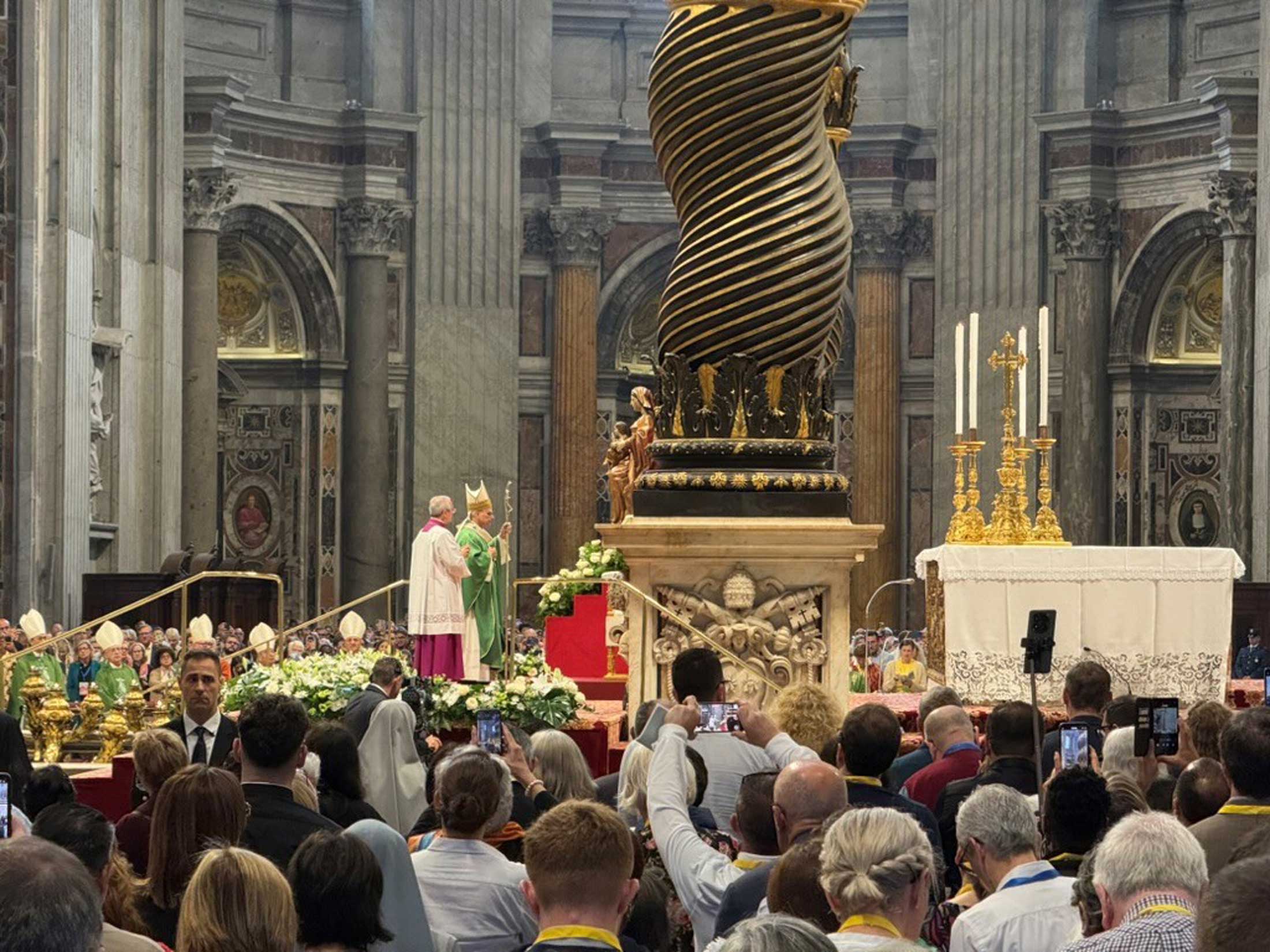 Am Sonntag waren alle zur Eucharistie nach St. Peter eingeladen. Die Mitglieder des Treffens, erkennbar an ihren gelben Bändern, durften weiter vorne Platz nehmen, während sich die Basilika auch mit anderen Pilgerinnen und Pilgern füllte – von den Tausenden nicht zu reden, die wir dann sahen, als wir hinterher auf den Petersplatz traten. Papst Leo richtete seine Sonntagspredigt sehr gezielt an uns „Team-Synodale“ und sprach in ermutigenden Worten davon, wie wir uns vom Geist des geschwisterlichen Miteinanders und der dienenden Liebe nicht nur in der Kirche, sondern in der Welt stärken lassen sollen.
