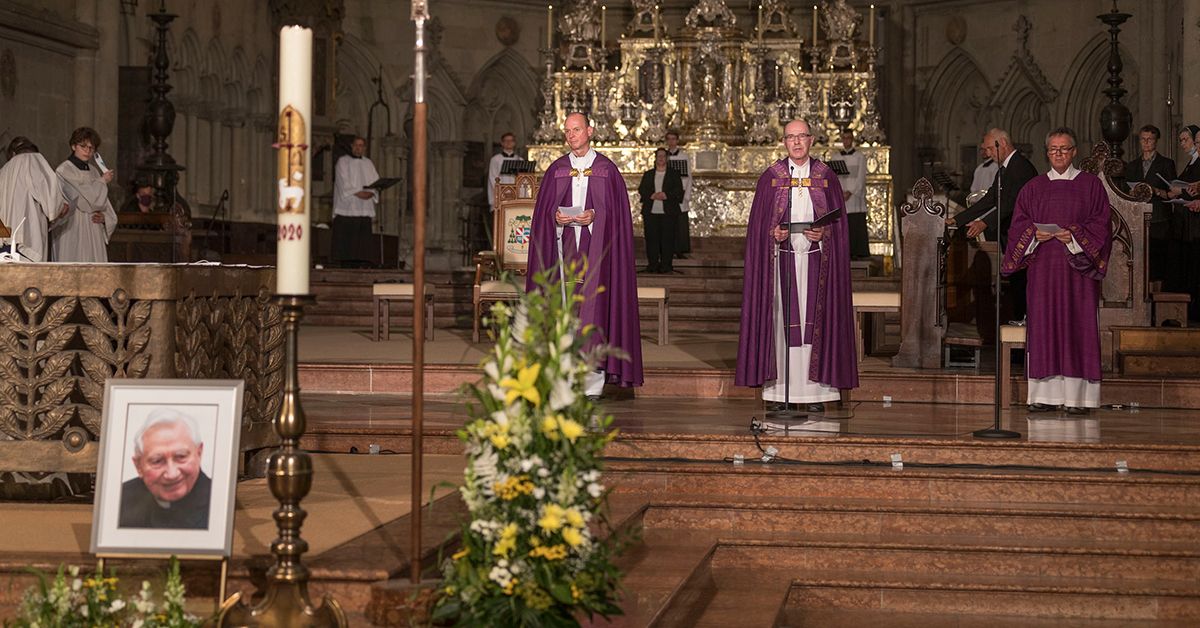 Ein beeindruckendes Klangbild war am Sonntagnachmittag im Regensburger Dom zu hören: Über 200 ehemalige Dompatzen haben ihrem Domkapellmeister emeritus Georg Ratzinger im Rahmen einer Totenvesper die letzte Ehre gegeben. „Das ist Euer ganz eigener Abschied von Domkapellmeister Georg Ratzinger – so, wie nur Ihr es könnt und wie es Euch der Verstorbene sein Leben lang vorgelebt hat: mit Gesang und im Gebet!“ So brachte es Dompropst Dr. Franz Frühmorgen, der der Vesper liturgisch vorstand, in seiner Predigt auf den Punkt. Auch Bischof Rudolf Voderholzer hatte sich eingefunden, um mitzubeten und dem Gesang der früheren Spatzen zu lauschen. Und der war musikalisch in der Tat ein seltener Genuss: Im ganzen Dom verteilt saßen ehemalige Domspatzen und antworteten der vorsingenden Schola in vierstimmigem Gesang. Verstärkt durch die Akustik des Domes ergab das wahrhaft ergreifende Klänge. Koordiniert wurden die Sänger von drei Dirigenten. Domkapellmeister Christian Heiß stand als Hauptdirigent in der Mitte des Chorraumes und zwei weitere Dirigenten befanden sich auf zwei Podesten in den Seitenschiffen. Sie synchronisierten ihr Dirigat mit dem des Domkapellmeisters und so hatten alle im Dom verteilten ehemaligen Domspatzen Blick auf einen Dirigenten. Darüber hinaus begleitete Domorganist Prof. Franz Josef Stoiber die Vesper mit schöpferischem und einfühlsamem Orgelspiel – sein Nachspiel zog alle Anwesenden so in den Bann, dass sich selbst nach dem Verklingen des letzten Tones für einige Sekunden niemand rühren wollte.