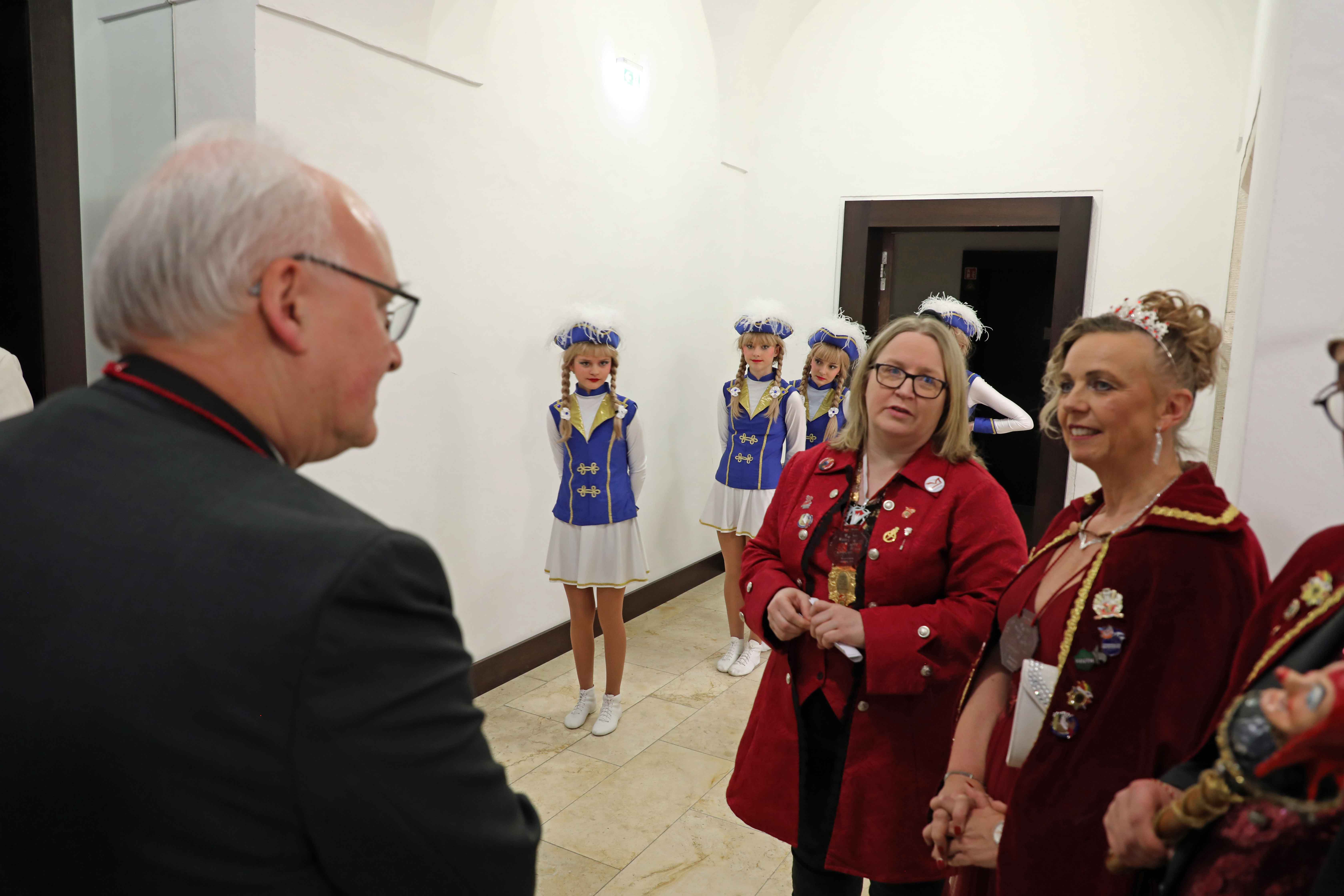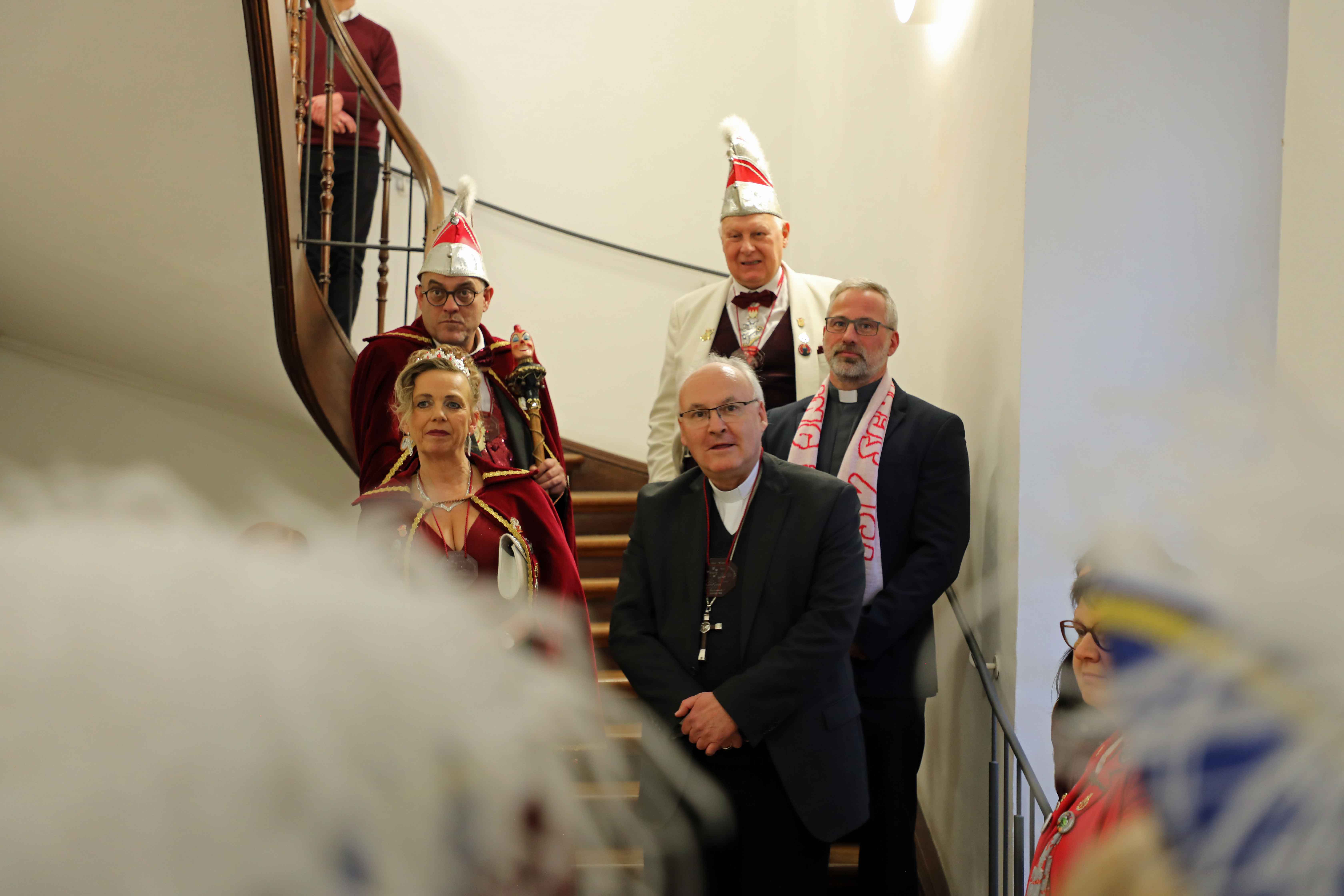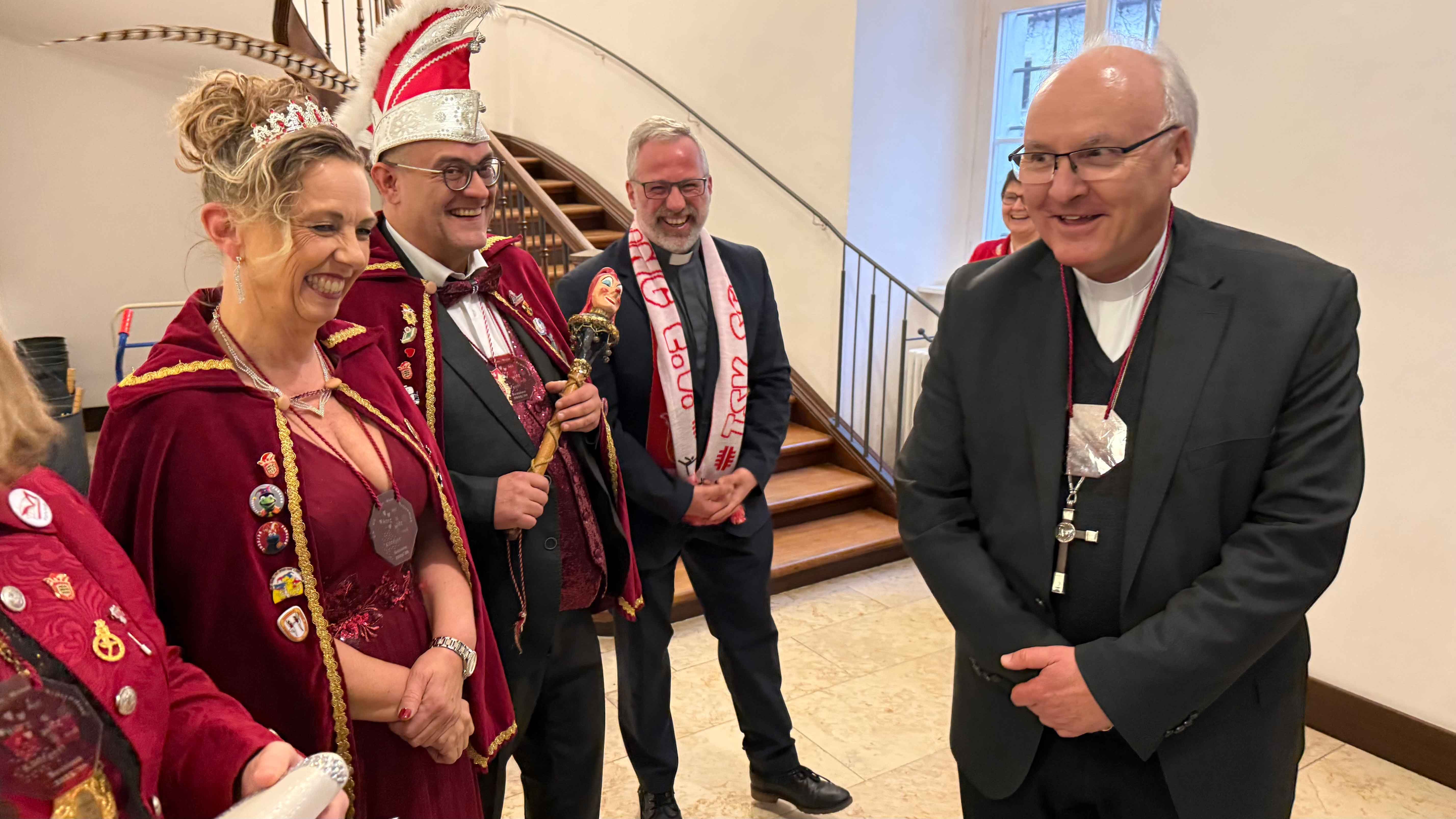 Das amtierende Prinzenpaar Sylvia I. (Sylvia Tremel) und Oskar I. (Oskar Arndt) wurden von der Präsidentin des Faschingsgesellschaft, Mirjam Max, sowie der zwei Juniorenmariechen Nele und Madita, der Juniorengarde, vielen Mitgliedern, Helfern und Unterstützern der Faschingsgesellschaft Rot-Weiß Schirnding nach Regensburg begleitet. Den „närrischen Besuch“ hatte der Arzberger Pfarrer Stefan Prunhuber eingefädelt, der selbst ein begeisterter Faschingsfreund ist. Als Mitglied der Faschingsgesellschaft setzt er sich selbst auch ab und zu die „Narrenkappe“ auf, wie er beim Besuch bei Bischof Rudolf verraten hat. Fasching ist für den Geistlichen kein Gegenpol zum Glauben, sondern „eine Erinnerung daran, dass Gott uns auch die Freude geschenkt hat. Ein frohes Herz ist schließlich auch eine Form des Dankgebets – nur mit Musikbegleitung und manchmal etwas Glitzer“. Pfarrer Stefan Prunhuber bedankte sich bei Bischof Rudolf für dessen Offenheit und Wohlwollen gegenüber dem Engagement der „Faschingsgesellschaft Rot-Weiß Schirnding“.
