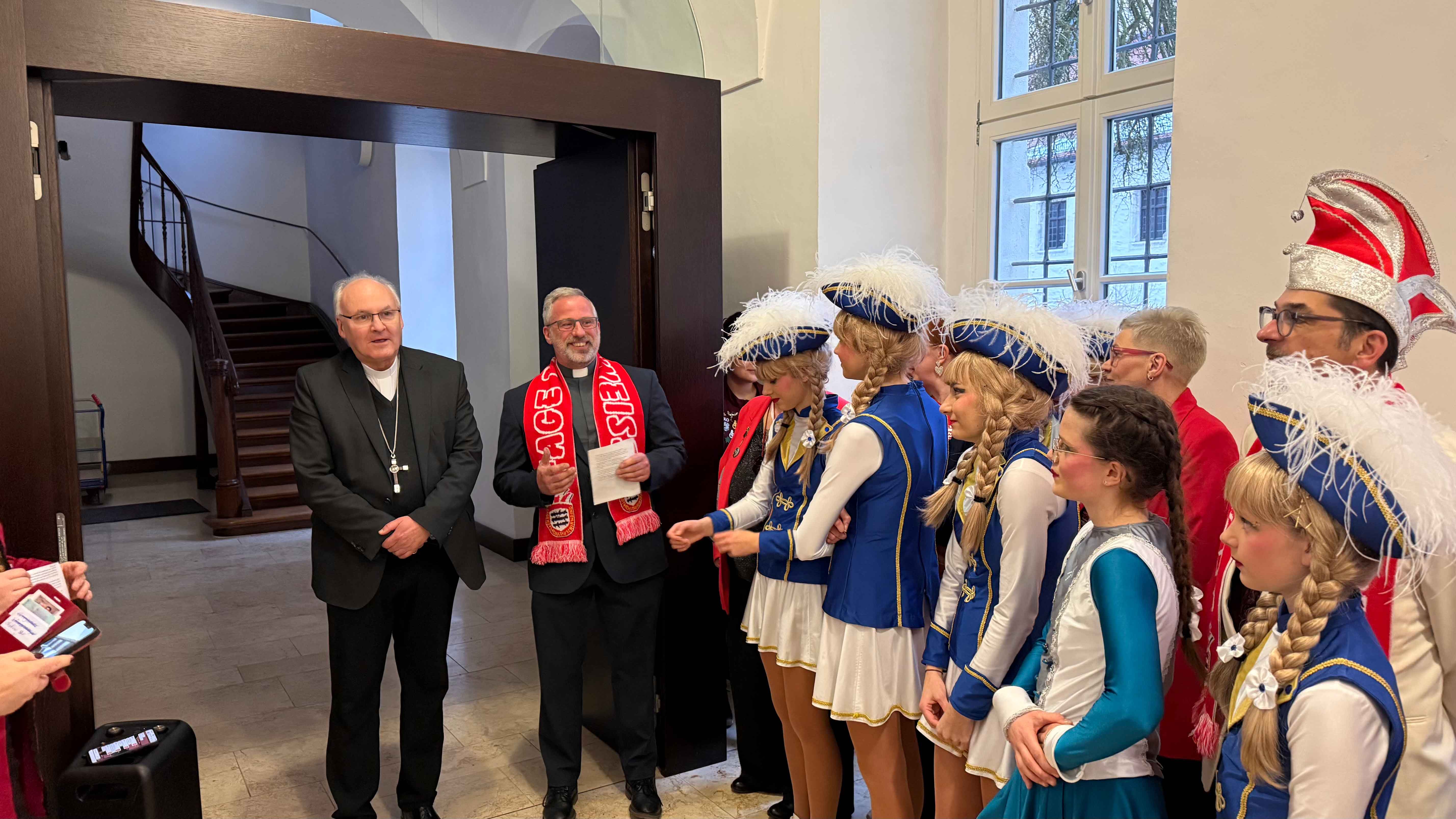 „Bischof Voderholzer Helau, Faschingsgesellschaft Helau und Regensburg Helau“, schallte es am Freitagnachmittag durch das Bischöfliche Ordinariat in Regensburg. Anlass war der „närrische“ Besuch der „Faschingsgesellschaft Rot-Weiß Schirnding“ aus dem Landkreis Wunsiedel im Fichtelgebirge.