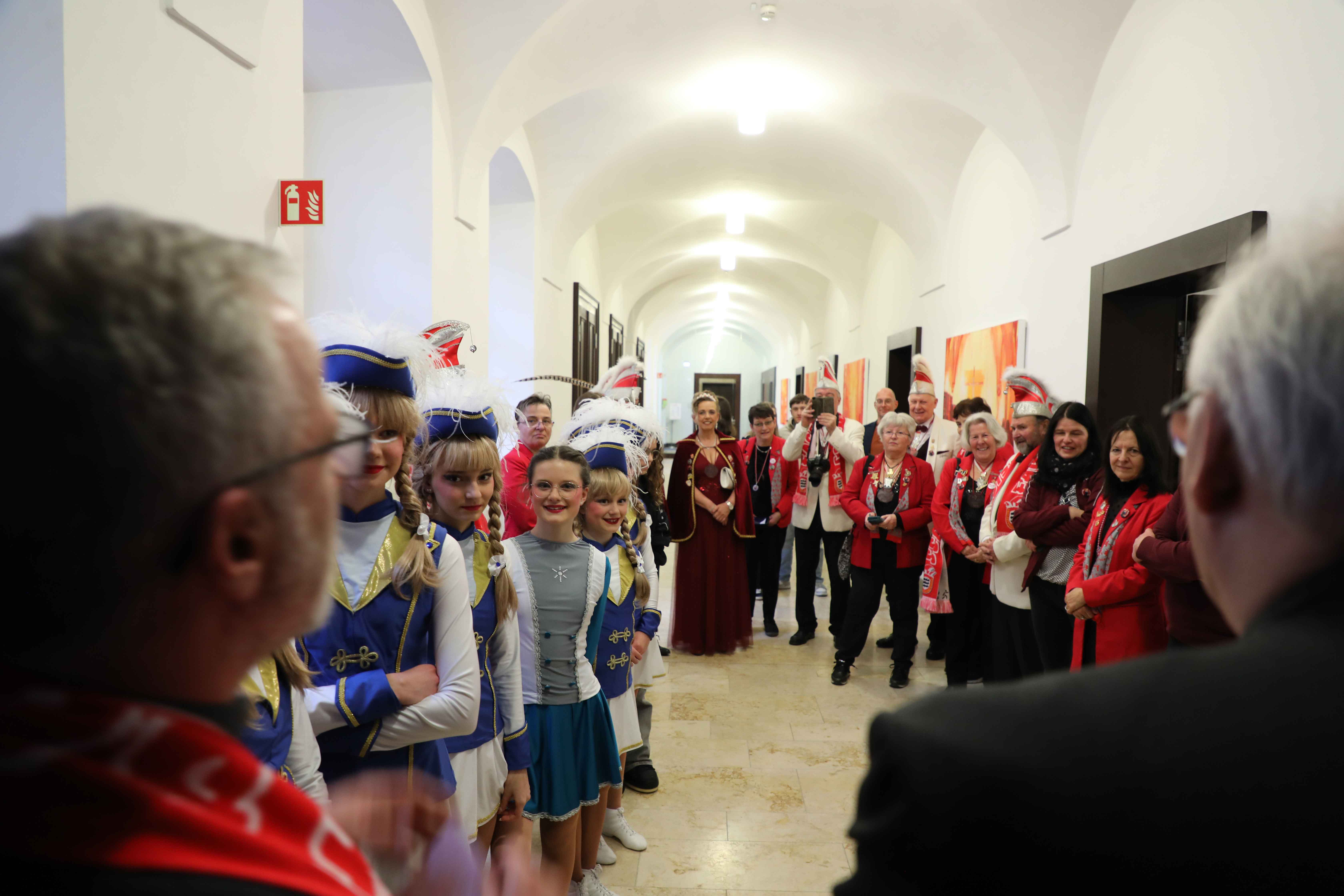 Zum Abschluss ihres Besuches überreichte Prinzessin Sylvia I. Bischof Rudolf den Sessionsorden der Faschingsgesellschaft und die Juniorengarde zeigte nach den Tänzen der beiden Juniorenmariechen schwungvolle Choreografien, die zeigten wie viel Disziplin, Teamgeist und Herzblut im Fasching stecken. Bischof Rudolf bedankte sich danach für den „närrischen“ und schwungvollen Besuch im Bischöflichen Ordinariat und führte die Gruppe aus Schirnding abschließend durch die Räume der Hauskapelle und verschiedenen Bereiche im Ordinariat.