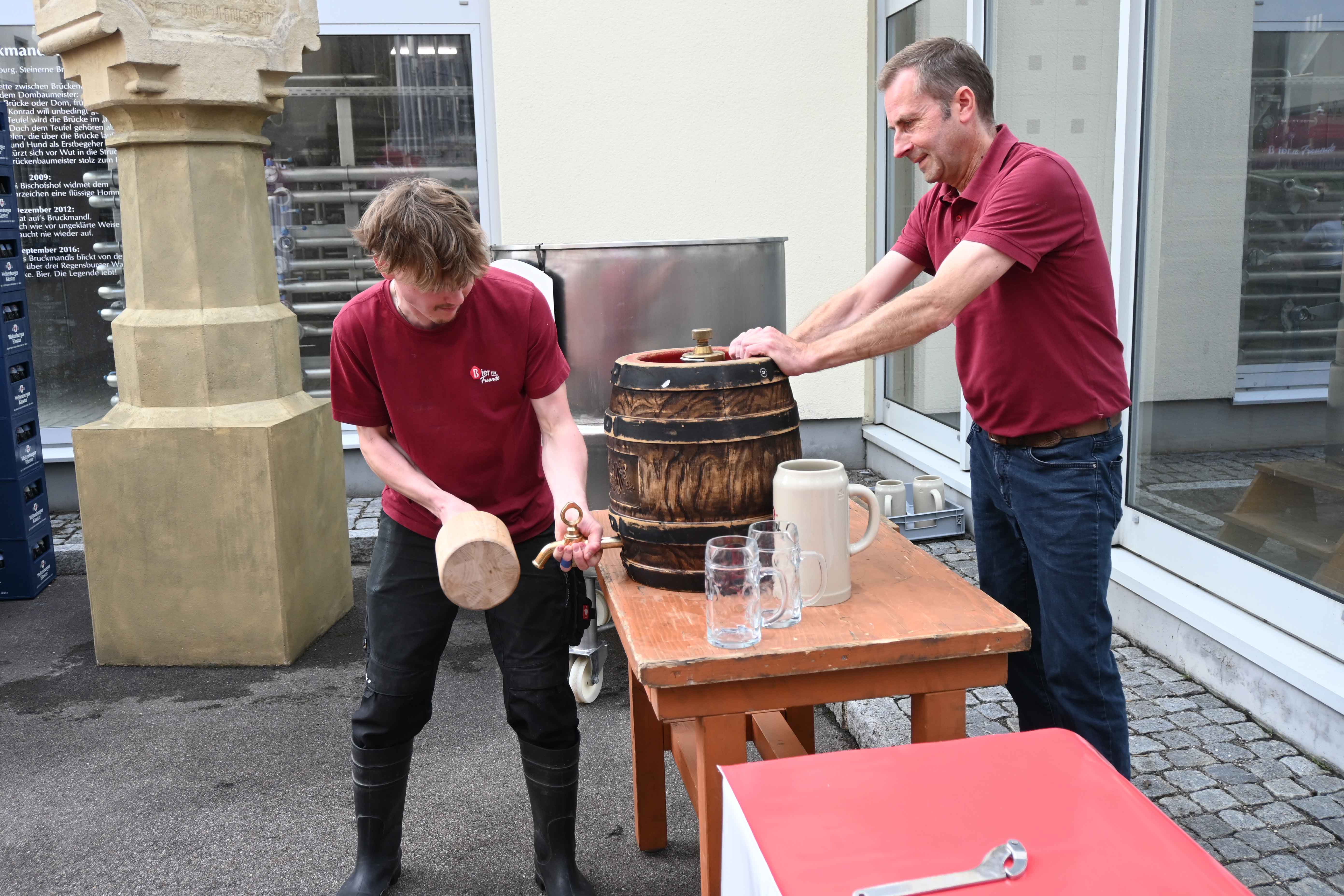 Das in der Ausbildung angeeignete Wissen musste Jonas Marx mit drei Aufgaben vor den Augen der Mitarbeiterinnen und Mitarbeiter unter Beweis stellen. Zunächst galt es für ihn, einige Brauereiwerkzeuge und -utensilien zu benennen und ihre Funktion zu beschreiben: am Tisch lagen ein Holzschlegel (zum Anzapfen des Fasses), ein Kükenhahn (Zapfhahn), ein Kompensatorhahn (für möglichst schaumfreies Bierzapfen), ein Hakenschlüssel und ein Fassentlüfter. Daraus ergab sich folgerichtig die zweite Aufgabe, das Anzapfen eines Bierfasses, was der Geselle mit Bravour meisterte. Schließlich oblag es ihm, das gezapfte Bier, konkret die Charakteristika, anhand einiger gekosteter Schlucke mit ein paar Worten zu beschreiben. Nach diesen drei Prüfungen wurde es dann ernst: Jonas Marx musste in den Bottich steigen, und einige der Kollegen überschütteten ihn aus großen Krügen mit dem gezapften Bier und dem von Ausbilder Andreas König vorgetragenen Spruch: „Hiermit erhebe ich Dich endgültig in den Stand eines Brauer- und Mälzergesellen. Gott geb’ Glück und Segen drein!“