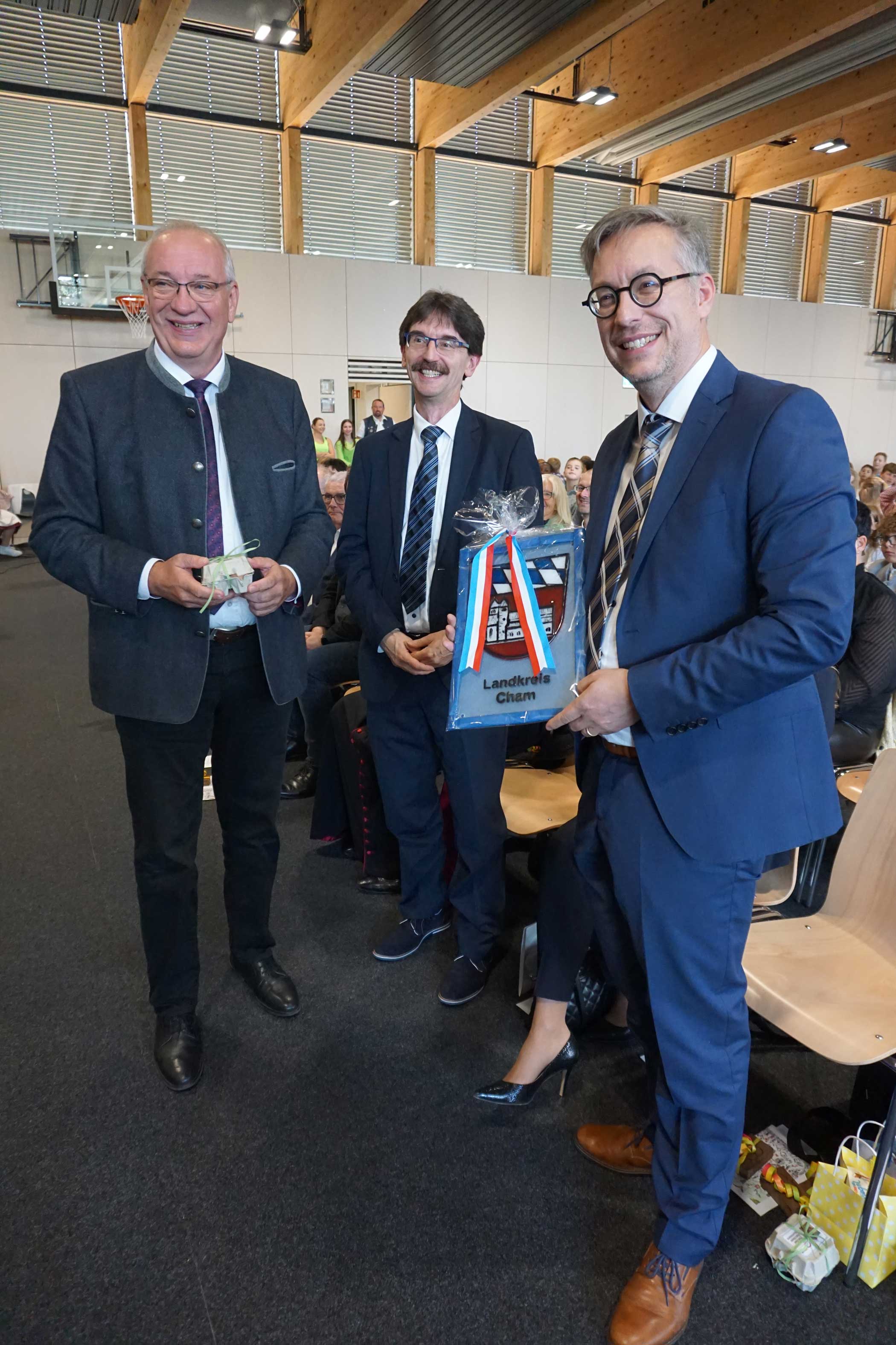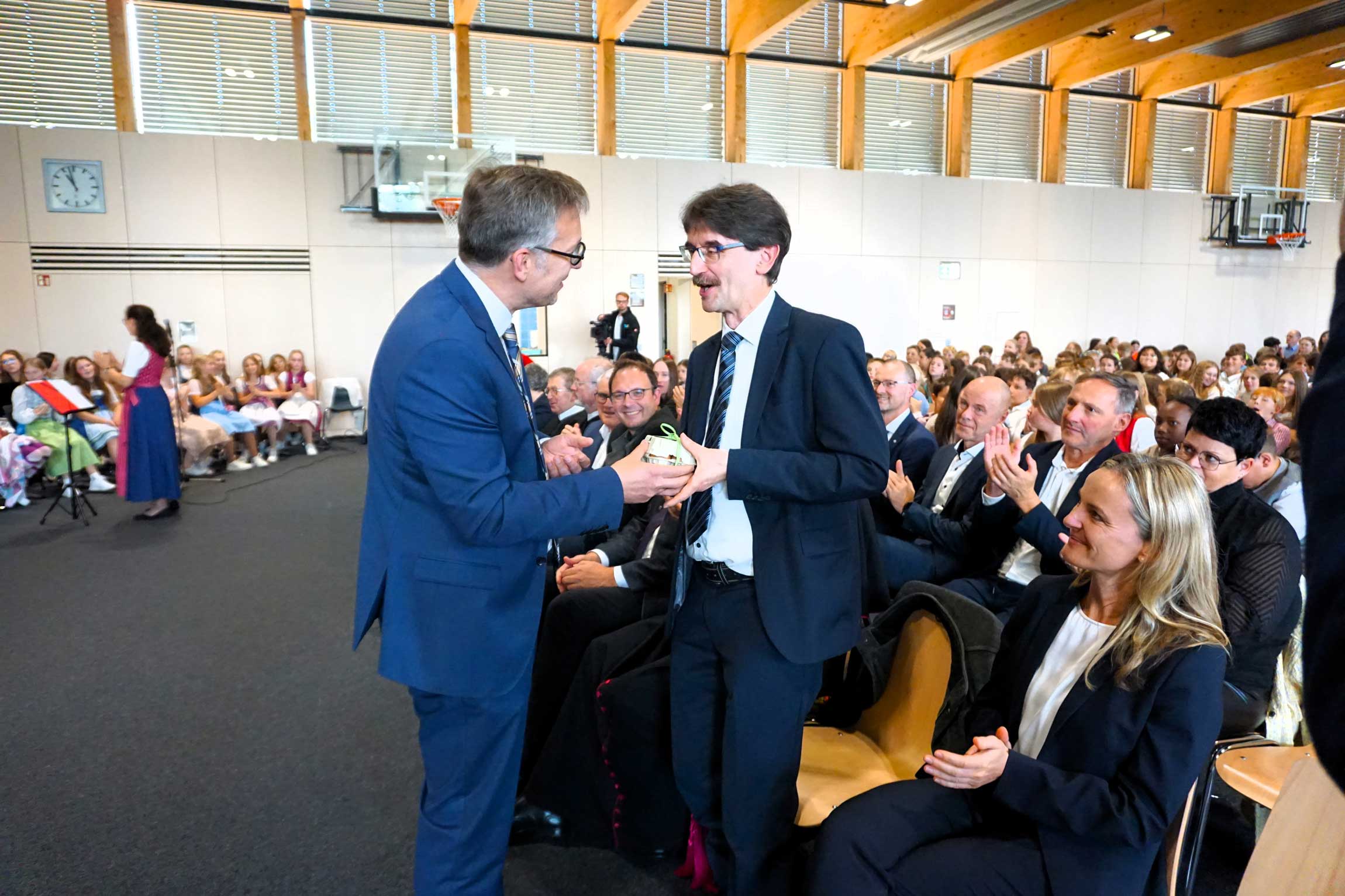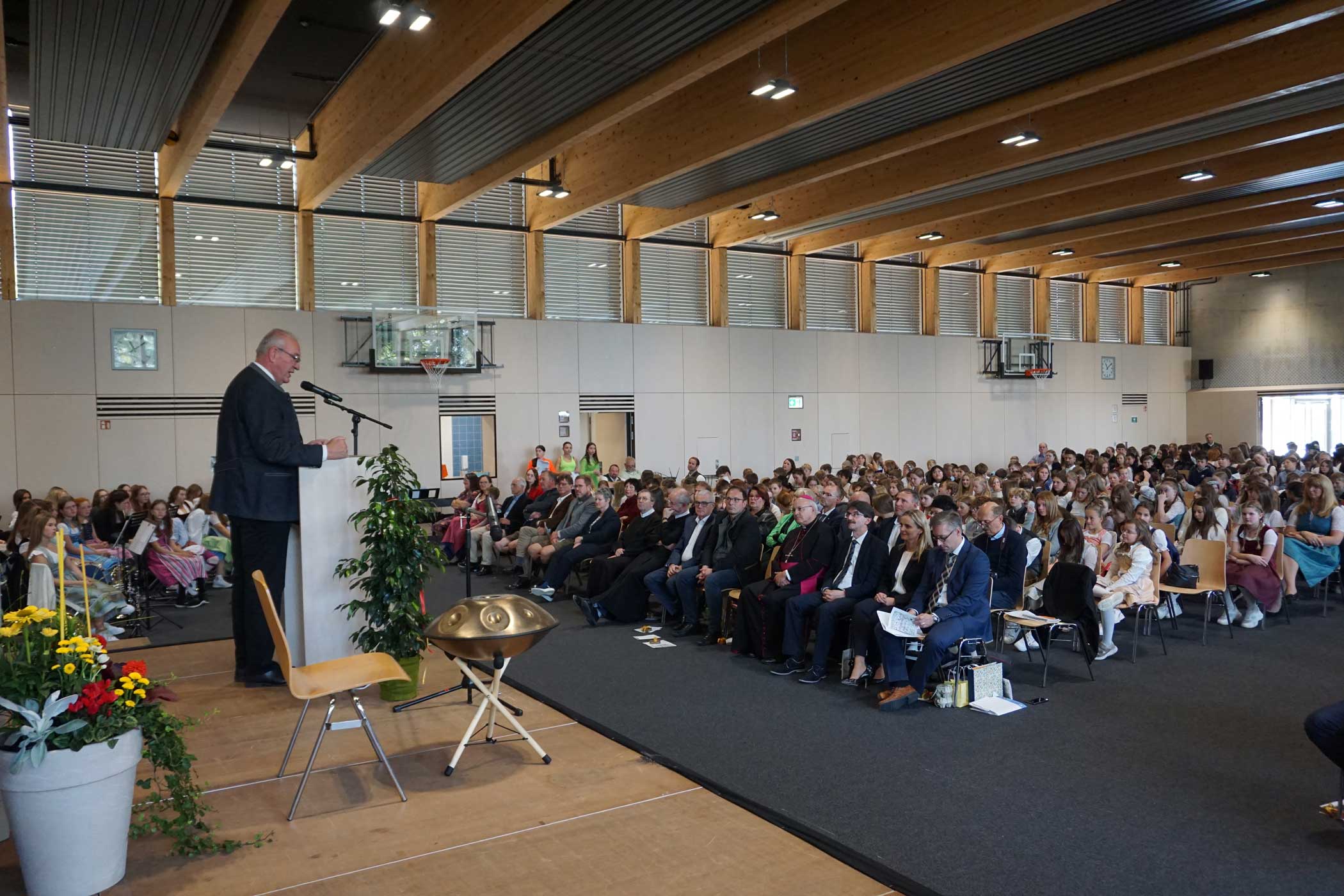 Die Schulgemeinschaft, bestehend aus 670 Schülerinnen und Schülern, die fast vollständig in Tracht erschienen waren, sowie zahlreiche Ehrengäste, versammelten sich zur Feier in der lichtdurchfluteten neuen Doppelturnhalle. Schulleiter Christian Haringer begrüßte die Anwesenden mit sichtbarer Freude: „Ich kenne niemanden, dem es nicht beim ersten Anblick unserer Aula den Atem verschlägt!“ Er lobte insbesondere das Architekten- und Planungsteam Schnabel und Partner aus Bad Kötzting und bedankte sich mehrfach bei Architekt Markus Weber für die hervorragende Zusammenarbeit.