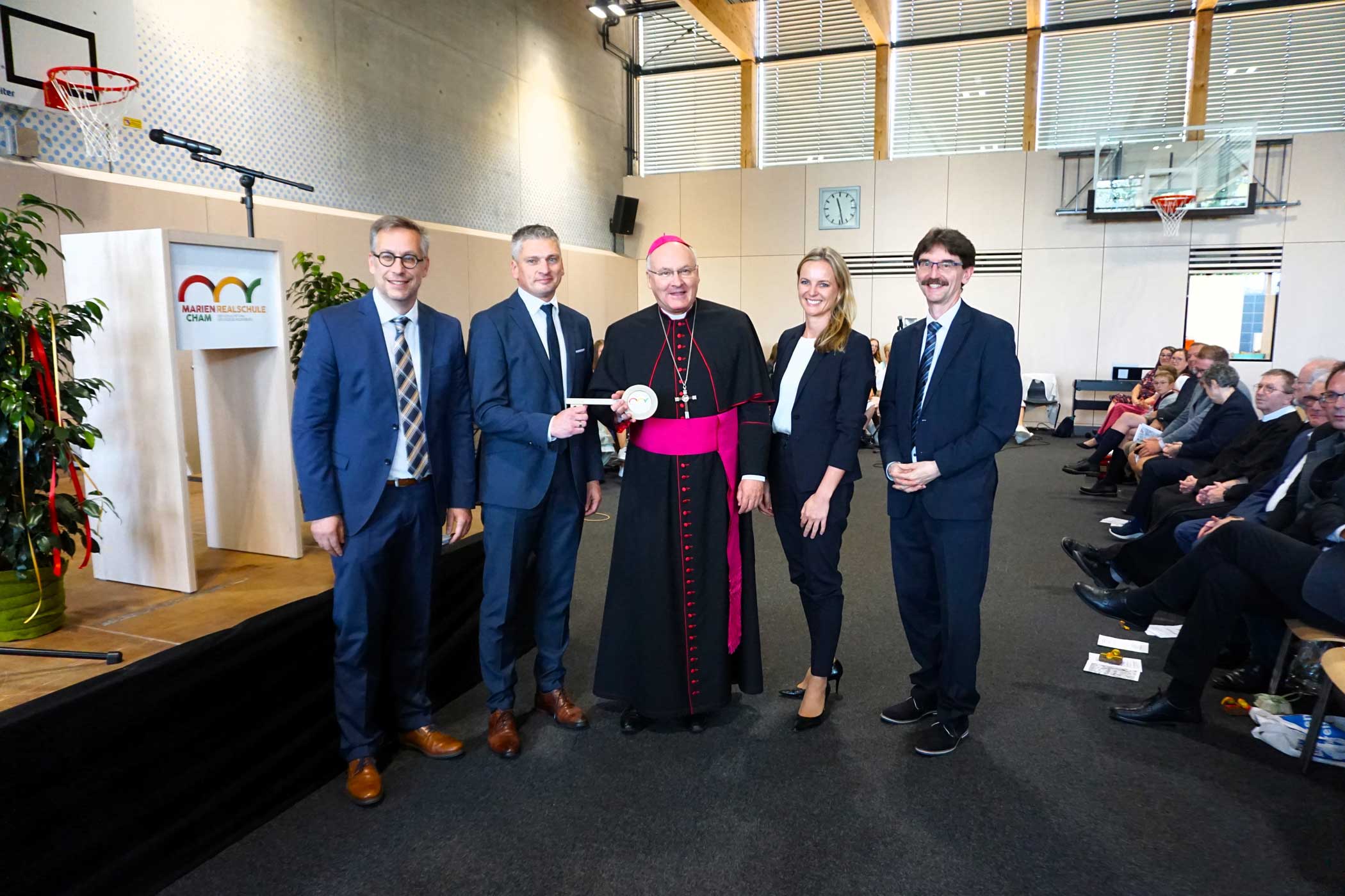 Landrat Franz Löffler lobte das Projekt: „Der Landkreis Cham kann sich sehr glücklich schätzen, dass sich Diözese und Schulstiftung so stark für die Bildung in unserer Region engagieren!“ Er betonte zudem die Bedeutung des christlichen Leitbilds, das sich in einem „betont respektvollen Umgang der gesamten Schulfamilie“ widerspiegle. Zum Abschluss erläuterte Architekt Markus Weber die umfangreichen Planungen und den achtjährigen Bauprozess: „Wir sind stolz, mit diesem Schlüssel ein tolles Schulgebäude übergeben zu dürfen und wünschen Freude, Gottes Segen und alles Gute in den neuen Räumen.“ Im Anschluss übergab Weber symbolisch den Schlüssel an Bischof Rudolf Voderholzer, der ihn gemeinsam mit Günter Jehl, Regina Braunreiter und Christian Haringer entgegennahm.