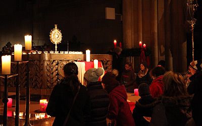 Gefüllter Dom am Samstag beim „Nightfever“: Zahlreiche Menschen kamen im Hohen Dom St. Peter zu Regensburg zusammen, um sich in adventlicher Besinnung auf die Ankunft des Herrn an Weihnachten vorzubereiten. Dazu hatten „Jugend 2000“ und Bischof Rudolf Voderholzer erneut eingeladen. Auch wenn es draußen nasskalt war, brachte das Nightfever Herzen zum Glühen. Im von Kerzenschein beleuchteten Dom war an diesem Abend reichlich Zeit zum Gebet und zum Singen. Bis in die Nacht hinein war das Allerheiligste zur Anbetung ausgesetzt. Menschen kamen mit ihren Anliegen zum Altar, knieten dort nieder und entzündeten Kerzen. Viele nutzten die Möglichkeit zur Beichte, die den ganzen Abend über bestand.