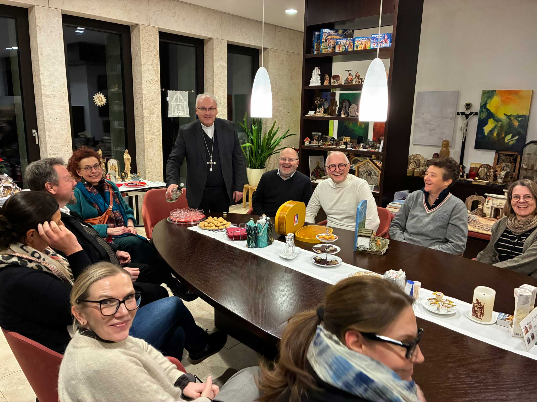 Beginnend mit der privaten Krippe des Bischofs über Prachtstücke mit Lokalkolorit wurde den Besuchern der Bogen über die weltweite Kunst von Weihnachts- oder sogar Ganzjahreskrippen anschaulich vor Augen geführt. Ob zeitgenössische Krippendarstellungen aus dem Hl. Land oder polnische Krippendarstellungen, bis nach Mexiko in die neue Welt reicht die Fülle der beeindruckenden Sammlung. Damit „Bruder Leib“ nicht ermattet, gab es zur Halbzeit eine kleine Stärkung, so dass die dreistündige Fortbildungseinheit glänzend bestanden werden konnte. Beim abschließenden gemeinsamen Abendessen wurden dann die Inhalte nochmals vertieft und als Anregung für den pädagogischen Alltag an den Schulen diskutiert, so dass die Gäste schwer beeindruckt von der Leidenschaft ihres Bischofs voller Eindrücke spät den Nachhauseweg antraten, um den Schutzbefohlenen später etwas davon zuteilwerden zu lassen, was sie unter Anleitung ihres Oberhirten alles selbst gelernt haben.