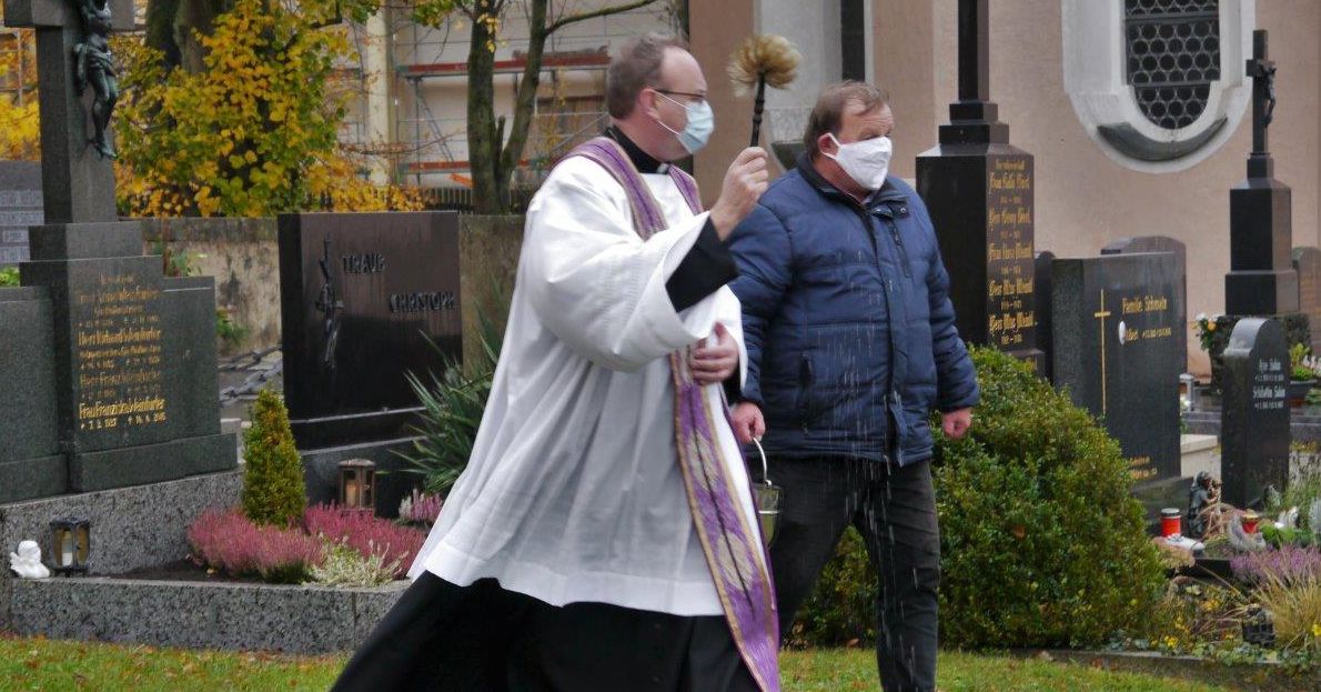 Zur Gräbersegnung auf dem Friedhof des Marktes Ergoldsbach kamen ein paar hundert Menschen (sonst sind es um die 4.000!) Die meisten trugen Mund-Nase-Bedeckung auf dem weitläufigen Friedhofsareal.