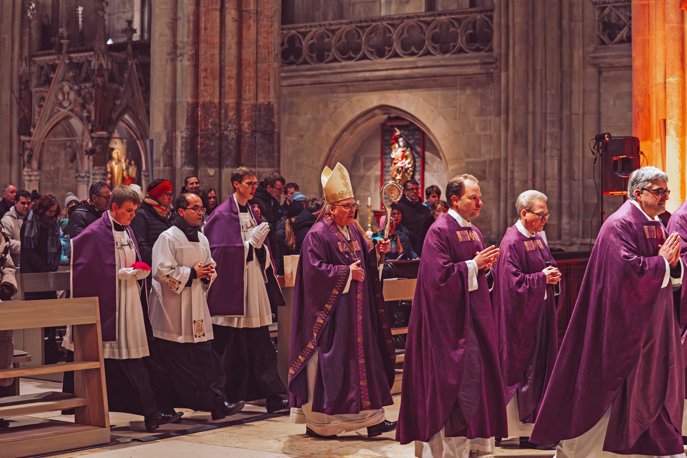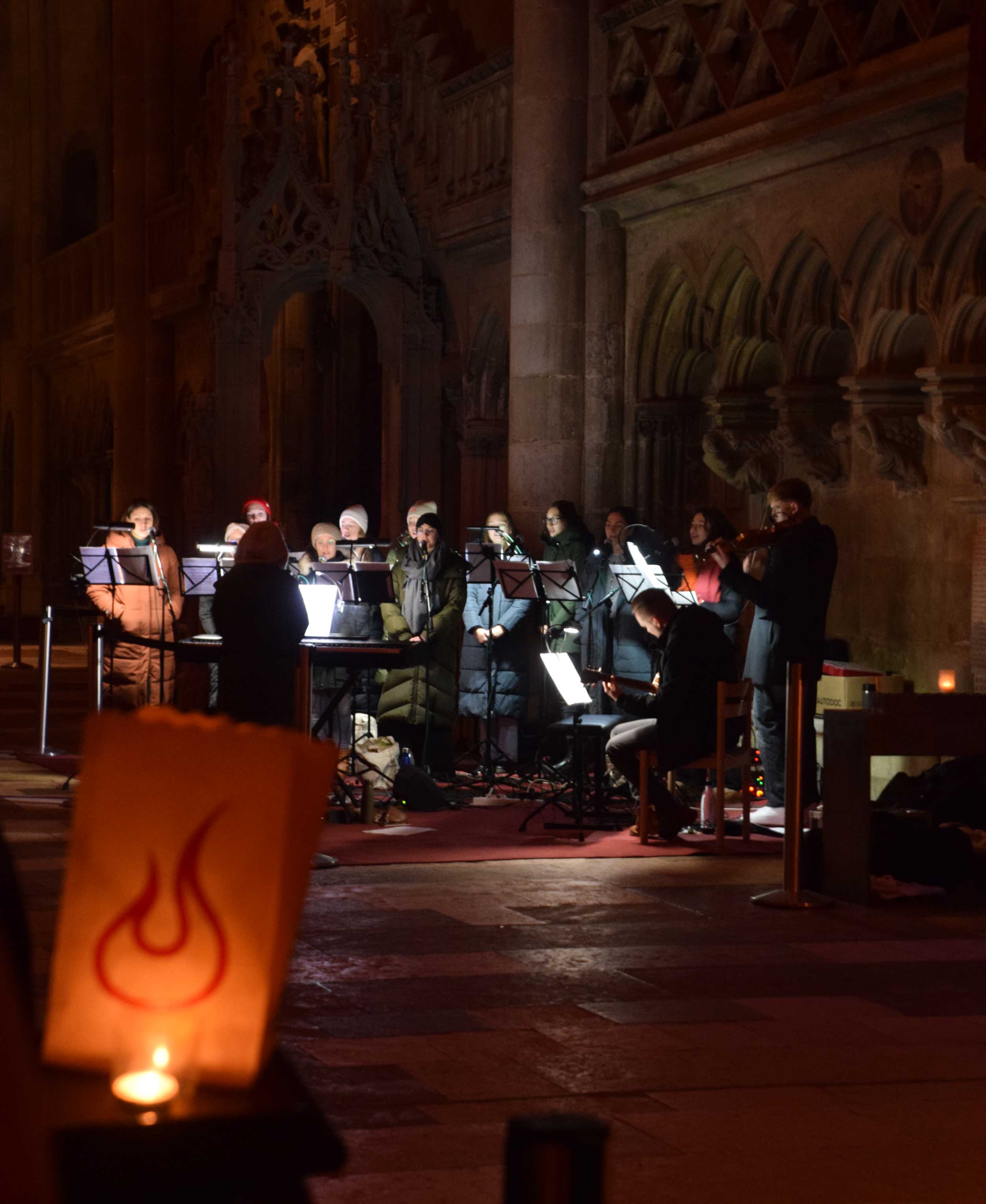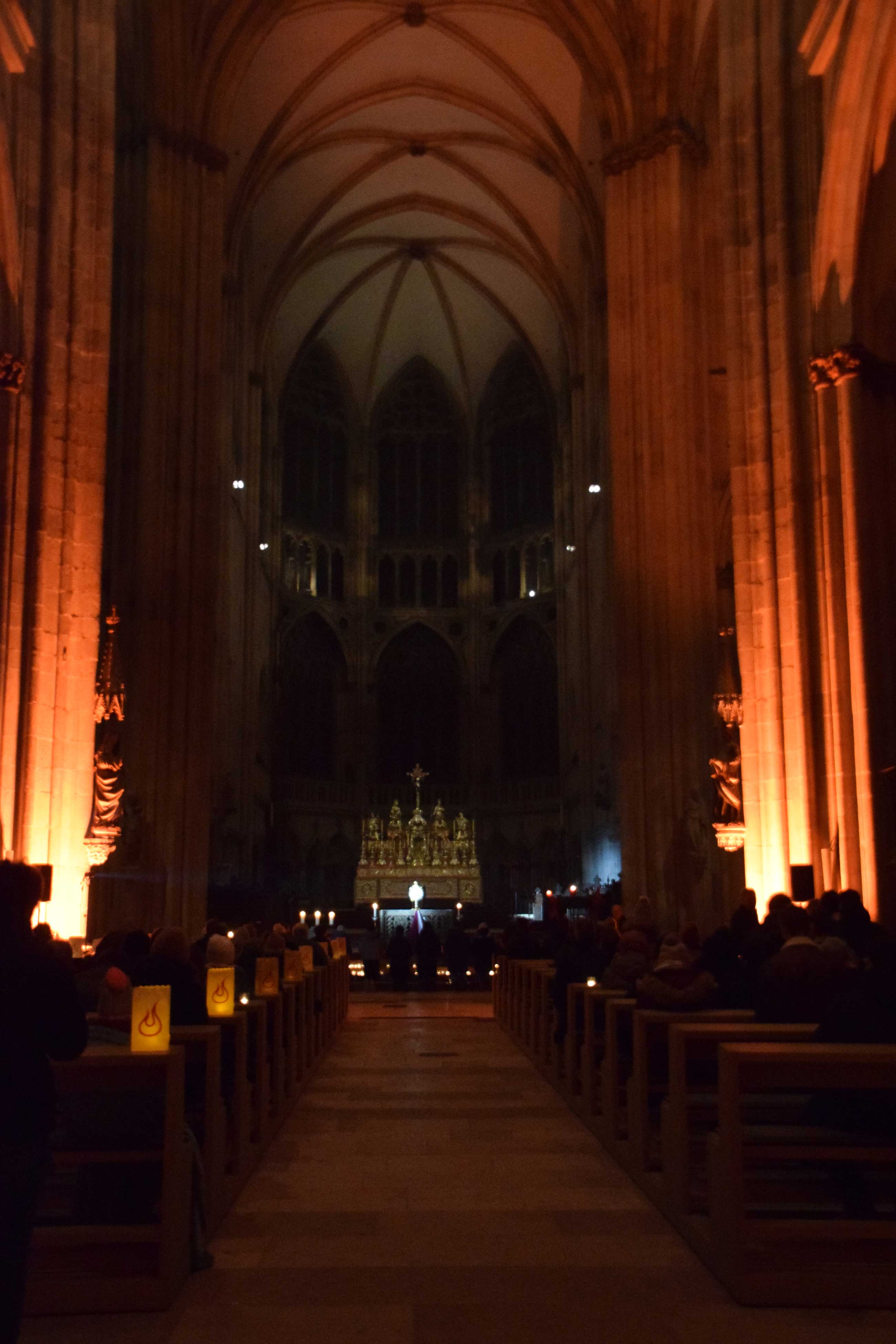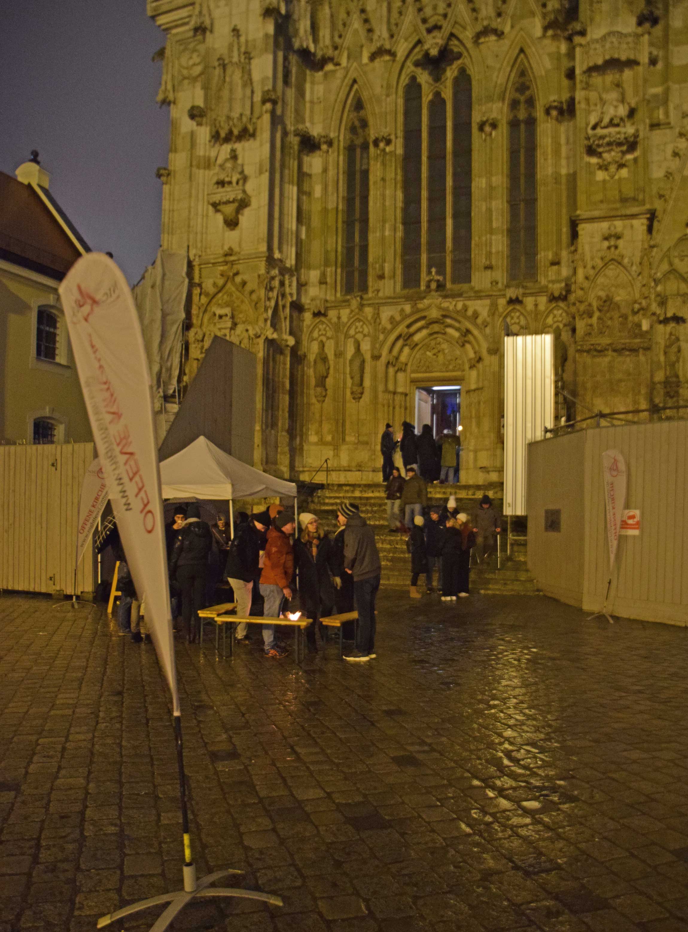 Der offene Gebetsabend ab 17 Uhr bot drei Stunden in besinnlicher Atmosphäre. Es gab mehrere Angebote, z. B. stilles Gebet und die Verehrung des Allerheiligsten, das am Altar ausgesetzt worden war, eine Bibelvers-Ziehung als geistlichen Impuls, das Entzünden von Kerzen mit Gebetsanliegen und Dank an Gott, Beichtgelegenheit in den Seitenschiffen der Kathedrale sowie Austausch draußen am Domplatz am Info-Pavillon. Mit eindringlichem Gesang und Instrumentalbegleitung übernahmen die „Jugend2000-Band Regensburg“ und die „KLJB-Band Mindelstetten“ die musikalische Gestaltung. Das Nachtgebet (Komplet) beschloss den geistlichen Teil des Abends. Anschließend folgte eine Weihnachtsfeier im Pfarrheim St. Cäcilia, zu der alle Interessierten eingeladen waren.