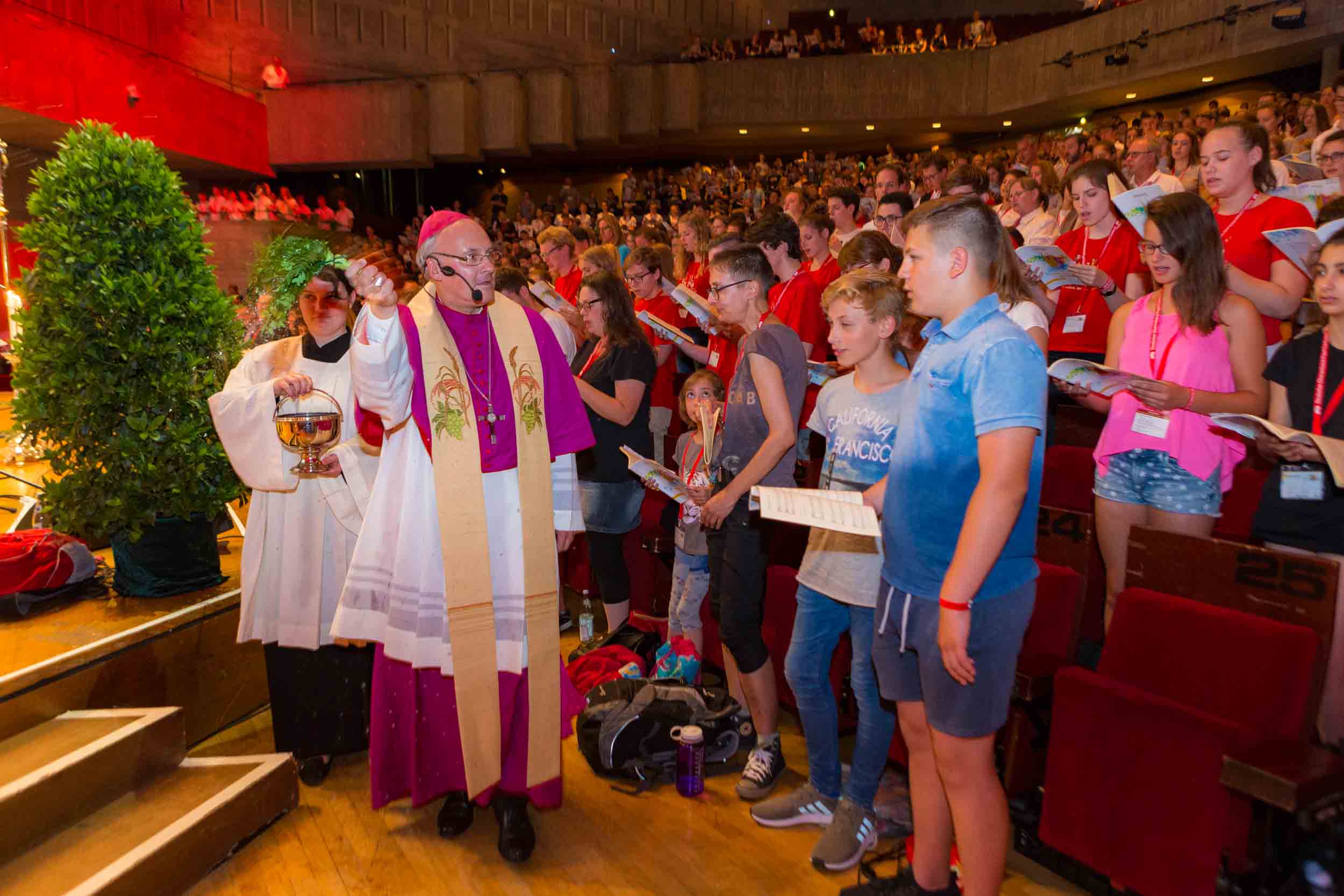 Nach der Segnung des Wassers, ging Bischof Rudolf durch den Saal und besprengte alle Jugendlichen damit, um an die einstige Taufe zu erinnern. Vor dem Abendlob hatte jeder der 46 Chöre die Gelegenheit, durch einen meist gesungenen „Schlachtruf“ sich den anderen Chören vorzustellen. Zusammen mit den Regensburger Domspatzen folgte ein Konzert des Vokalensembles „Singer Pur“, ein Zusammenschluss von ehemaligen Domspatzen sowie einer Sopranistin. Den Eröffnungsabend moderierte der Regensburger Sportreporter Armin Wolf.