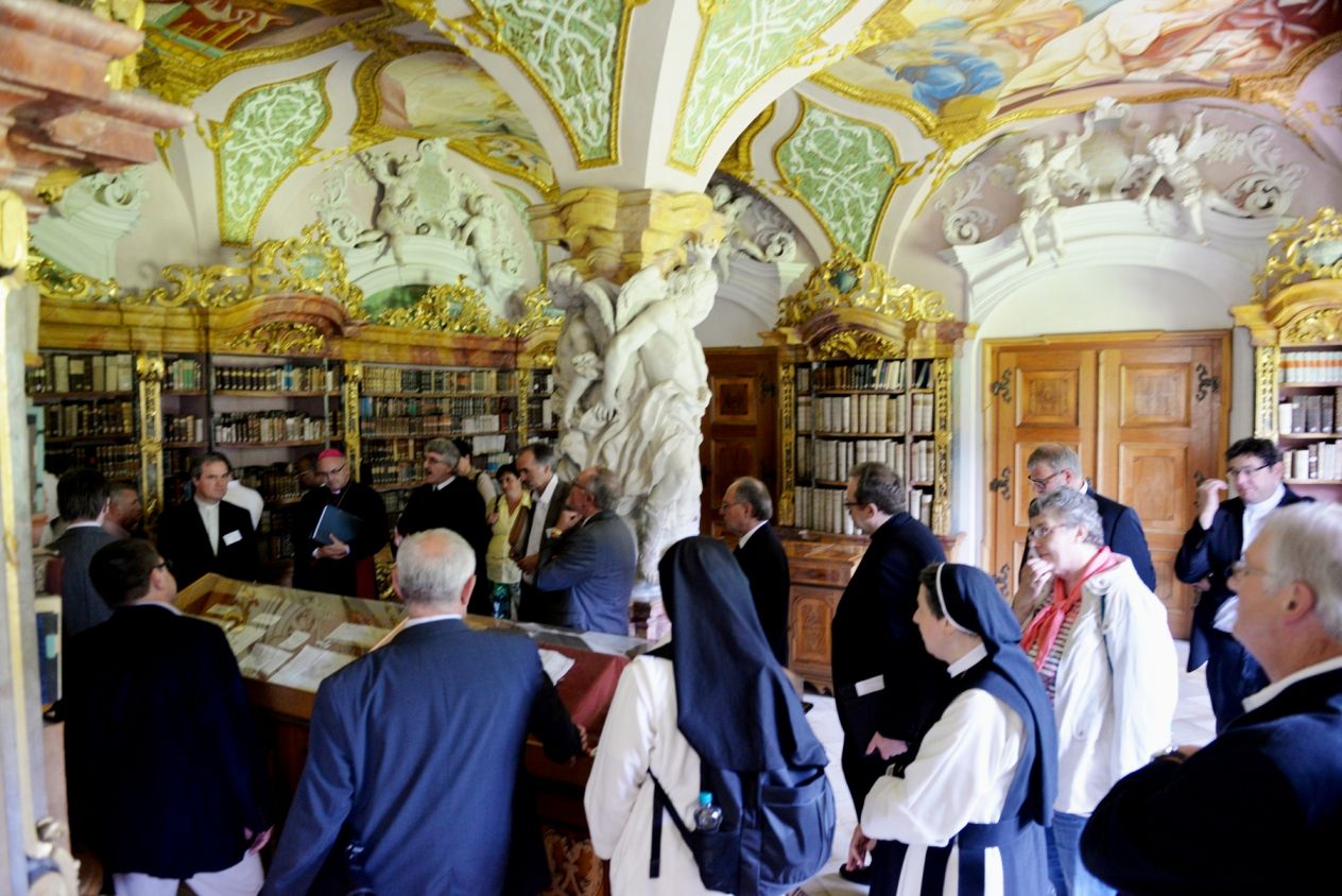 Staunend und interessiert ließen sich Bischof Rudolf, die Mitglieder von Priesterrat, Diözesankomitee und Diözesanpastoralrat Wissenswertes von der 1250 Jahre alten Geschichte des Kloster Mettens erzählen. Derzeit leben dort 14 Mönche. Hauptkern ist die schulische Bildung von 500 Schülern. Geführt wurden die Gäste durch die alte und neue Bibliothek und den Klostersaal. Die wunderbare Klosterkirche wird derzeit renoviert.