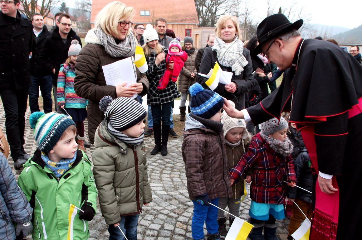 Am Sonntag, 12. Februar, waren ganze Scharen von Bürgern aus den Pfarreien Luhe, Oberwildenau und Neudorf auf den Beinen. Grund dafür war der Pastoralbesuch von Bischof Dr. Rudolf Voderholzer in Luhe. Schon um 9 Uhr herrschte reges Treiben im Umfeld der St. Martinskirche. Alle waren neugierig auf den Oberhirten aus Regensburg, der erstmals nach Luhe kam, um die Pfarrei und die Menschen kennen zu lernen. Pfarrer Arnold Pirner, im Januar 2017 zum Bischöflich Geistlicher Rat erhoben, übernahm beim Eintreffen des Gastes im Pfarrhof bei Minusgraden die Begrüßung, gemeinsam mit den Luher Kindergartenkindern, der Blaskapelle Oberwildenau, den politischen Vertretern und allen Vereinen, die ein stattliches Fahnenspalier bildeten.