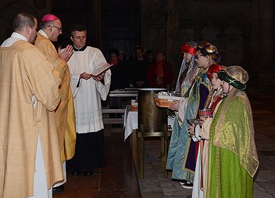 Am Hochfest der Erscheinung des Herrn (Epiphanie) zelebrierte Bischof Rudolf Voderholzer zusammen mit den Mitgliedern des Domkapitels im Hohen Dom St. Peter ein Pontifikalamt. Mehrere hundert Gläubige hatten sich am Heiligdreikönigtag in der Kathedrale eingefunden, um die Messe mit dem Bischof zu feiern. Stellvertretend für alle Sternsinger des Bistums Regensburg nahmen die Sternsinger der Dompfarrei an der Messe teil und sangen am Ende der Messe für die Gläubigen ihr Lied. Bischof Rudolf Voderholzer segnete traditionsgemäß Wasser, Kreide und Weihrauch. In seiner Predigt erklärte der Bischof, dass im Matthäus-Evangelium, das von dem Besuch der drei Weisen aus dem Morgenland an der Krippe Jesu Christi berichtet, die unterschiedliche Verwirklichung des Königtums dargestellt sei.