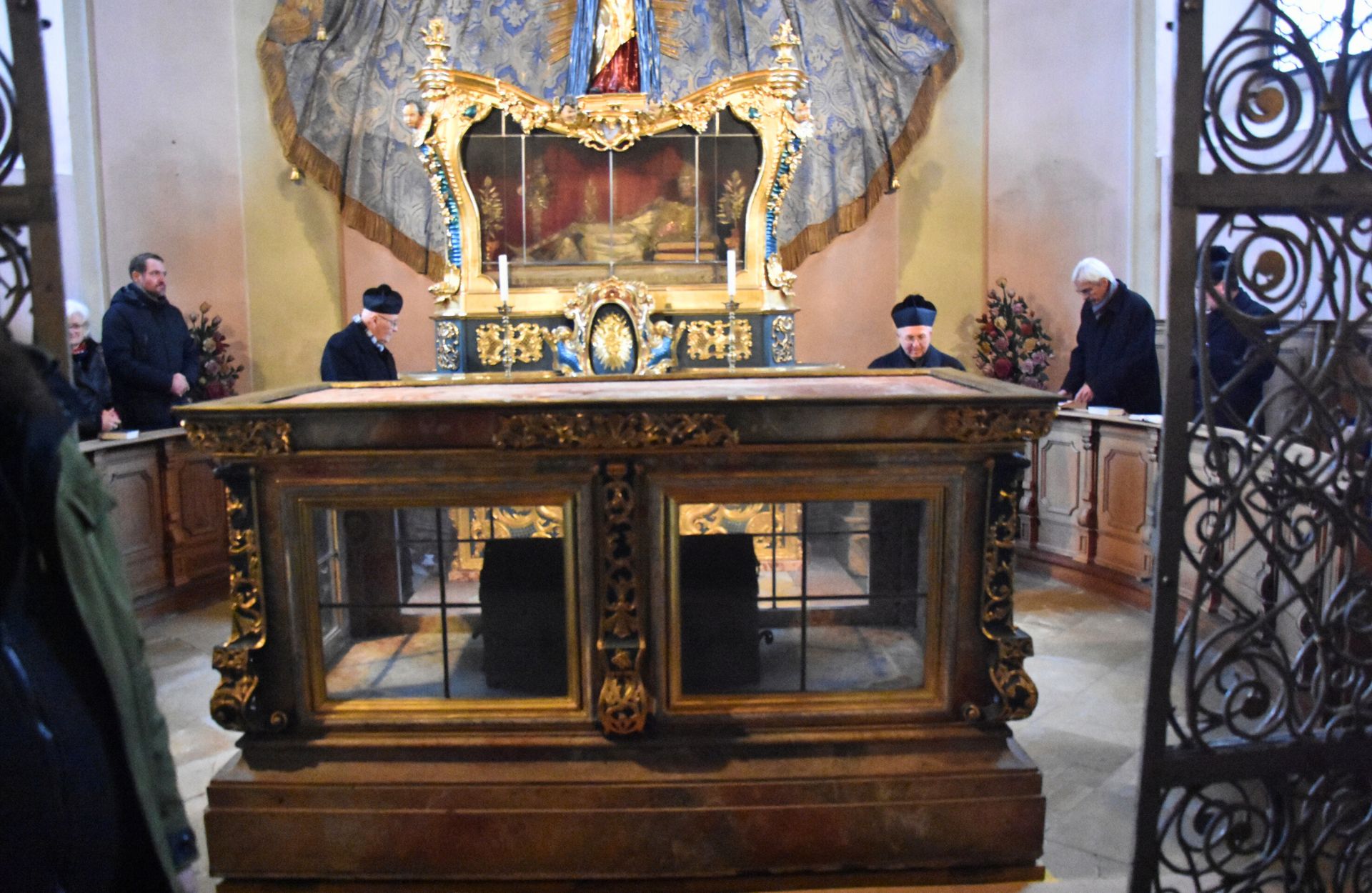 Wenn ein Heiligengrab geöffnet oder verändert wird, dann gibt es dafür genaue Vorschriften: Bischof Dr. Rudolf Voderholzer ernannte hierzu einen eigenen Gerichtshof, der entsprechend den Vorgaben der römischen Instruktion „Die Reliquien in der Kirche: Echtheit und Aufbewahrung“ die Maßnahme vornehmen sollte. Domvikar Msgr. Georg Schwager als Bischöflicher Delegat, Offizial Domkapitular Dr. Peter Stier als Glaubensanwalt und Bischöflicher Notar Lic. iur. can. Ulrich Kaiser waren dazu eigens aus Regensburg angereist. Auch Bürgermeisterin Andrea Probst aus Bogen und Vertreter der Pfarrei Oberalteich und des Freundeskreises „Albert von Oberalteich“ waren gekommen.
