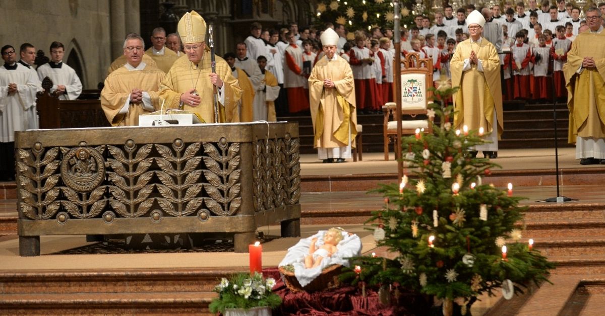"Und das Wort ist Fleisch geworden und hat unter uns gewohnt und wir haben seine Herrlichkeit geschaut, die Herrlichkeit des einzigen Sohnes vom Vater, voll Gnade und Wahrheit" zitierte der Bischof Vers 14 aus dem ersten Kapitel des Johannesevangelium zu Beginn seiner Predigt. Dies nenne ganz präzise das Weihnachtsgeschehen, die Menschwerdung Gottes in einem Stall, hineingelegt als hilfloses Kind in Windeln gewickelt. "Manche würden die Windel gerne fernhalten von Gott" stellte der Bischof fest. Anschließend nahm er seine Zuhörer mit auf die Entfaltung der dreifachen Gottesgeburt. Bei der "ewigen Geburt des Sohnes aus dem Vater" erinnerte er an das Schenken von Liebe, an die Vielfalt Gottes, an das "Jesus Christus ist aus dem Vater geboren" das später beim Credo von allen gesprochen wird und dass der Sohn eines Wesens mit dem Vater ist. Die zeitliche Geburt des Sohnes aus der Gottesmutter Maria zeige, dass sich Gott für uns Zeit nimmt. Der irdische Weg beginne im Stall von Bethlehem und führe zum Kreuz auf Golgotha. Hier werde eine Entscheidung beim Mitgehen von uns gefordert und Priorität sei die Anerkennung der Dreifaltigkeit. "Wer Weihnachten ernst nimmt, muss Christus bezeugen" betonte der Bischof und blickte auf die "Gottesgeburt in der Seele des Menschen". Mit seinen Worten ermunterte er Christus im Alltag zu bezeugen, auch gegenüber Andersgläubigen wie Muslimen oder Juden. so könne man missionarisch Kirche sein. Gabe und Aufgabe sei das hineingenommen sein in die Kirche. "Wäre Christus tausendmal in Bethlehem geboren, doch nicht in dir, du gingest ewiglich verloren" zitierte Bischof Rudolf den schlesischen Dichter Johannes Scheffler (auch als Angelus Silesius) bekannt und ermunterte zu einer persönlichen Gottesbeziehung. Bischof Rudolf blickte abschließend auf die geistliche Dimension mit einem weiteren Zitat von Angelus Silesius "Ich muss Maria sein und Gott aus mir gebären".