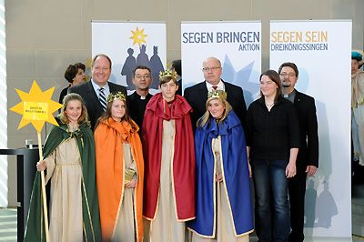 Passend zum Leitwort ihrer aktuellen Aktion, „Segen bringen, Segen sein. Hoffnung für Flüchtlingskinder in Malawi und weltweit!“, stellten die Sternsinger Nelia Mrosik (9), Charlotte Freyberg (10) und Josephine Freyberg (8) aus der katholischen Pfarrei Salvator in Berlin-Lichtenrade in einem kleinen Theaterstück die Situation von Flüchtlingskindern vor. Die Spende der Bundeskanzlerin durften diesmal die Mädchen und Jungen aus der Gemeinde St. Mariä Himmelfahrt in Wittichenau (Bistum Görlitz) entgegen nehmen. Felicitas Posch (13), Johanna Glaab (13), Benjamin (12) und Amadeus Domaschke (12) trugen der Kanzlerin auch den Segensspruch vor und schrieben den Segen „20*C+M+B+14“ für das Jahr 2014 im Kanzleramt an. Seit 1984 bringen die Sternsinger jedes Jahr ihren Segen „Christus mansionem benedicat – Christus segne dieses Haus“ ins Bundeskanzleramt. Bundeskanzlerin Angela Merkel hieß die Sternsinger auch beim 31. Empfang in Folge willkommen. Für die Regierungschefin war es der insgesamt neunte Besuch der Sternsinger.