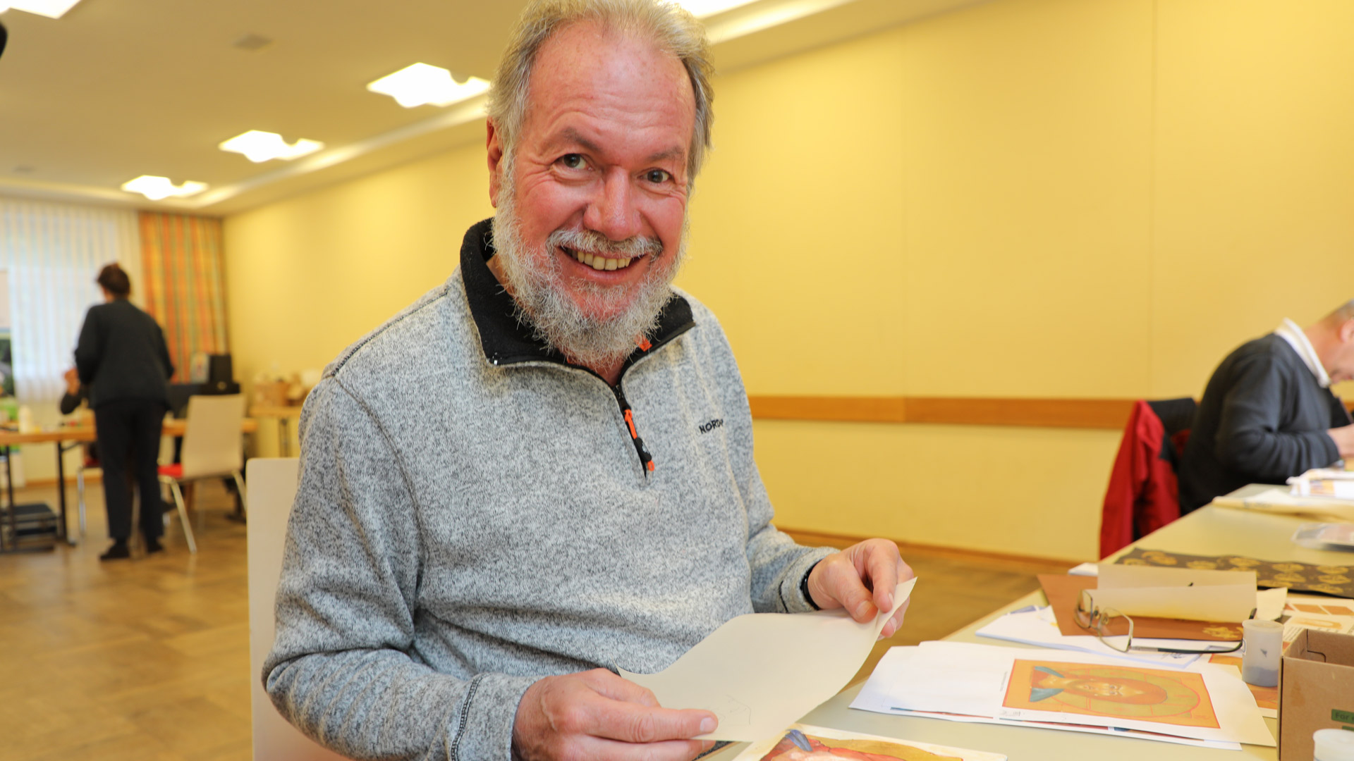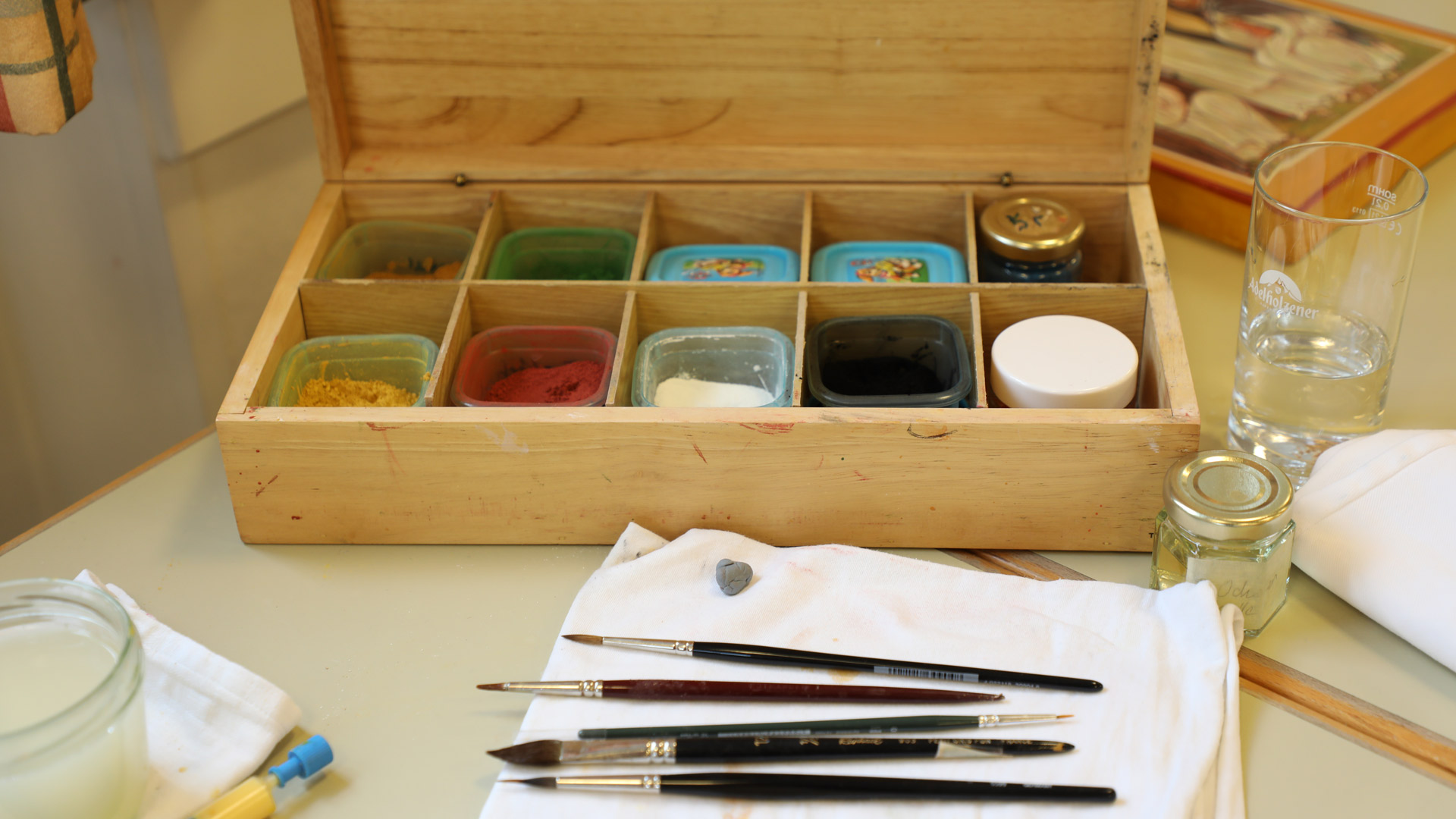 So begann auch seine Karriere als Ikonenmaler. Er hatte versucht, sich das Malen selbst beizubringen, suchte sich dann Unterstützung bei einem Lehrer. Den fand er an der russisch-orthodoxen St. Nikolaus-Kathedrale in Wien in einem Erzpriester. In dem jährlich stattfindenden Ikonenmalkurs gibt er seine jahrelange Erfahrung und sein Wissen weiter. Im Kurs geht es nicht allein um das Malen an sich. „Wir versuchen bei uns beim Kurs eine ruhige, meditative Stimmung hereinzubringen, weil Ikonenmalen ist nun mal etwas Meditatives“, erklärt Pfisterer. Das wirkt auch auf die Teilnehmer, einige kommen seit Jahren ins Haus Werdenfels, so wie Diakon Reinhold Lechinger. Er erklärt, dass er sich beim Malen nicht unterhalten kann und sich auf die Ikone konzentriert, was sich wie Exerzitien anfühle. Das Interesse an Ikonen hatte er schon immer. „Als ich wieder mal schwärmerisch eine angeschaut habe, hat meine Frau gesagt, das könnest du doch mal versuchen“, erzählt er. Letztes Jahr meldete er sich bei seinem ersten Ikonenmalkurs an. Entstanden ist eine Marienikone, in diesem Jahr arbeitet er an der Christusikone. Zwischenzeitlich habe er sich nicht getraut, allein zu malen, erklärt er, weshalb er dieses Jahr wieder am Kurs in Haus Werdenfels teilnehme. Derzeit übt er sich an den Gesichtern, die ihm schwerer fallen. Mehrere Skizzen und Vorzeichnungen hat er bereits angefertigt. Erst wenn Pfisterer seine Arbeit freigibt, trägt er das Gesicht auf die Holzplatte auf, erklärt Lechinger. Die Farbe mischt er selbst an. Dafür werden Eidotter und Wasser zu gleichen Teilen mit Farbpigmenten angerührt.