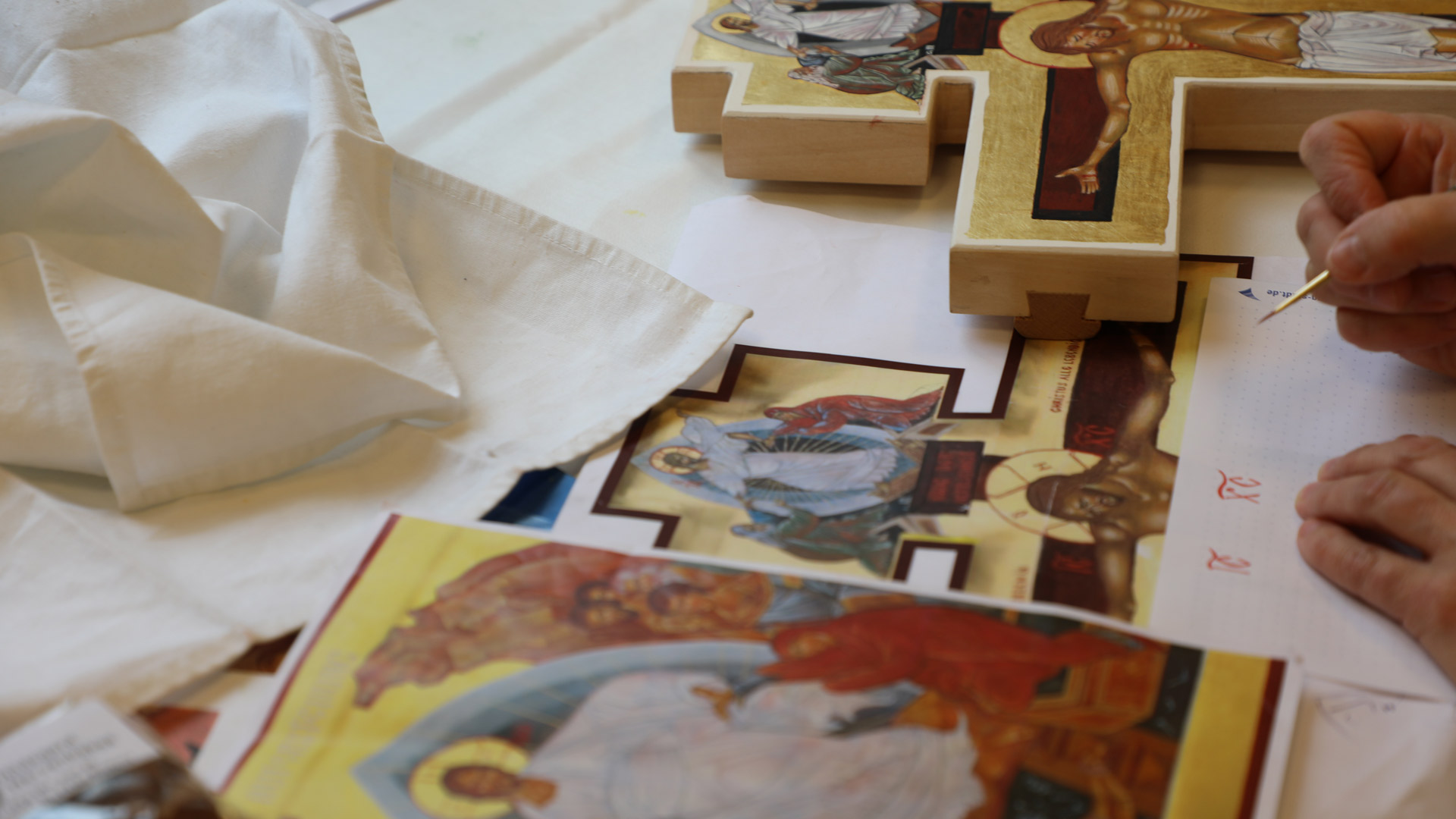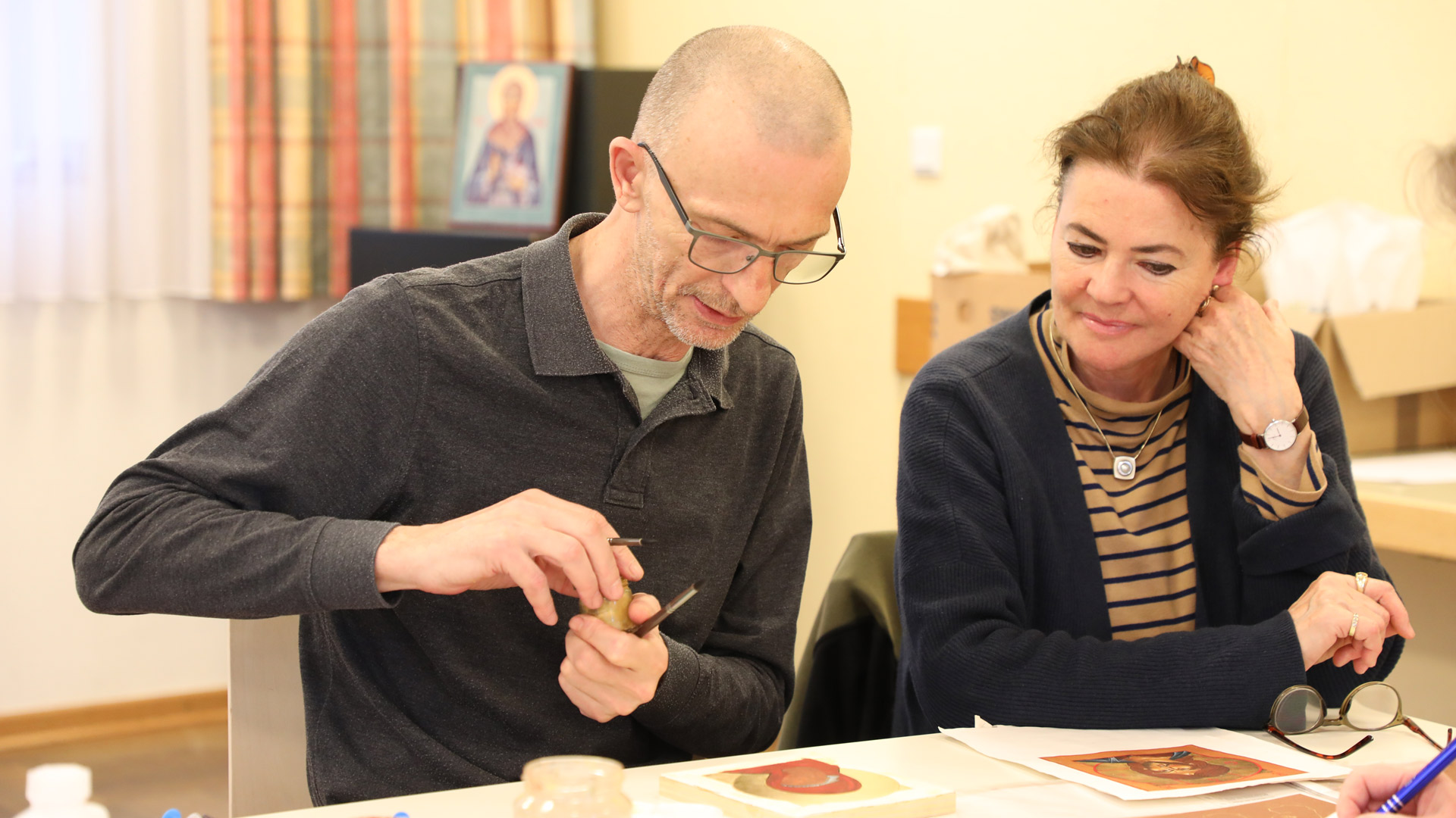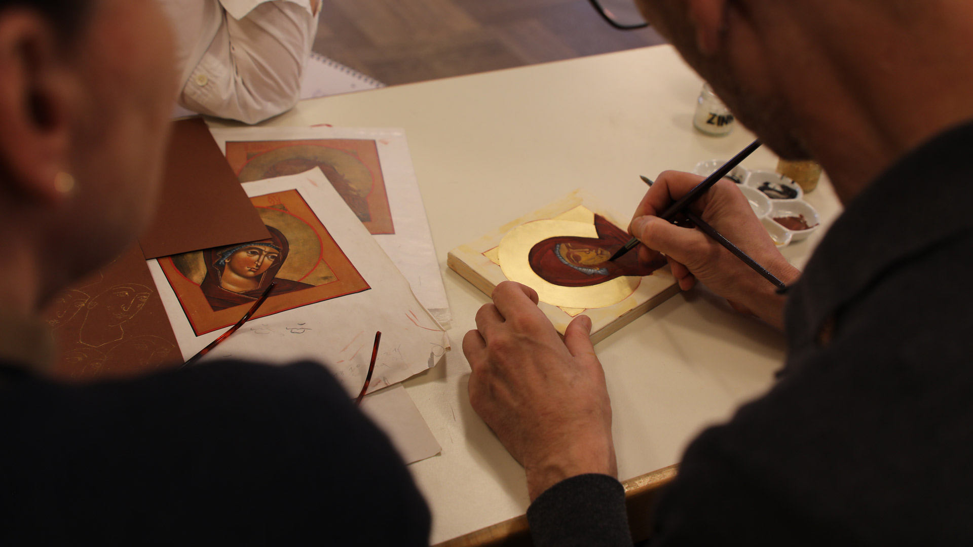 In einem großen lichtdurchfluteten Raum im Haus Werdenfels stehen vor den Fenstern Tische, an denen es sich die Kursteilnehmer mit ihren Utensilien bequem gemacht haben. Dort sind Farbpigmente, Vorskizzen, Pinsel und alles, was man zum Ikonenmalen braucht, verteilt. In andächtiger Stille sind die Teilnehmer über ihre Ikone gebeugt und setzen einen bedachten Strich nach dem anderen. Am Ende entsteht in der knappen Woche etwa eine Ikone. Gemalt werden in dem Kurs russisch-byzantinische Ikonen. „Man beschränkt sich auf das zweidimensionale Bild“, erklärt Leo Pfisterer, „weil man davon ausgeht, die dritte Dimension regt die Phantasie zu viel an.“ Die ostkirchliche Kunst wolle nicht kreativ sein, sondern vermitteln. „Wenn ich ein Buch lese, geht es auch nicht, den Inhalt zu interpretieren, sondern den Inhalt zu verstehen. Und ähnlich ist es dann in der Ikonenmalerei“, erklärt er. Die Kursteilnehmer kommen nicht nur aus religiösen Gründen, andere haben die farbenfrohen Werke im Urlaub gesehen und versuchen sich nun selbst an der Ikonenmalerei. Den Kurs kann jeder besuchen, betont Pfisterer, da es sich dabei um ein erlernbares Handwerk handelt, bei dem es bestimmte Vorgaben gibt. Künstlerische Fähigkeiten werden nicht benötigt. „Man lernt es durchs Tun, um das kommt man nicht herum“, stellt Pfisterer fest.