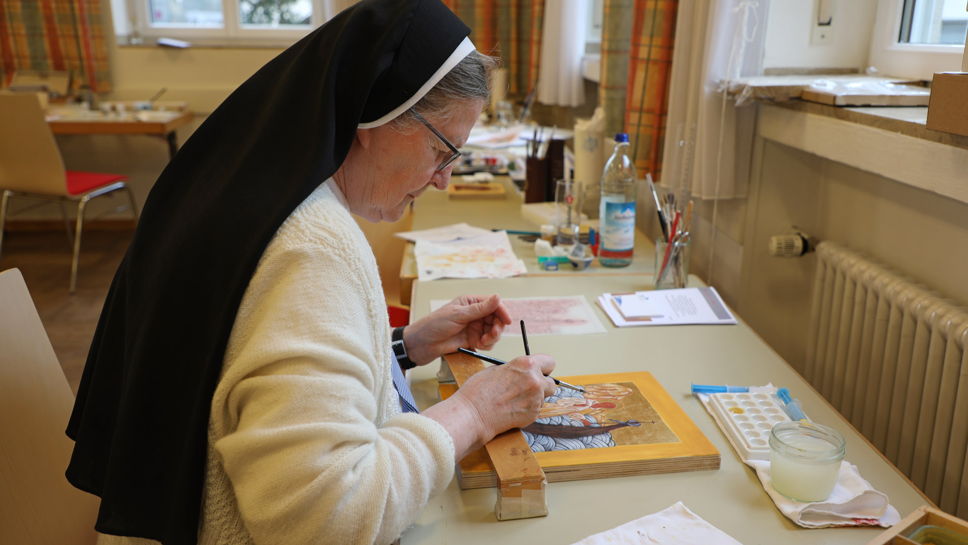 Schwester Priska ist bei ihrer Ikone einen Schritt weiter. Ihre Zeichnung und die ersten Lasuren hat sie schon auf der Holztafel aufgetragen. Gerade arbeitet die Dominikanerin aus einem österreichischen Kloster an einem Kleid, vom Dunkeln ins Helle, erklärt sie. Malen und Zeichnen, erzählt sie, habe sie sich selbst nie zugetraut. Mit der Ikonenmalerei fing sie aufgrund eines Kniebruches an. Durch den Bruch musste sie sich schonen und nahm bei einer Schwester an einem Kurs teil. Dieser blieb nicht der Einzige. Schwester Priska besuchte im Haus Werdenfels einen Lehrgang und verbrachte ihren Urlaub mit Ikonenmalen – etwa zehn Jahre sind seitdem vergangen. „Seither bin ich immer in Werdenfels, jedes Jahr, wenn es geht. Ich male auch zu Hause, wenn ich Zeit habe. Aber es ist immer gut, wenn man Feedback hat.“ Derzeit arbeitet sie an einer Ikone zu dem Dominikaner Raimund von Penyafort. Ikonen faszinieren sie, denn „man sagt, die Ikone sei das Fenster zum Himmel“ und sie spüre dort die Gegenwart Gottes. Die Bilder haben in ihrem Kloster einen Platz über ihrem Bett gefunden, erzählt sie, „wenn ich da hineinkomme, habe ich den Eindruck, ich komme in eine Kirche.“