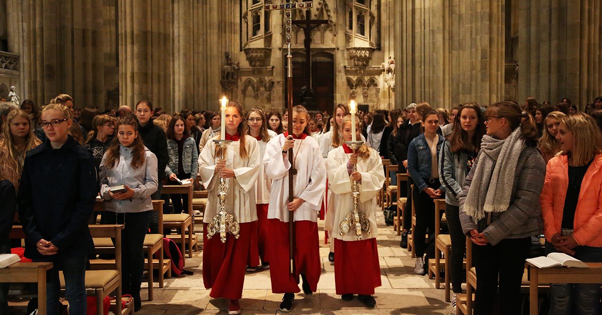 Bei der anschließenden Heiligen Messe ministrierten 58 Schülerinnen. Wegen dieser großen Zahl hatten sie ihre Gewänder jeweils von ihren Heimatpfarreien für diesen feierlichen Anlass ausgeliehen. Nun durften sie im Chorgestühl sitzen, wo normalerweise die Domkapitulare Platz nehmen. Nicht nur für sie war der Gottesdienst im Dom - dem "Zentrum unseres Bistums", wie Pater Philipp es ausdrückte - ein ganz besonderes Erlebnis. "Zuhause in Straubing müssen drei Gottesdienste hintereinander gefeiert werden, damit überhaupt alle Schülerinnen am Gottesdienst teilnehmen können. Hier in Regensburg hat ihre große Zahl den Dom fast bis auf den letzten Platz ausgefüllt."
