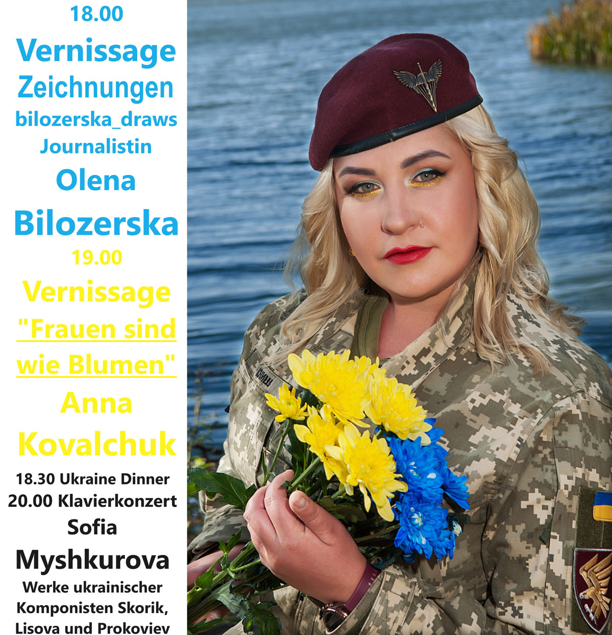 19 Uhr, Vernissage der Fotoausstellung von Anna Kovalchuk „Frauen sind wie Blumen“ . Die Künstlerin ist Mitglied der ukrainischen Gesellschaft für Fotografie. Gezeigt werden 21 Potraits von Soldatenwitwen.