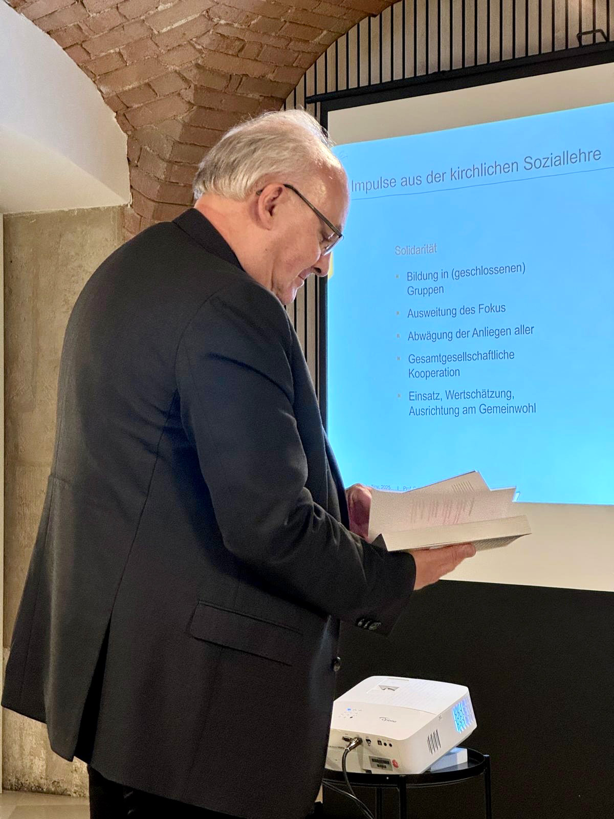 Als kurzfristiger Ersatz für den erkrankten Kollegen Prof. Dr. Clemens Breuer übernahm Prof. Dr. Jochen Ostheimer (Lehrstuhl für Christliche Sozialethik an der Universität Augsburg) das Wort. In seinem Vortrag „Im Vertrauen – Überlegungen zum Umgang mit gesellschaftlichen Konflikten“ rückte er das Thema Vertrauen in den Mittelpunkt. Ostheimer betonte, dass gerade in unserer Zeit, in der Misstrauen, Entfremdung und Enttäuschung weit verbreitet sind (nicht zuletzt durch eigene kirchliche Versäumnisse wie Missbrauchsskandale) bewusst für eine andere Haltung entschieden werden müsse. Vertrauen sei kein naiver Optimismus, sondern eine ethisch verantwortete Grundhaltung: Die Bereitschaft, anders Denkenden mit Respekt und Offenheit zu begegnen, sich der Realität zu stellen und Verantwortung zu übernehmen. Gerade für die Kirche habe dieser Ansatz existenzielle Bedeutung als Gegenmodell zu Misstrauen, Entfremdung und gesellschaftlicher Entsolidarisierung.