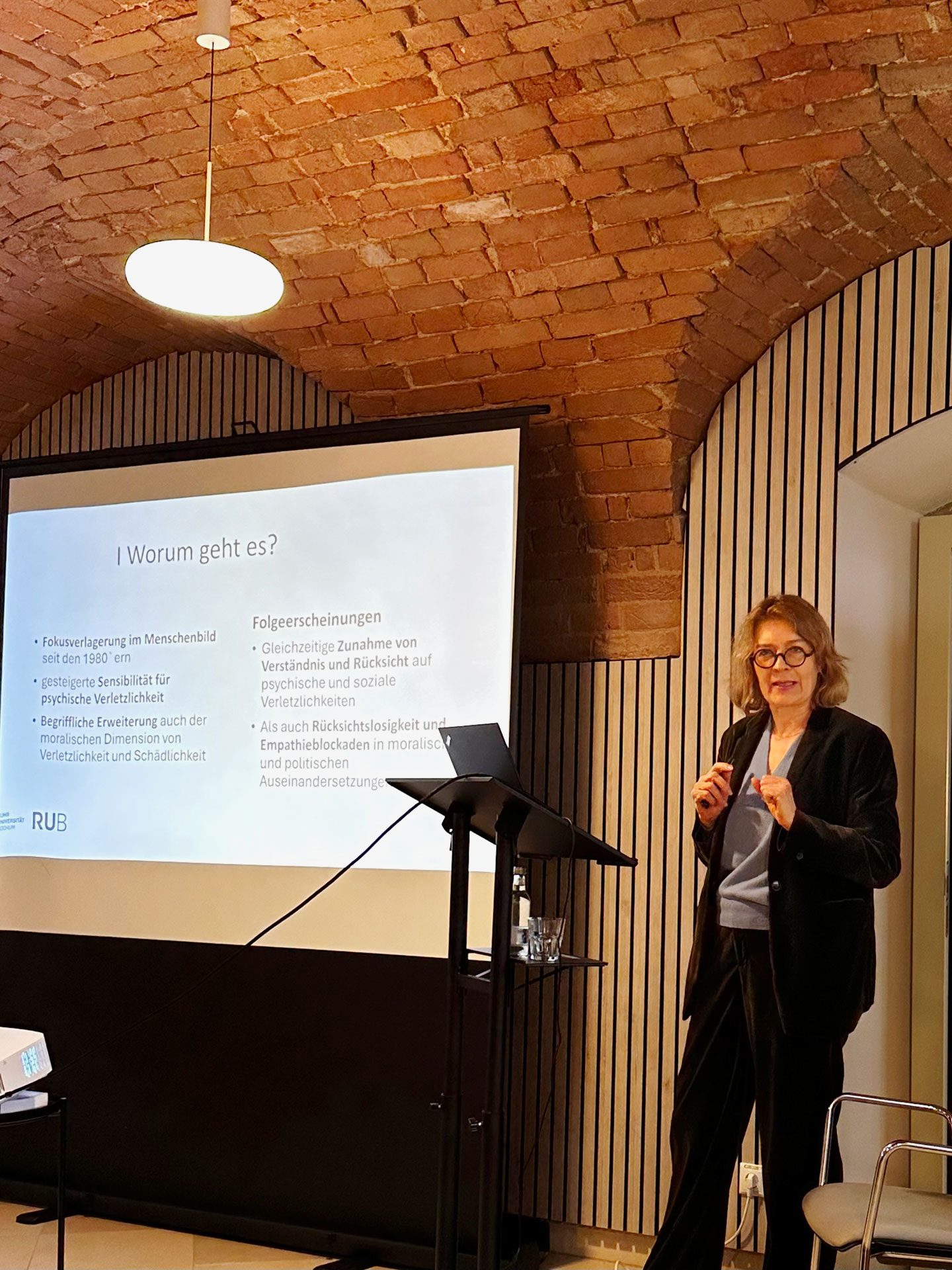 Im ersten Fachvortrag analysierte Prof. Dr. Maria-Sibylla Lotter (Lehrstuhl für Praktische Philosophie an der Ruhr-Universität Bochum) die Gefahren einer zunehmend inflationären „Victim-Culture“. Lotter machte deutlich, wie eine überbetonte Aufmerksamkeit für subjektive Verletzlichkeit oder individuelle Betroffenheit zwar gute Impulse für Solidarität geben könne, gleichzeitig aber dazu führe, gesellschaftliche Debatten zu polarisieren. Besonders kritisch beleuchtete sie die Tendenz, Konzepte wie etwa den Trauma- oder Gewaltbegriff über die eigentliche Bedeutung hinaus zu erweitern und so letztlich auszuhöhlen. Ebenfalls warnte sie von der Gefahr, real existente gesellschaftliche Herausforderungen, zum Beispiel Ungleichheit, Machtmissbrauch oder strukturelle Konflikte, zunehmend mit persönlicher Betroffenheit oder gar ursprünglich literaturwissenschaftlich inspirierten und damit abstrakten Narrativen zu erklären, die die Realität nur schwer abbilden könnten, und weiter zu einer Entkoppelung von realen Sachverhalten und diskursiver Verhandlung führten. Solche Verschiebungen, so ihr Argument, mündeten nicht selten in einer Verwischung von Begrifflichkeiten, was wiederum die Klarheit gemeinsamer Debatten gefährde. Lotter plädierte daher für eine Sprache der Differenzierung und Präzision als Beitrag zu gesellschaftlicher Versachlichung und gegenseitigem Respekt.