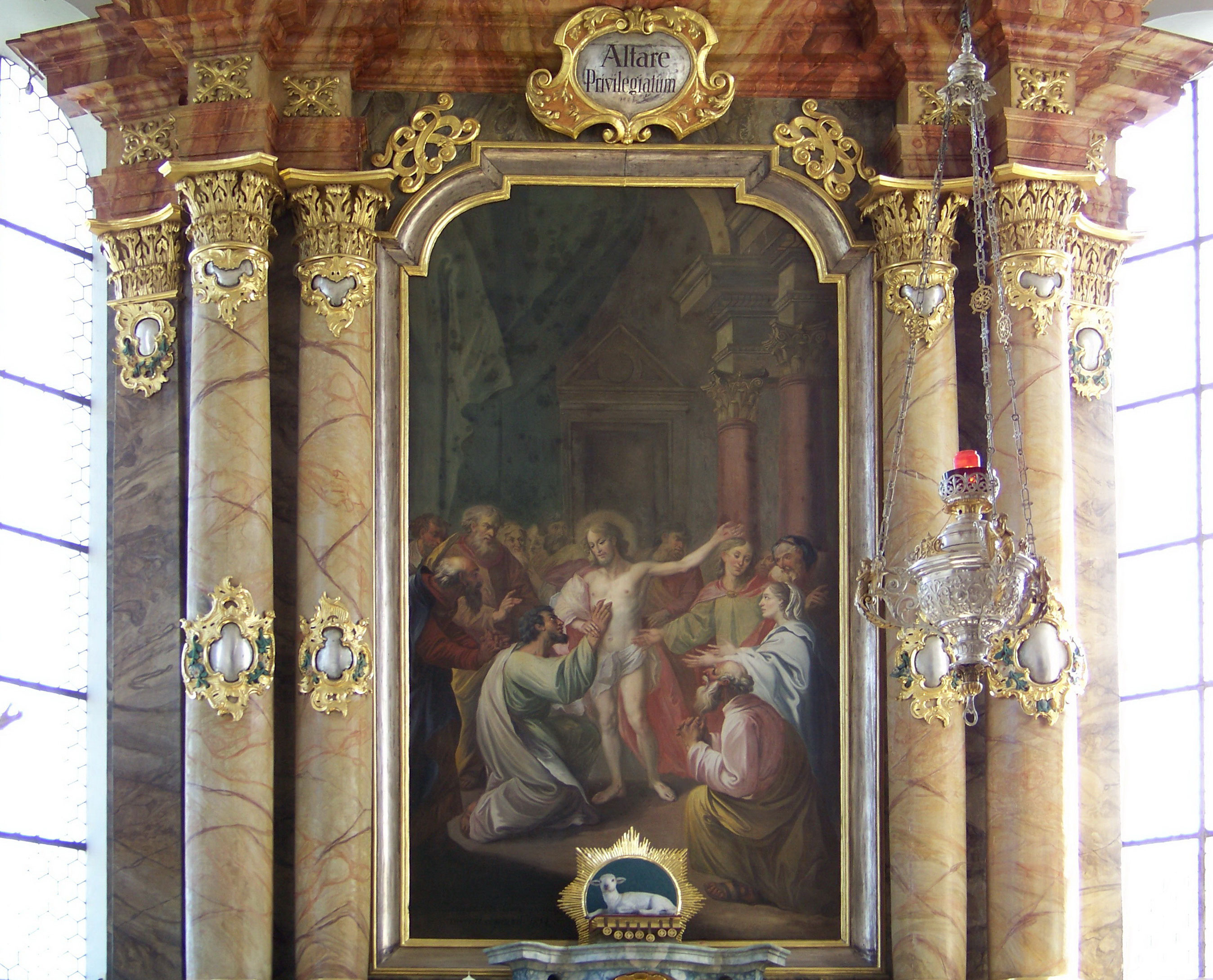 Im Jahr 1722 errichtete der Schreiner Veit Cranzberger den Hochaltar. Dieser wird von zwei in der Tiefe gestaffelten Säulenpaaren und zwei Pilastern getragen. Über der Mensa steht der Tabernakel, den zwei Anbetungsengel flankieren. Im darüber befindlichen Altarblatt, das von Clemens della Croce geschaffen wurde, ist Kirchenpatron Thomas inmitten der Apostel dargestellt. Zudem ist eine Frau im Büßergewand zu sehen, bei der es sich vermutlich um Maria Magdalena handelt. Den versammelten Aposteln erscheint der auferstandene Jesus Christus. Thomas, der zunächst an der Auferstehung gezweifelt hatte, greift auf dem Bild kräftig zu und legt seine Hand in die Wunde. In der biblischen Erzählung folgt das Glaubensbekenntnis des Apostels: „Mein Herr und mein Gott!“ Im Auszug ist eine Reliefdarstellung von Gott Vater auf Wolken zu sehen. Diese Darstellung wird gerahmt von zwei schneckenförmigen Ornamenten, die man auch als Voluten bezeichnet. Auf diesen sitzt hier je ein Engel.