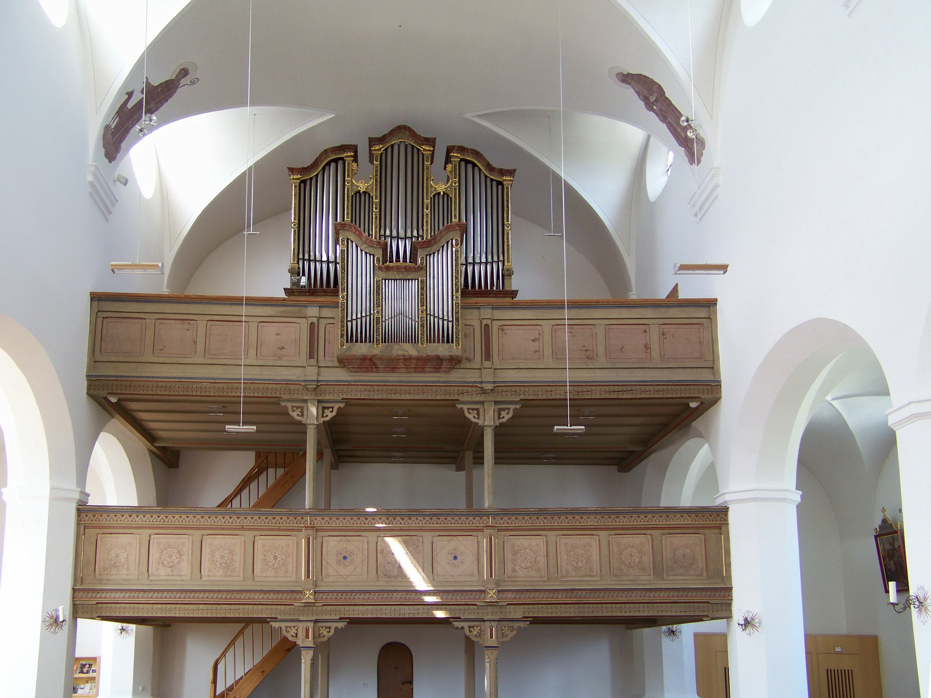 Das Hauptschiff wird, wie man im Innenraum sieht, von einem Flachtonnengewölbe überspannt. Stichkappen schneiden in das Gewölbe, welches als Schalgewölbe ausgeführt ist, quer zur Ost-West-Ausrichtung der Kirche. Ein Schalgewölbe ist eine Bauweise, bei der einzelne Steine so aufeinander abgestützt werden, dass sie die Last der Decke tragen können. Diese Bauausführung war eine wichtige Technik in der frühen mittelalterlichen Architektur. In den Stichkappen finden sich kleine, querovale Fenster, die das Mittelschiff beleuchten. Von außen entsteht so der Eindruck eines Obergarden. Das Gewölbe des Chorraums ruht auf gefasten Pilastern. Im Mittelschiff liegt es auf Gesimsstücken. Die Seitenschiffe der Kirche werden ebenfalls von Stichkappentonnen überwölbt. Hier sind deutlich größere Rechteckfenster mit Rundbögen eingesetzt. Im westlichen Langhausjoch wurde im Jahr 1764 eine hölzerne Doppelempore eingezogen. Beide Geschosse umfassen die Breite des Mittelschiffs. Im oberen Geschoss ist die Orgel untergebracht. Ein Brüstungspositiv hängt hier vor der Empore.