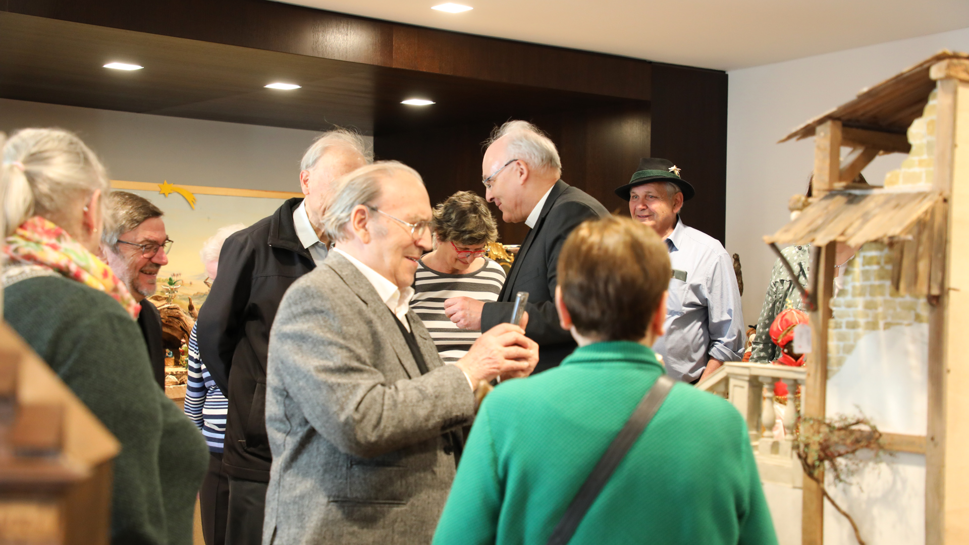 Zu jeder Krippe kann der Regensburger Oberhirte etwas erzählen, von den kunstvollen Werken war auch die Besuchergruppe sichtlich beeindruckt. Die Krippe von Sebastian Osterrieder beispielsweise sei „das schönste, was die bayrische Krippenkunst bisher zu Wege gebracht hat“, erklärt Bischof Rudolf. Osterrieder hat eine spezielle Fertigungstechnik entwickelt, die ihm ein serielleres Herstellen und Vertreiben von Krippen ermöglichte.