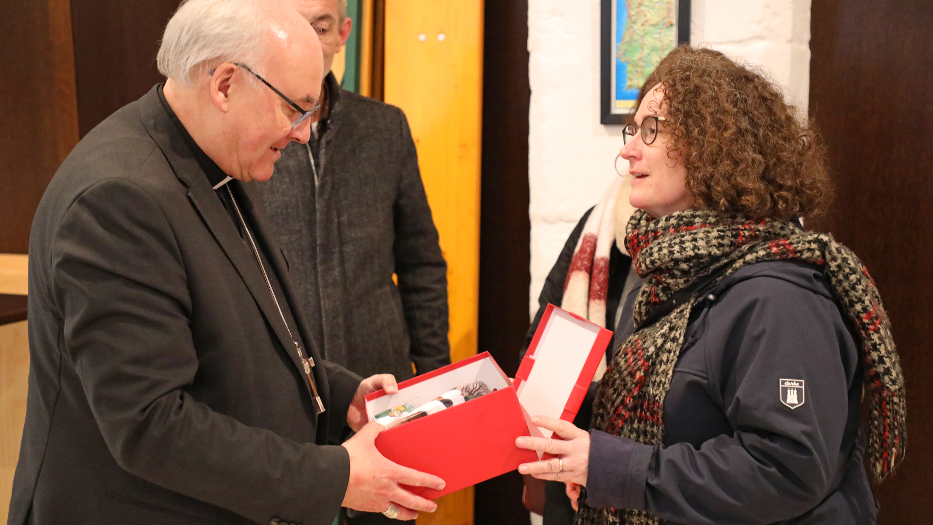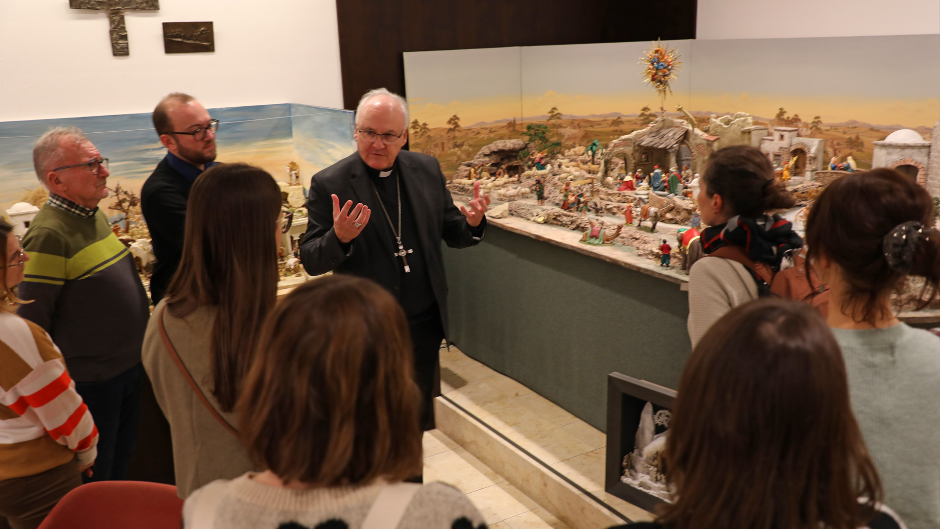 Zusammen mit Christa Haubelt-Schlosser, Fachstellenleiterin für Religiöse Volkskunst im Bistum Regensburg, führte Bischof Rudolf die krippeninteressierten Lehrkräfte durch die Krippensammlung des Bistums und zeigte ihnen auch hier die unglaubliche Vielfalt in der Darstellung der Geburt Christi. Vielfältig sind hierbei nicht nur die Details in der Darstellung, etwa ob es sich um eine orientalische oder eine Heimatkrippe handelt, sondern vor allem die grundsätzlich unterschiedlichen Herangehensweisen. Von der einteiligen Kuppelkrippe aus Metall bis hin zur winzig kleinen, in einen Kirschkern hineingeschnitzten Krippenszene, waren die Lehrerinnen und Lehrer aus Roding fasziniert vom Einfallsreichtum der Krippenbauer aus aller Welt.