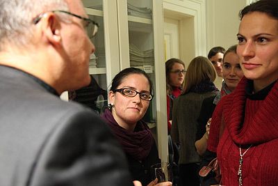 Bei Brezen und Wein bestand im Verlauf des Abends weiterhin die Möglichkeit zur Begegnung. Zahlreiche Studierende waren interessiert an den Ansichten des Bischofs und kamen gerne mit ihm persönlich ins Gespräch, so auch die Theologiestudentin Regina Riedl. Sie zeigte sich positiv überrascht vom Regensburger Bischof, der sehr offen und persönlich auf die Fragen der Studierenden einging.