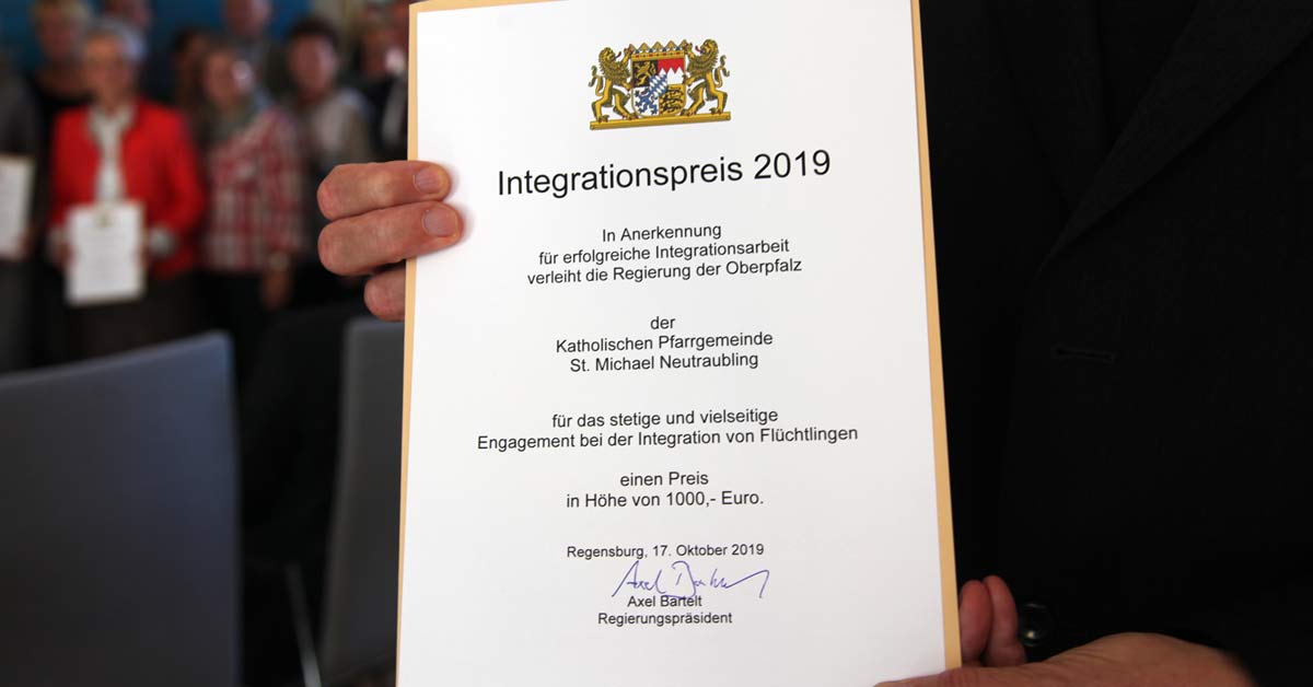 Für ihr großartiges Engagement im Bereich der Integration wurde am vergangenen Donnerstag die Katholische Pfarrgemeinde St. Michael Neutraubling mit dem zweiten Preis des "Integrationspreises der Regierung der Oberpfalz 2019" geehrt. Der Preis ist mit 1.000 Euro dotiert.