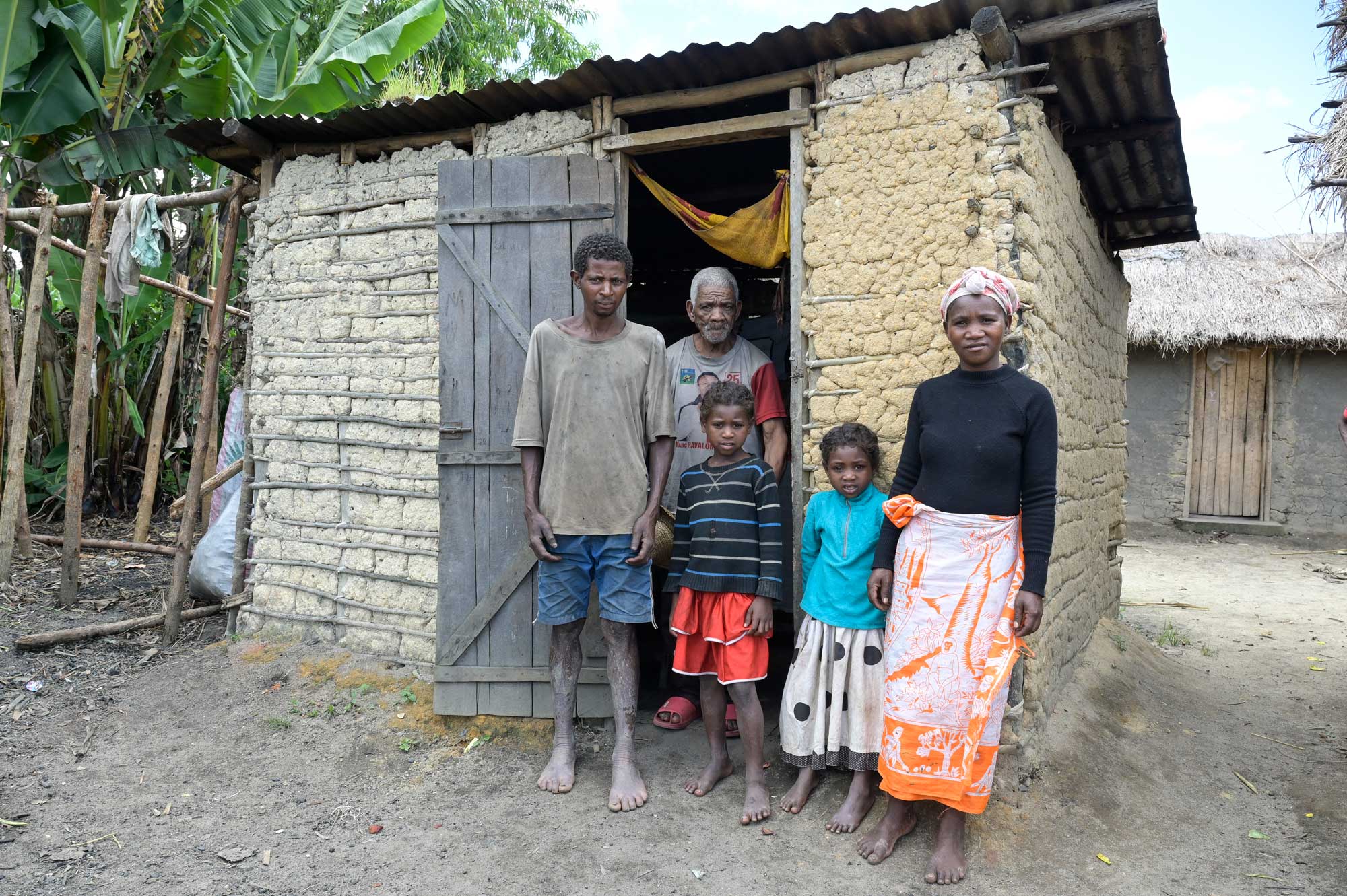 „Die meisten Familien haben kaum Geld. Für sie ist schon der geringe Betrag von gut zwei Dollar pro Kind und Monat für den Besuch der Grundschule zu viel“, sagt Jeanne Mericia. Aber Lehrer wollen bezahlt und Bücher und Mobiliar muss angeschafft werden. „Schulgebühren sind Pflicht“, sagt die Schulleiterin. Sie seien nötig, aber auch symbolisch wichtig, um allen zu zeigen, dass jeder seinen Beitrag leisten müsse. Heute geht Jeanne Mericia zu den Eltern von Santatra und Shania. Père Rochel ist dabei. Er kennt die Familie gut. Sie gehört der katholischen Gemeinde in Ambodiriana an und wohnen in einem kleinen Weiler aus gut 15 Hütten, etwa eine gute halbe Stunde Fußweg entlang eines Bachs. „Die meisten Familien fällen Bäume, um Holzkohle zu gewinnen. Damit bezahlen sie“, erklärt Père Rochel. „Einige haben auch ein Reisfeld und können übrigen Reis auf dem Markt verkaufen. Aber für die Schule bleibt als letztes etwas übrig.“ Er sagt: „Natürlich wollen wir nicht, dass auch nur ein Kind nicht mehr zur Schule gehen kann.“ Aus der kleinen Hütte tritt Marie Rananairana. Sie freut sich über den Besuch.