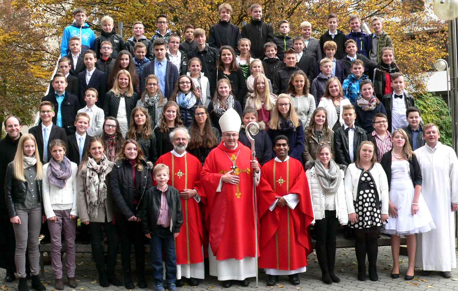 Vieles also wird für die Kinder erst einmal nach bestem Wissen und Gewissen vorentschieden. Eure Eltern haben damals gesagt, uns ist der Glaube, die Zugehörigkeit zu Jesus Christus so wichtig, wir wollen, dass unser Kind hineinwächst in die Kirche. Aufrichtigen Dank, dass Sie diese Entscheidung für ihre Kinder getroffen haben“! Bevor der Bischof zum Akt der Firmspendung schritt sagte er: „Jetzt wird es ernst, wenn wir gemeinsam unseren Glauben bekennen und ich bitte euch den Glauben laut zu bekennen“. Während des Glockenrufs wurde in Stille das Kommen des Heiligen Geistes erfleht. Sodann sprach der Bischof zum ersten Firmling: „Andreas, sei besiegelt durch die Gabe Gottes den Heiligen Geist. Der Friede sei mit dir“. Dabei salbte er ihn mit Chrisam und legte ihm die Hand auf.