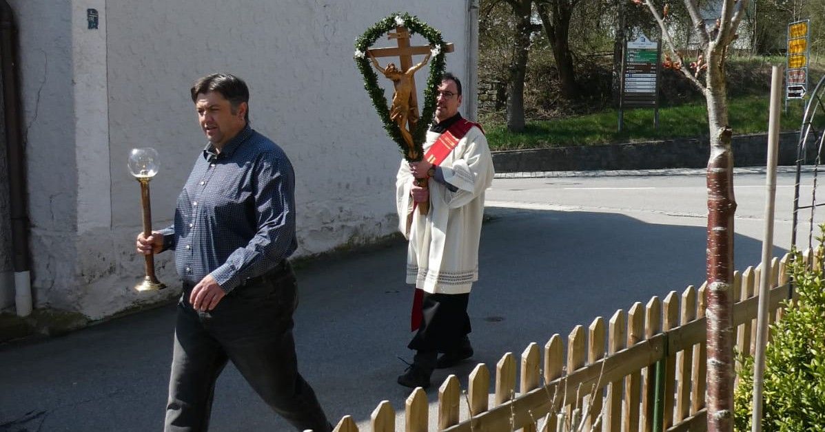 In den Vormittagstunden ging es in Harrling los. Dort wurde er vom Mesner Lorenz Eisenreich, Ludwig Holzapfel, Willi Wildfeuer und dem Ehepaar Aumer, welche alle den nötigen Sicherheitsabstand einhielten, begleitet. Mit den Klängen der Karfreitagsratsche machte sich die kleine Gruppe bemerkbar, sodass die Leute wissen konnten, dass man in ihre Nähe kam.