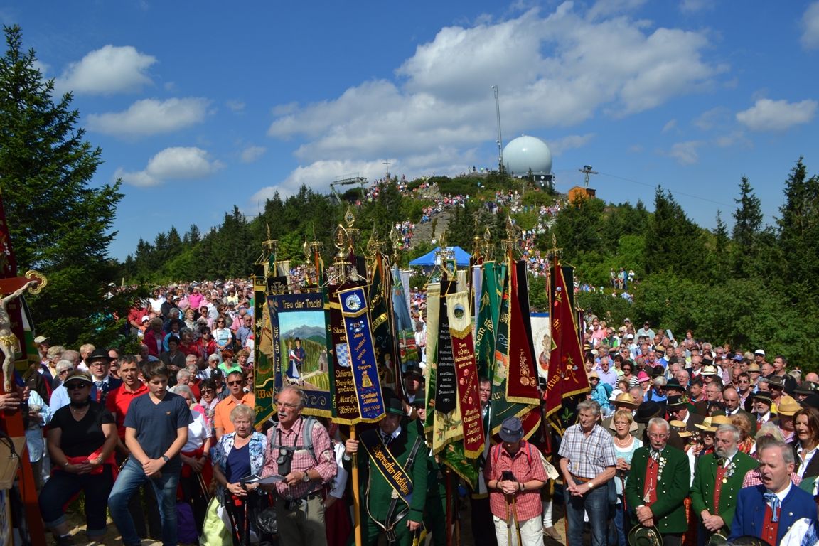 Bei strahlendem Sonnenschein und sommerlichen Temperaturen waren die Pilger, darunter viele Trachtengruppen, Bergwachtler, Waldvereinssektionen mit Fahnen und unzählige Wallfahrer, von allen Seiten herbeigeströmt: Die einen waren als Wanderer stundenlang unterwegs, die anderen waren mit der Arberbergbahn nah ans Ziel des Arberplateaus zur Feier der Heiligen Messe gebracht worden. Auch Bischof Rudolf erklomm den letzten Teil des Gipfels bis zur Arberkirche gemeinsam mit Pfarrer Dr. Dr. Emeka Ndukaihe, Staatsminister Helmut Brunner und dem Geschäftsführer der Bergbahn Thomas Liebl zu Fuß und nutzte dabei die Gelegenheit zu einem herzlichen "Grüß Gott" für und mit den Pilgern.