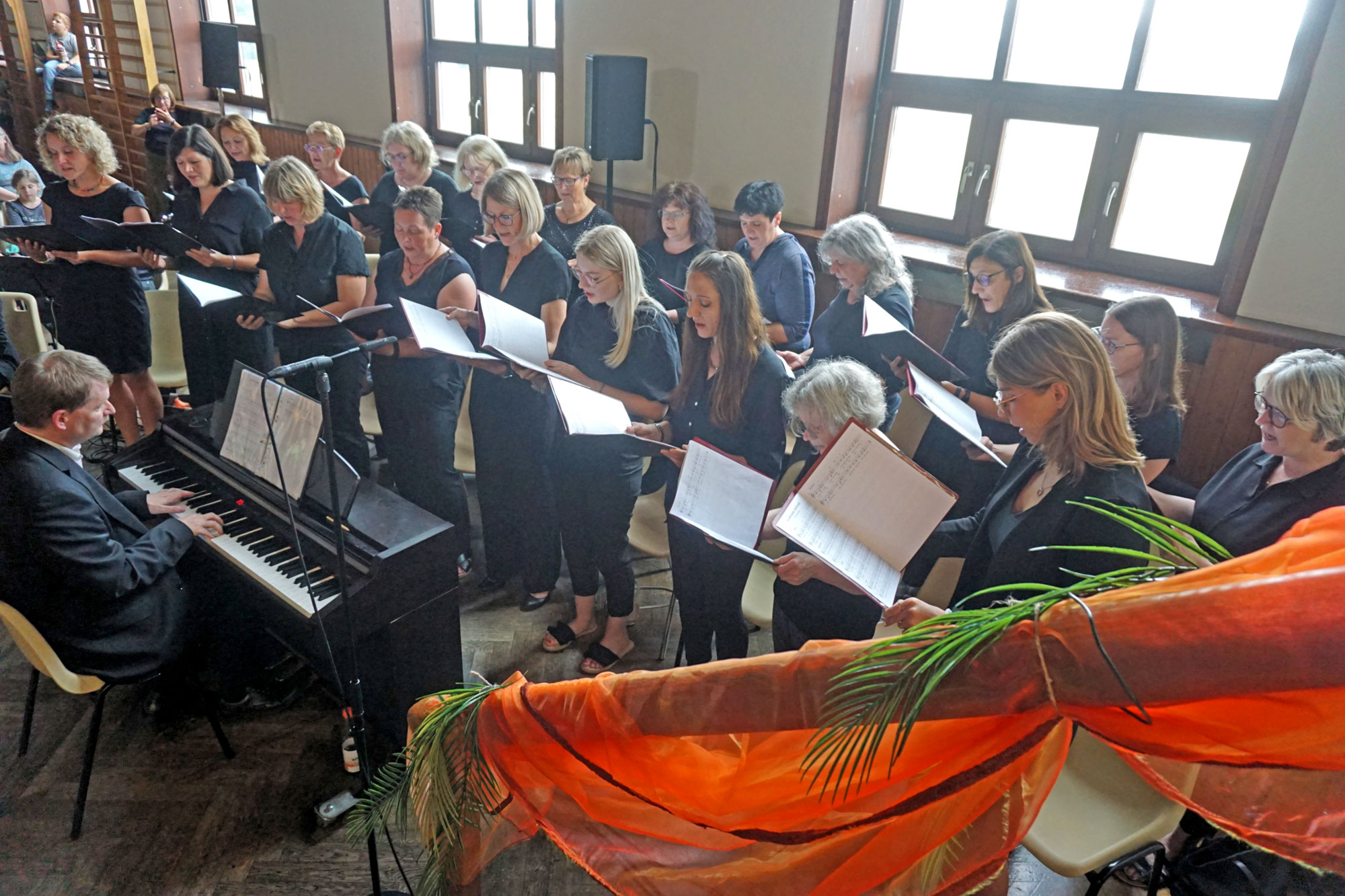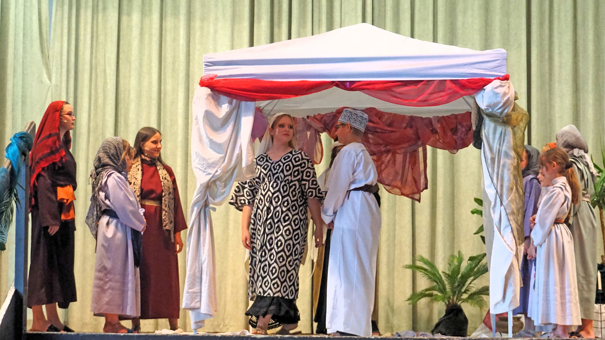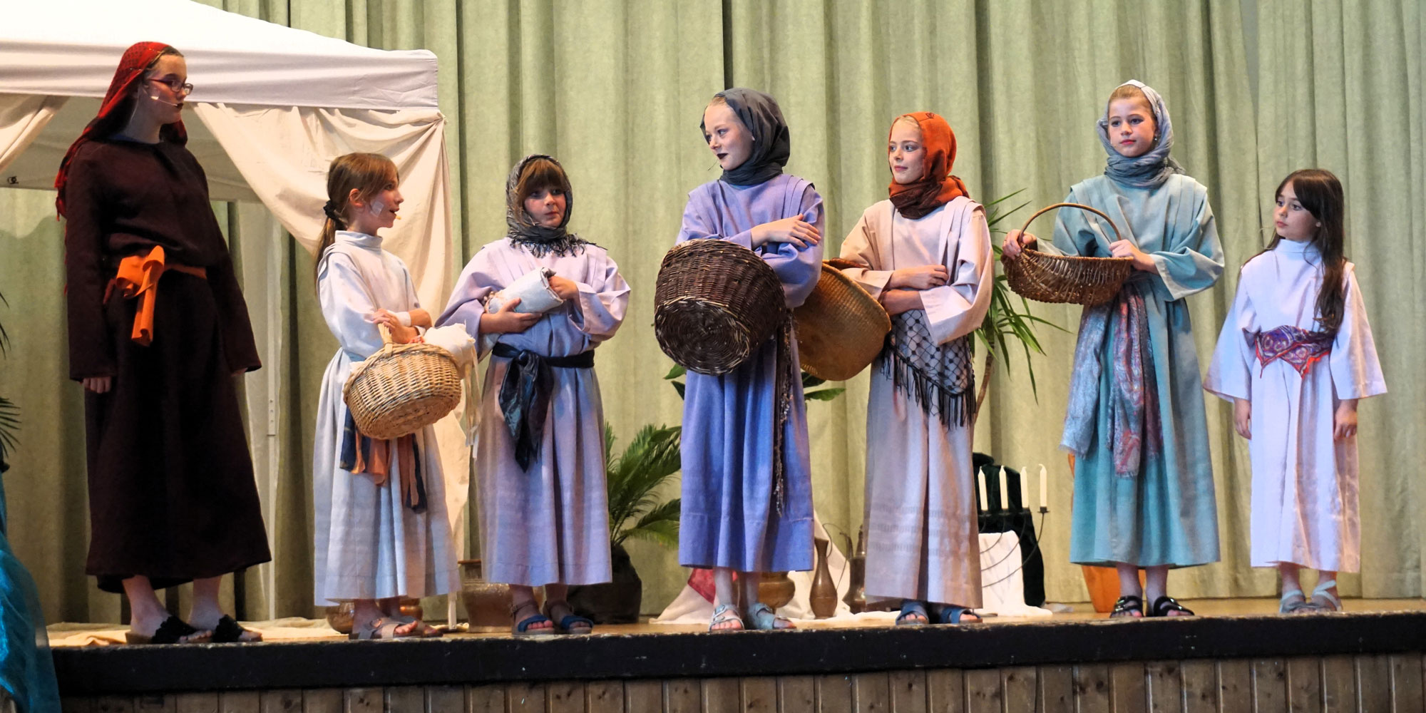 An einigen Stellen ging Gertrud Hankl über den überlieferten Text hinaus. So erzählte sie auf der Bühne auch aus der Kindheit Deborahs. Schon als junges Mädchen zog sie mit einer Karawane mit, um sich vor dem Stadtkönig Sisera zu verstecken, der sie von ihrem Vater, dem Gerber Tenach, einforderte. Immer wieder trat eine Gruppe von Frauen und Kindern auf, die die Geschehnisse kommentierte und dem Publikum näher erläuterte. Andreas Sagstetter komponierte zu den insgesamt neun Liedtexten ansprechende und einfühlsame Melodien. Er verriet, dass er beim Komponieren zunächst die Stimmung der jeweiligen Szene auf sich wirken lasse: „Dann fällt mir schnell eine Melodie ein. An diesem Rohgerüst gilt es dann zu feilen.“ Bei den Aufführungen unterstützte der Kirchenmusikdirektor auf dem E-Piano zusammen mit dem neuen rhythmischen Chor der Pfarrei die Kinder und Jugendlichen beim Gesang. Damit die Zuschauer sich in die Zeit vor etwa 3.000 Jahren gut einfühlen konnten, kleidete das Familiengottesdienstteam die Schauspielerinnen und Schauspieler passend ein. Die einzelnen Szenenbilder waren orientalisch gestaltet, jede Situation bekam ihr eigenes Outfit. Und in einigen Umbaupausen entführte die Bauchtanzgruppe des Turnvereins unter der Leitung von Gabi Stich in die längst vergangene Zeit.
