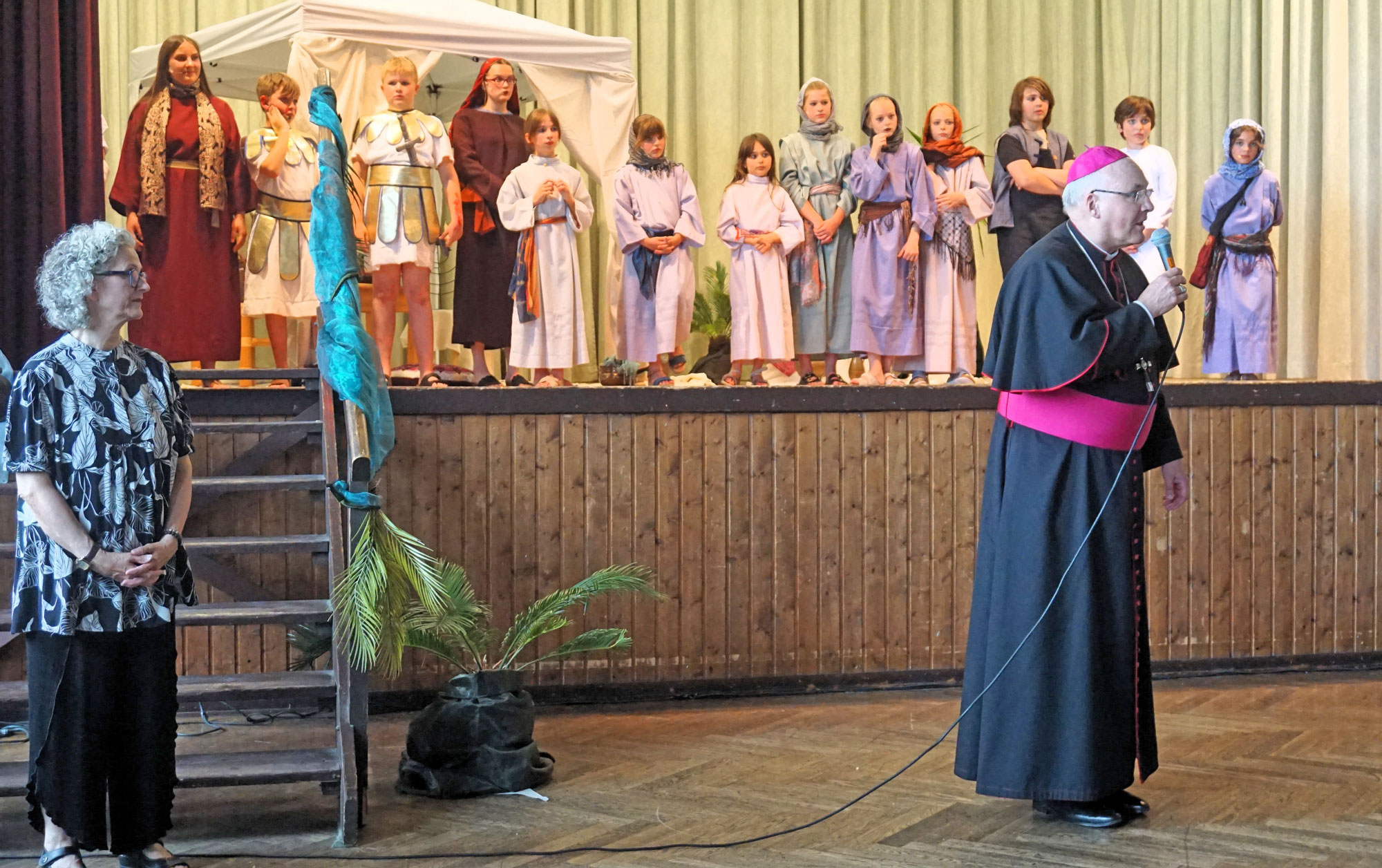 Das Publikum belohnte die Darstellerinnen und Darsteller, aber auch alle weiteren Beteiligten vor und hinter der Bühne mit langanhaltendem Applaus. Sie waren ebenso wie Gertrud Hankl mit der Leistung der Kinder und der Aufführung sehr zufrieden. Bischof Rudolf Voderholzer bedankte sich und gratulierte allen Mitwirkenden. Zur Autorin und Gesamtleiterin Gertrud Hankl sagte er: „Die Rollen waren hervorragend besetzt, das Drehbuch und die Aufbereitung der Geschichte ist sehr gut gelungen. Und danke, dass Sie das entscheidende Ende jugendgerecht gezeigt haben.“ Dann kommt von Bischof Rudolf ein grundlegendes Lob, das auch Gertrud Hankl meint: „Es zieht sich ja wie ein roter Faden durchs Alte Testament: Immer, wenn es brenzlig wird, dann müssen die Frauen ´ran!“