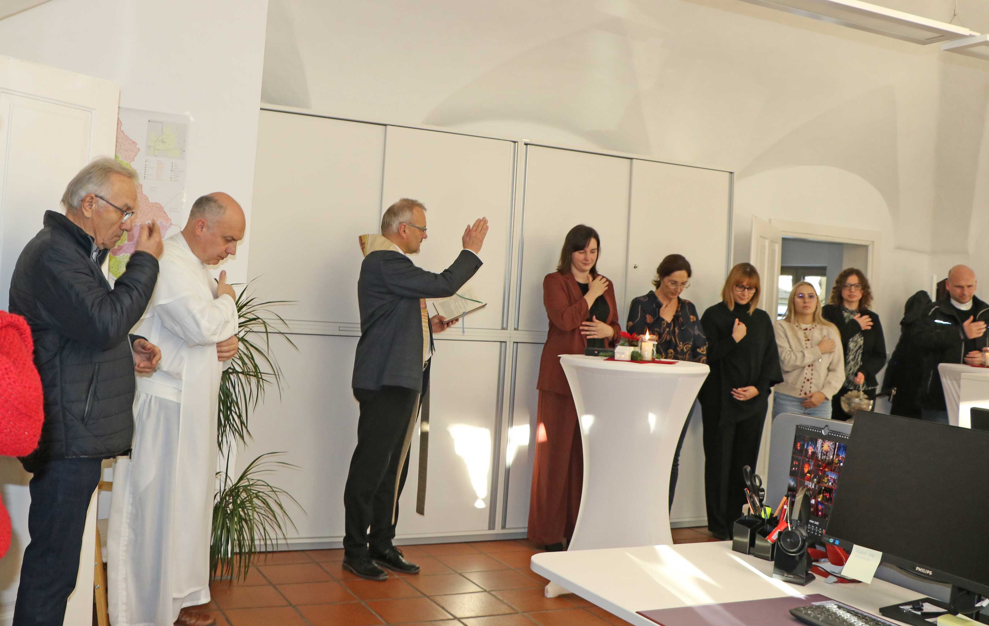 Am Dienstag, den 9. Dezember, wurde das neue Dienstleistungszentrum Elsendorf offiziell eingeweiht und mit einer feierlichen kirchlichen Segnung durch Dekan Georg Birner eröffnet. Die Veranstaltung fand in Anwesenheit zahlreicher Persönlichkeiten statt, darunter Domkapitular Johann Ammer, Pfarrer Pater Paul Binkowski, die Prodekane Dr. Andreas Ring und Wilhelm Karsten, Landrat Martin Neumeyer, Bürgermeister Markus Huber, Kirchenpfleger Georg Linseisen sowie die Mitarbeiterinnen der Abteilung Pfarreienunterstützung und des dezentralen Zentrums.