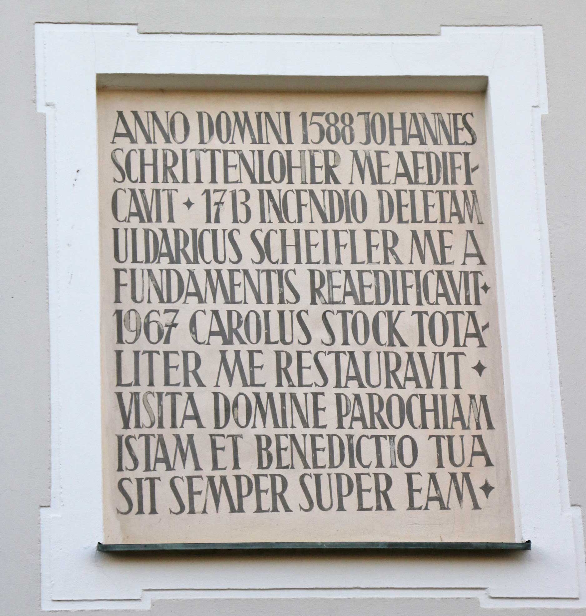 Bevor Dekan Georg Birner die feierliche Segnung des Dienstleistungszentrums vornahm, erläuterte er die Geschichte des Gebäudes, das bereits im Jahr 1588 von Johannes Schrittenloher erbaut wurde. Ein Brand im Jahr 1713 zerstörte das Gebäude, doch Ulrich Scheifler baute es wieder auf. 1967 erfolgte eine umfassende Restaurierung durch Karl Stock. Die Inschrift am Giebel des Hauses lautet: „Im Jahr des Herrn 1588 hat mich Johannes Schrittenloher erbaut. 1713 hat mich ein Brand zerstört, Ulrich Scheifler hat mich von Grund auf wieder aufgebaut. 1967 hat mich Karl Stock umfassend restauriert. Komm Herr, besuche diese Pfarrei und dein Segen sei immer über ihr.“