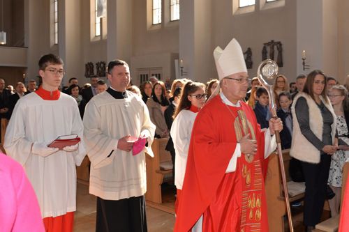 Die Firmlinge waren durch den Lektorendienst in die liturgische Gestaltung eingebunden, sprachen aber auch herzliche Begrüßungs- und Dankesworte. Den musikalischen Bestandteil der Liturgiefeier gestaltete die Band „Zeitlos“ mit dem Projektchor unter der Leitung von Gemeindereferentin Christina Zwick. Die Orgel hatte Christine Fürbaß übernommen. Nach dem Segnen der Andachtsgegenstände und dem Pontifikalsegen des Bischofs fand der feierliche Auszug statt. Hier sorgte der Pfarrgemeinderat für einen Sektempfang und für Firmlinge, Eltern und Paten bot sich die Gelegenheit zum Gespräch mit Bischof Rudolf.