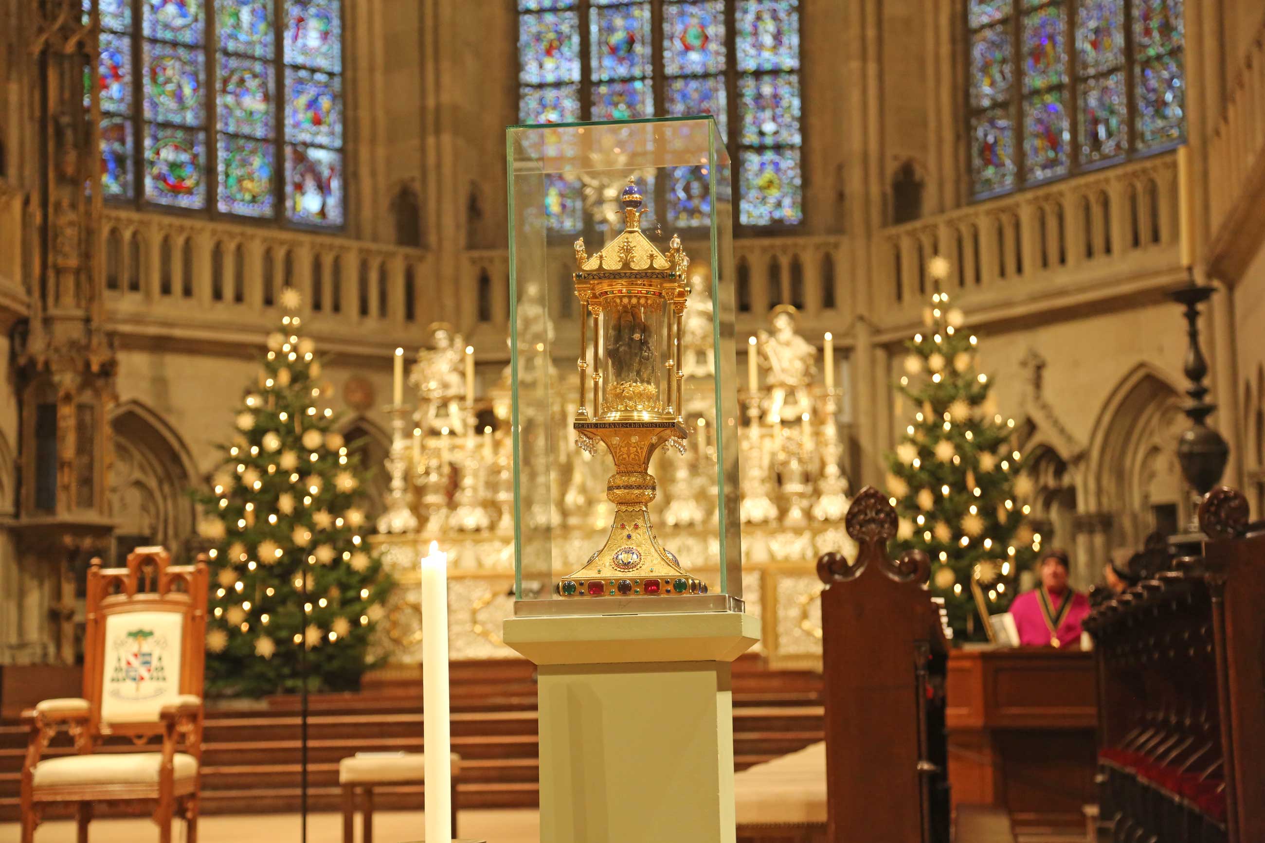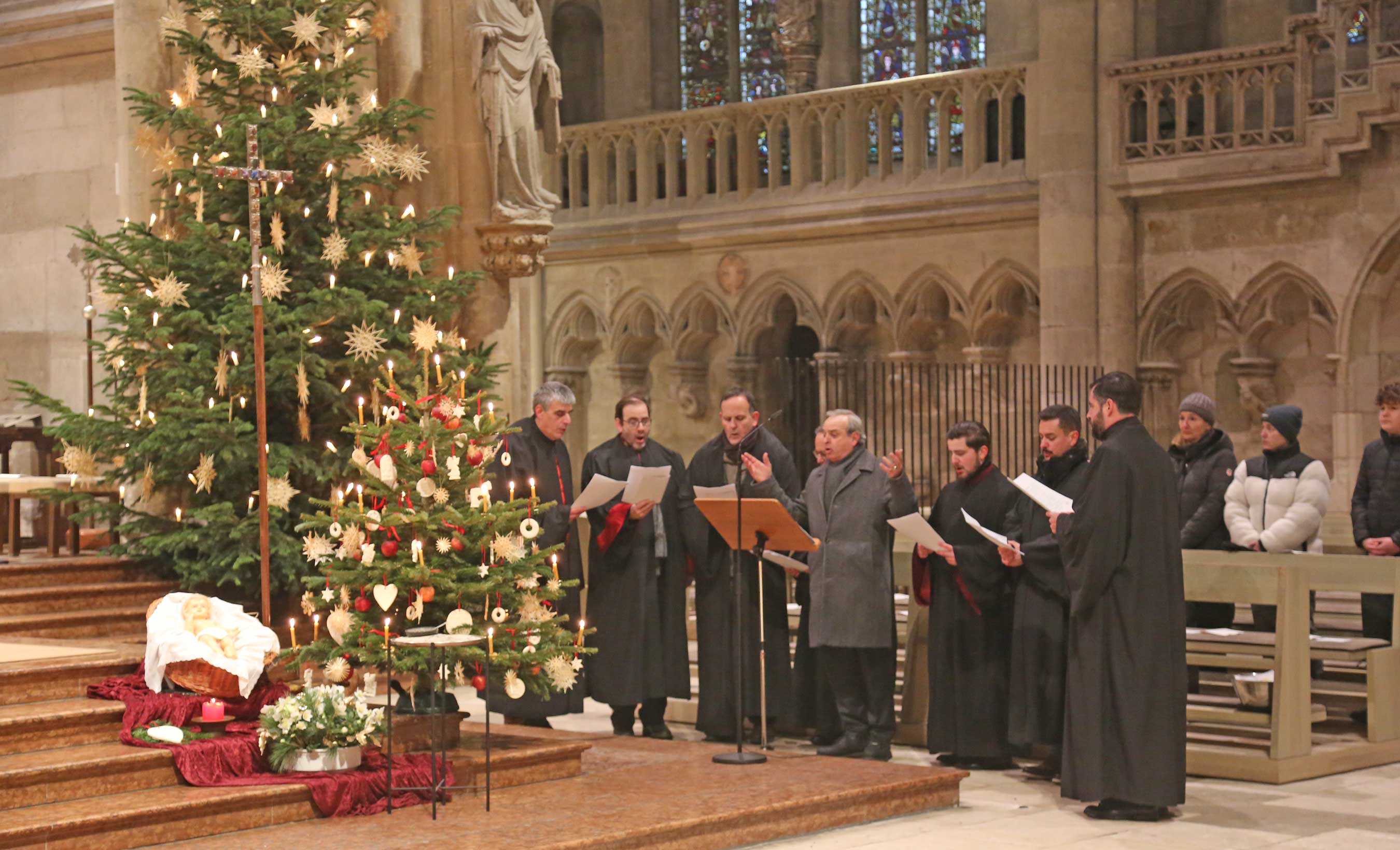 Kirchenmusikalisch trafen sich an diesem Nachmittag ost- und westkirchliche Traditionen, zum Klingen gebracht durch den Byzantinischen Kantorenchor München unter Leitung von Prof. Dr. Konstantin Nikolakopoulos zum einen und durch einen Männerchor der Regensburger Domspatzen unter Leitung von Max Rädlinger und Domorganist Prof. Franz Josef Stoiber zum anderen. Im Chorraum war eigens das Handreliquiar des hl. Johannes Chrysostomus gut sichtbar für alle Gläubigen auf eine Stehle gestellt worden. Der Kirchenvater aus dem 4. Jahrhundert, dessen Handreliquie sich seit 1652 in Regensburg befindet, erfährt in den Ostkirchen große Verehrung, ist er doch auch der Schöpfer der gleichnamigen Liturgie.