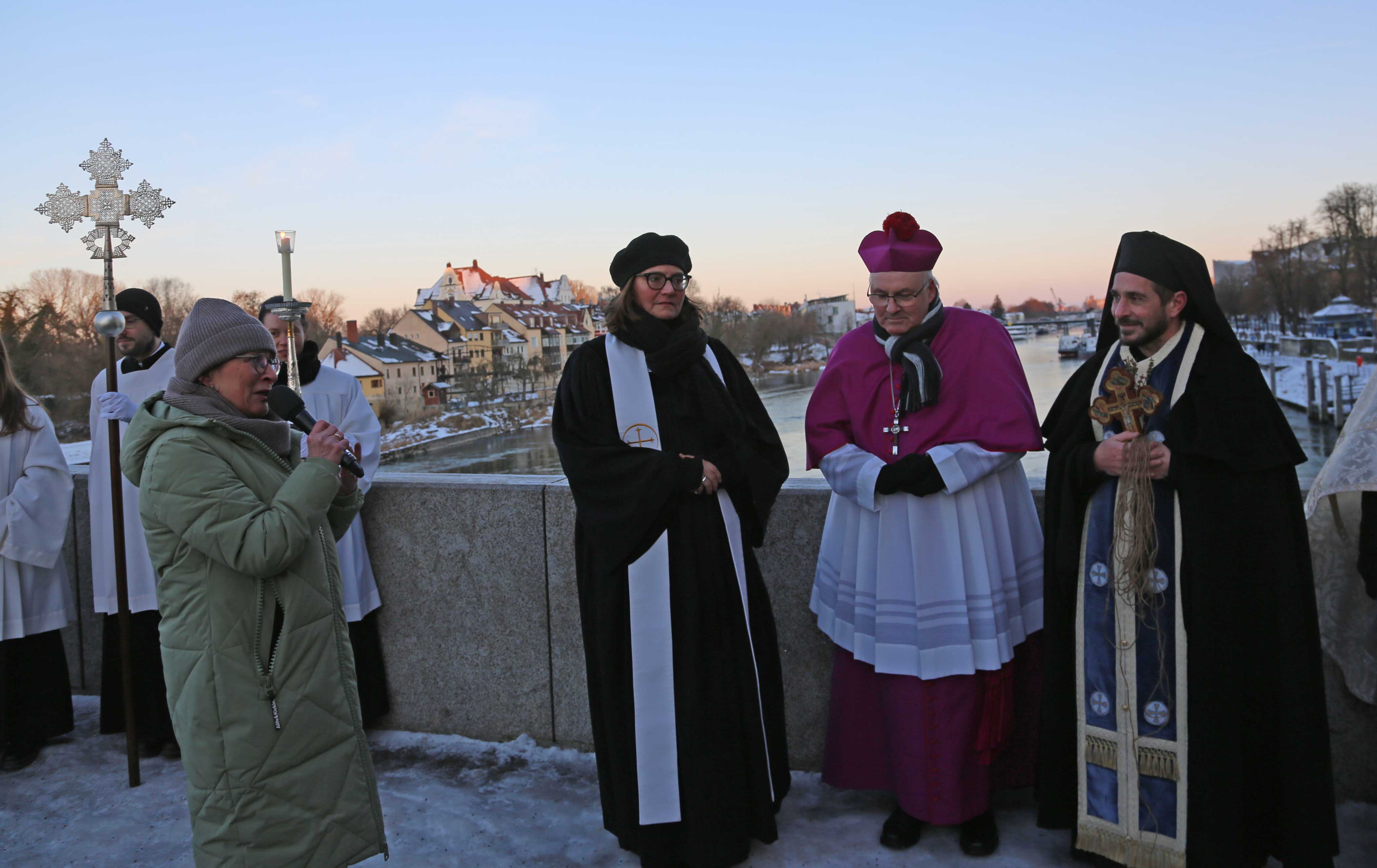 Geistlichkeit, liturgischer Dienst und der Byzantinische Chor nahmen dann bei der Donausegnung nach orthodoxer Tradition, die seit 2014 in Regensburg an der Steinernen Brücke gefeiert wird, auf der Brücke Platz, die zahlreichen Gläubigen direkt am Ufer der Donau unterhalb der Brücke. Dreimal wurde das Segenskreuz in die Fluten der Donau geworfen, jeweils von einem Vertreter der drei anwesenden christlichen Konfessionen. Damit wird nicht nur an die Taufe Jesu im Jordan erinnert, sondern auch der Fluss, alle Gewässer und alle, die daran wohnen, gesegnet sein. Oberbürgermeisterin Gertrud Maltz-Schwarzfischer bezeichnete die Donau in ihrem Grußwort als die Lebensader der Stadt, die auch ein deutliches Zeichen dafür sei, dass Menschen nur in Gemeinschaft das Leben meistern könnten. Bischof Rudolf bedankte sich beim scheidenden Regensburger Stadtoberhaupt dafür, dass es ihr in den zurückliegenden Jahren immer ein großes Anliegen gewesen sei, bei Vesper und Donausegnung dabei zu sein und mitzubeten.