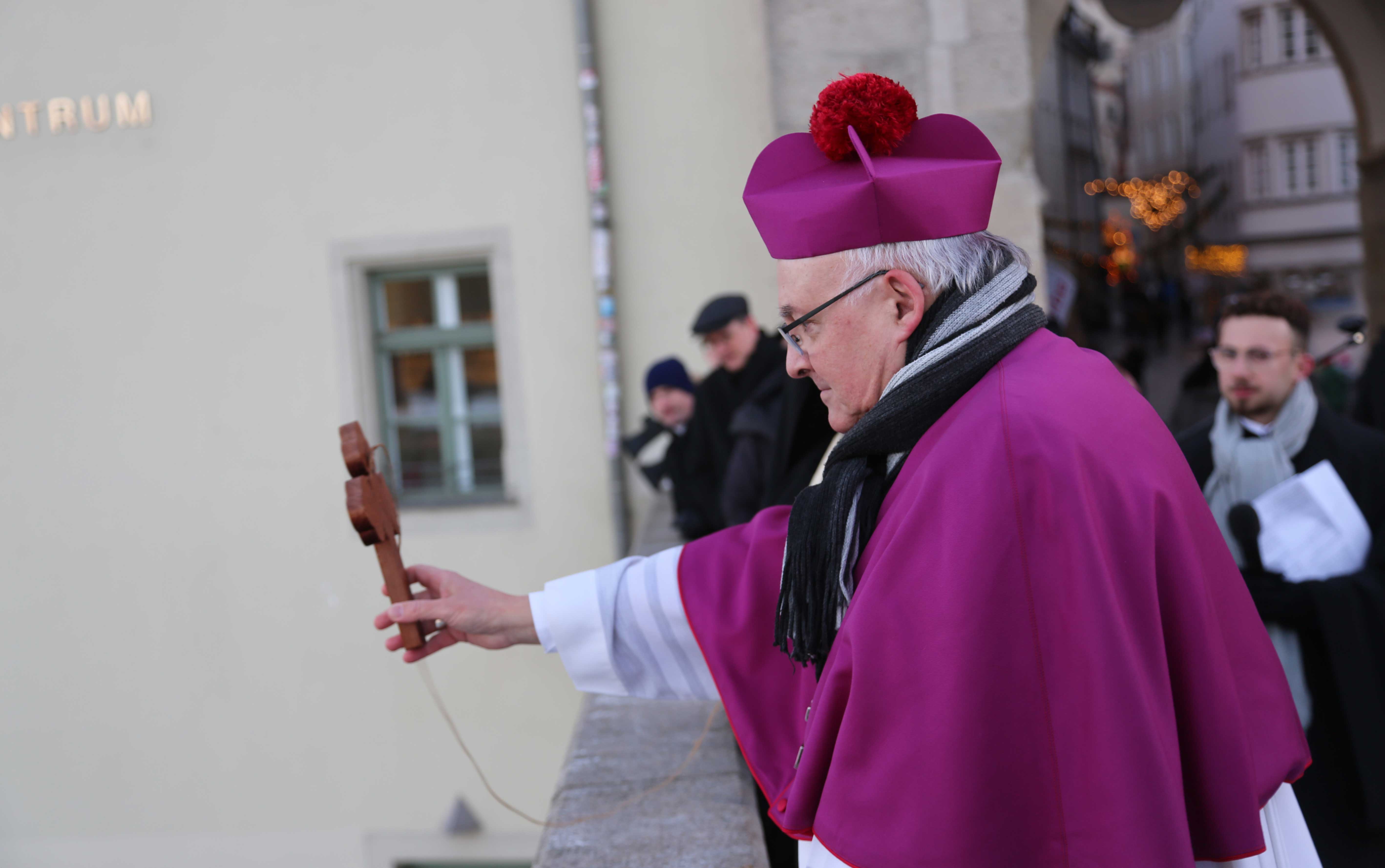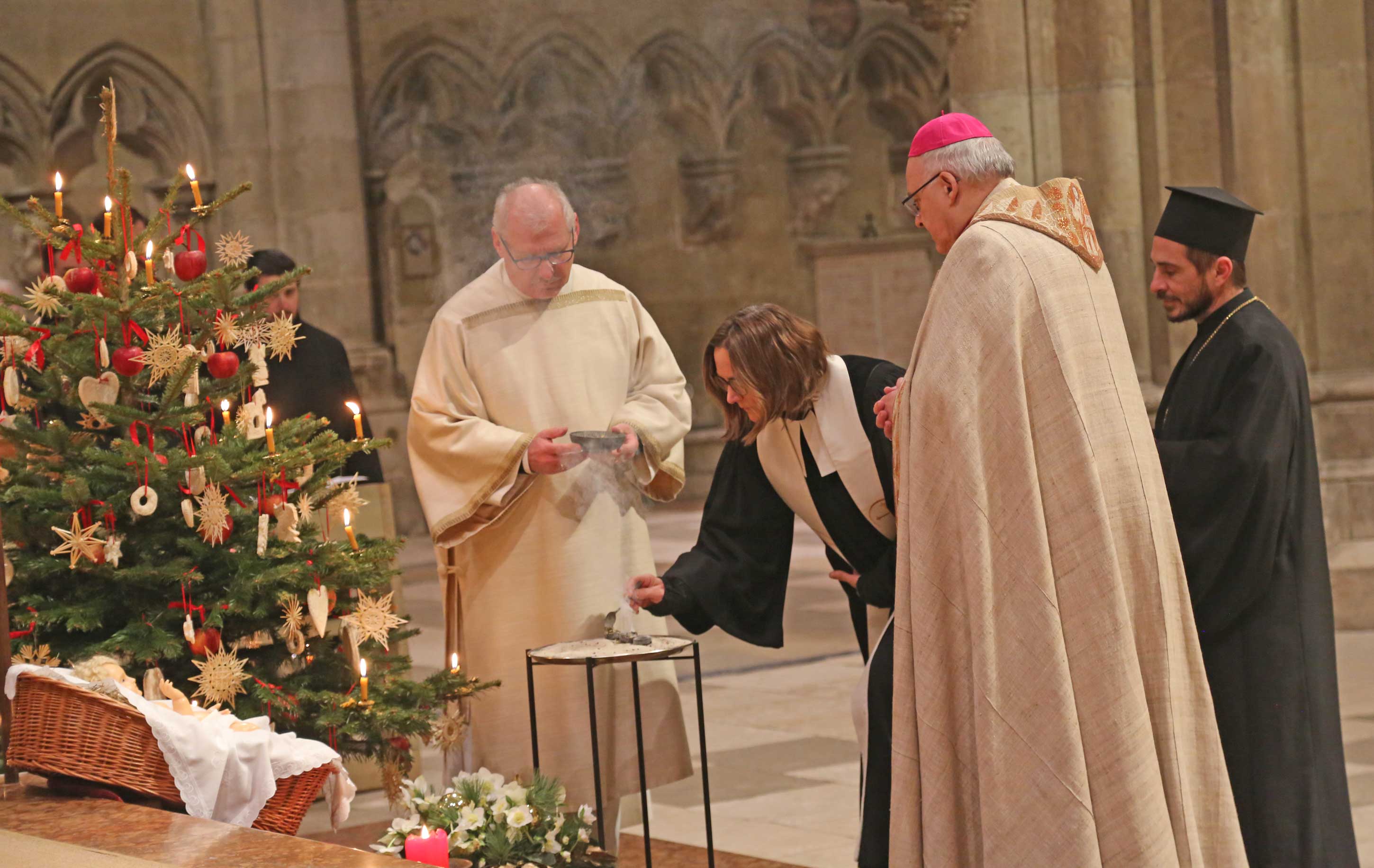 In Anlehnung an den Psalm 141 legten während dem Gesang des Magnifikats Bischof Rudolf, Pfarrerin Marttunen-Wagner und Archimandrit Petros Weihrauch in eine Schale an den Altarstufen ein, auch ein Zeichen für das Gebet in ökumenischer Verbundenheit. Die Fürbitten sprachen neben der Pfarrerin Marttunen-Wagner, die den erkrankten Regionalbischof Klaus Stiegler vertrat, Dr. Thomas Rigl, Vorsitzender der Arbeitsgemeinschaft christlicher Kirchen Regensburg, und der Bischöfliche Ökumenebeauftragte, Prof. Dr. Christoph Binninger. Bevor sich die Prozession durch die Stadt Richtung Donau auf den Weg machte, spendeten Bischof, Pfarrerin und Archimandrit den Aaronitischen Segen zum Abschluss des Vespergottesdienstes.