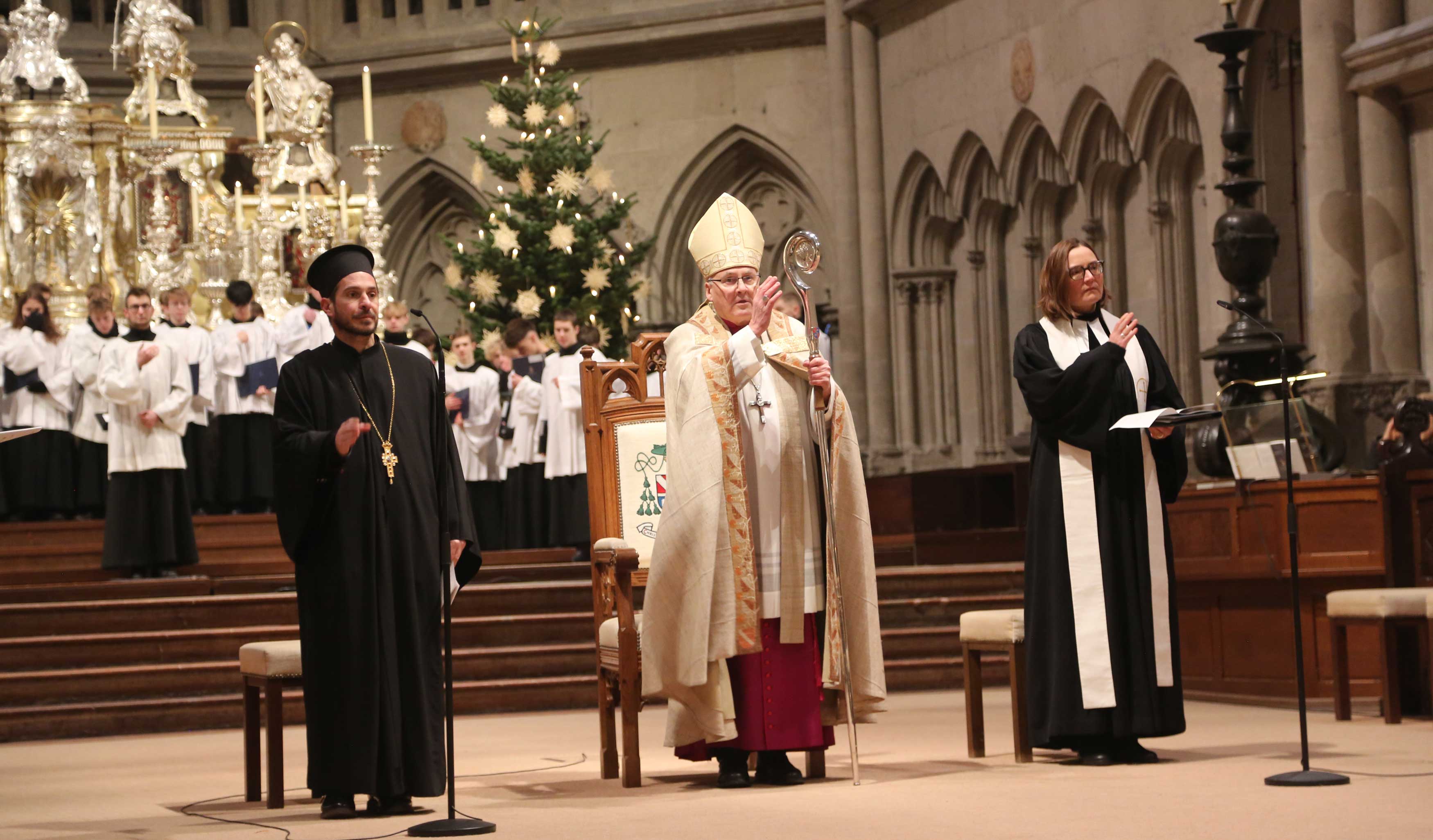 „Von Herzen grüße ich Sie alle zur ökumenischen Vesper hier im Regensburger Dom, bevor wir dann wieder zur Donau, unserem Jordan, hinausziehen, um unseren Fluss, unsere Lebensader und mit ihr stellvertretend alle Gewässer durch das dreimalige Einsenken des Segenskreuzes zu segnen“. Mit diesen Worten grüßte Bischof Dr. Rudolf Voderholzer alle Gläubigen, die am Sonntagnachmittag, am Fest der Taufe des Herrn, in den Dom gekommen waren. Mit ihm stand der griechisch-orthodoxe Archimandrit Petro Klitsch aus München und die evangelisch-lutherische Pfarrerin Marjaana Marttunen-Wagner von der Dreieinigkeits- und Neupfarrkirche in Regensburg dem Vespergottesdienst vor.