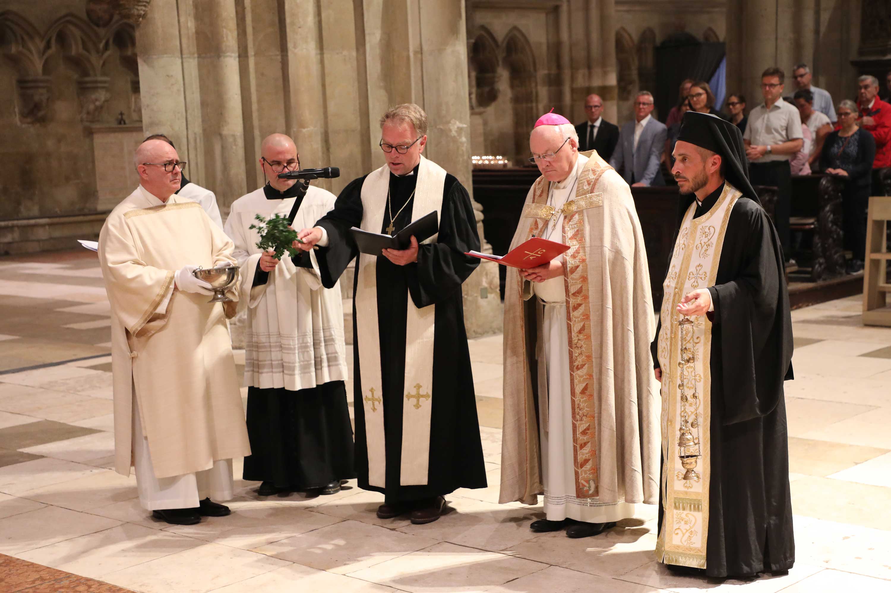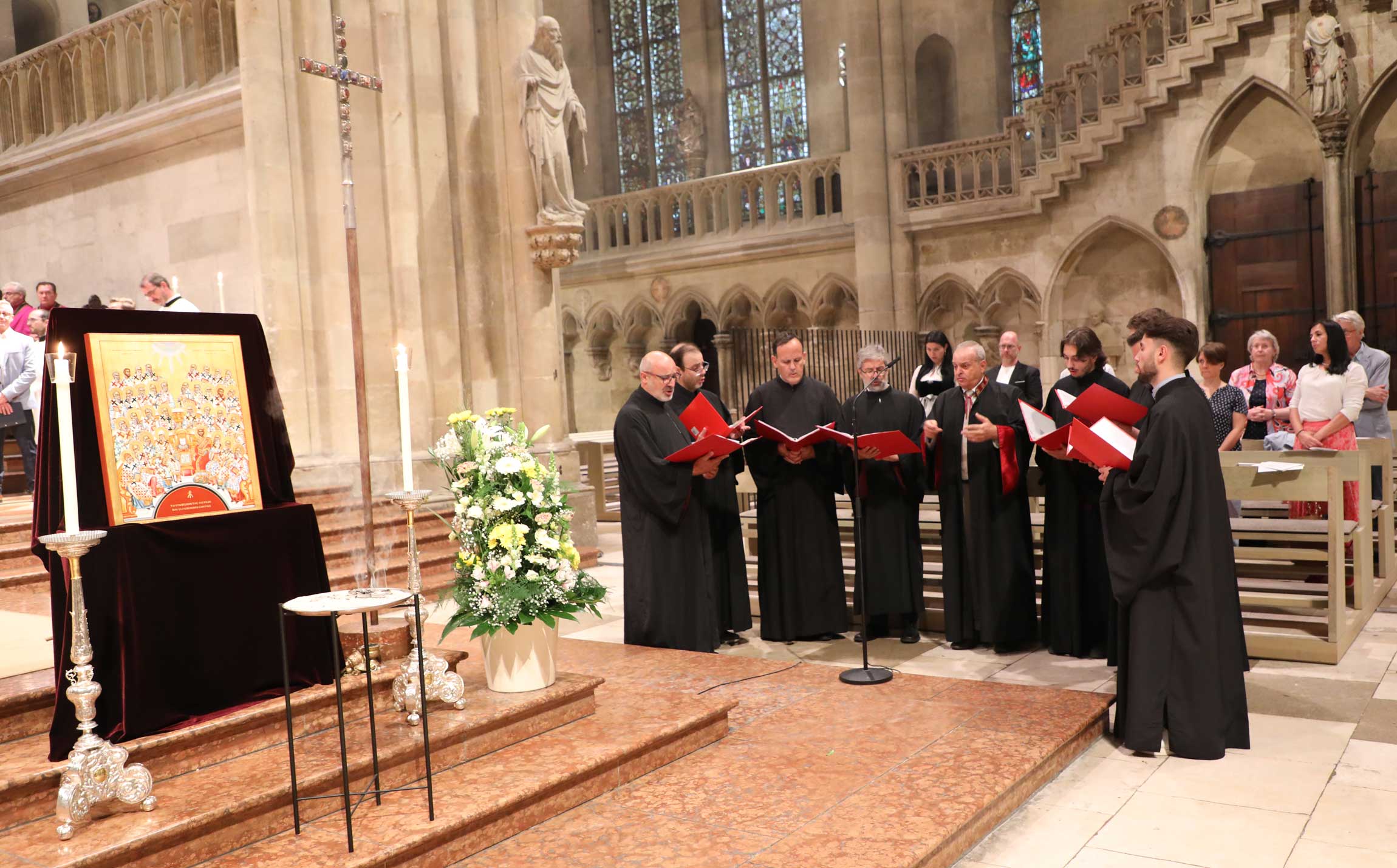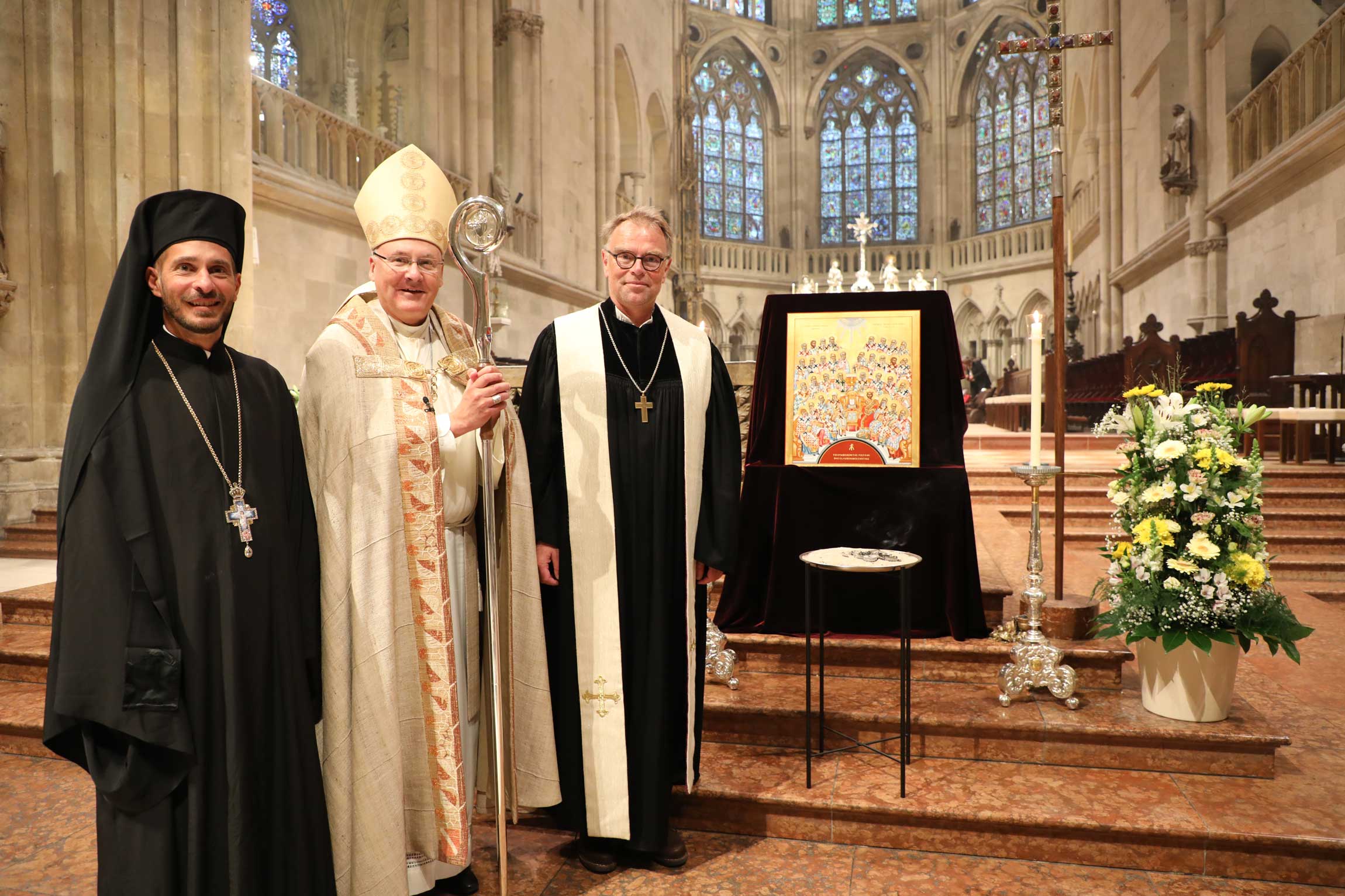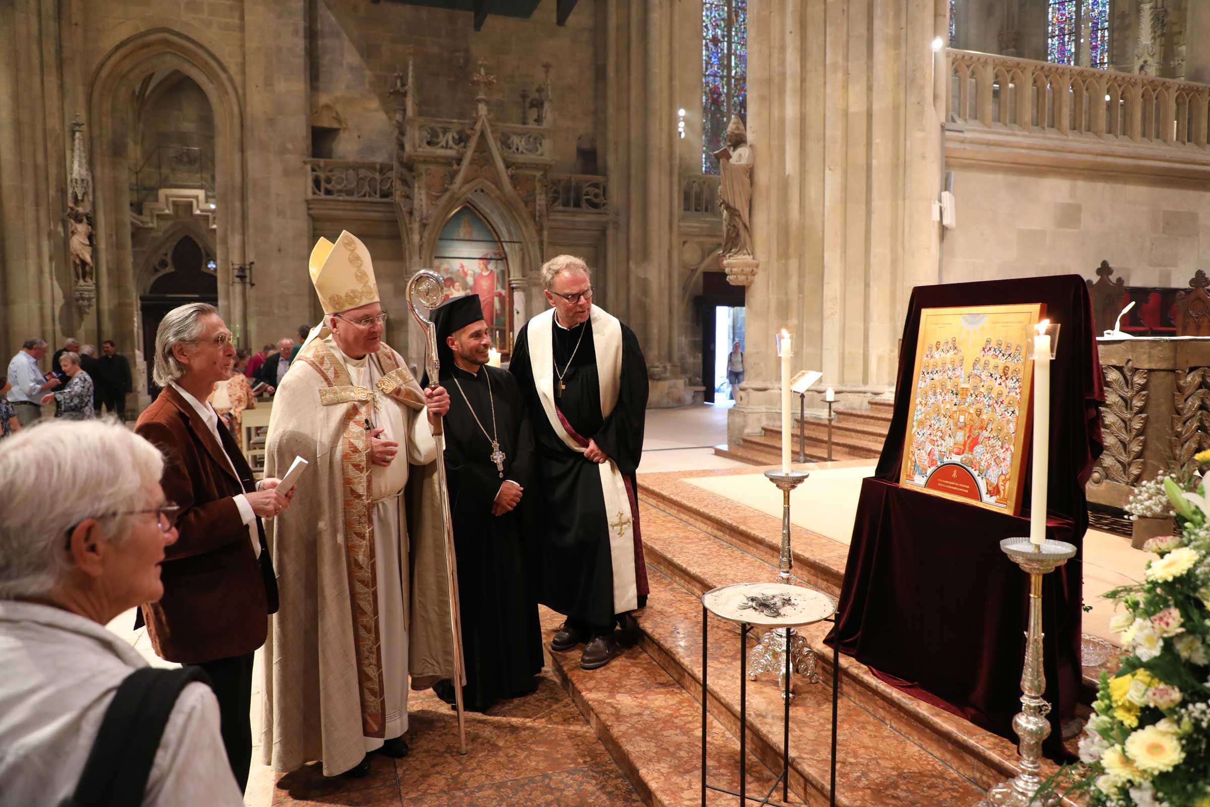 Zahlreiche Gläubige waren der Einladung gefolgt, um das Jubiläum dieser kirchengeschichtlich bedeutsamen Versammlung mitzubegehen. Die beeindruckende musikalische Gestaltung oblag dem Chor der Regensburger Domspatzen unter der Leitung von Domkapellmeister Christian Heiß, dem Byzantinischen Kantorenchor München unter der Leitung von Prof. Dr. Konstantin Nikolakopoulos, dem Evangelischen Altstadtposaunenchor Stadtbläser unter der Leitung von Katharina Garcia; an der Orgel spielte Domorganist Prof. Franz Josef Stoiber.