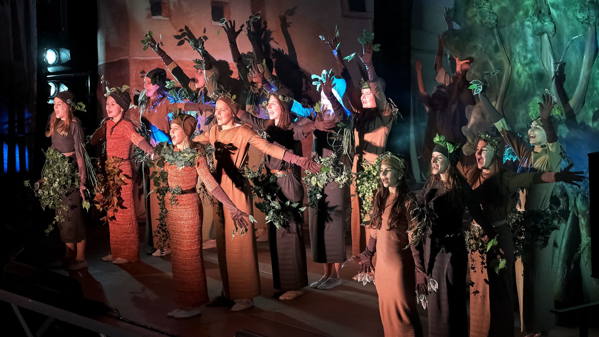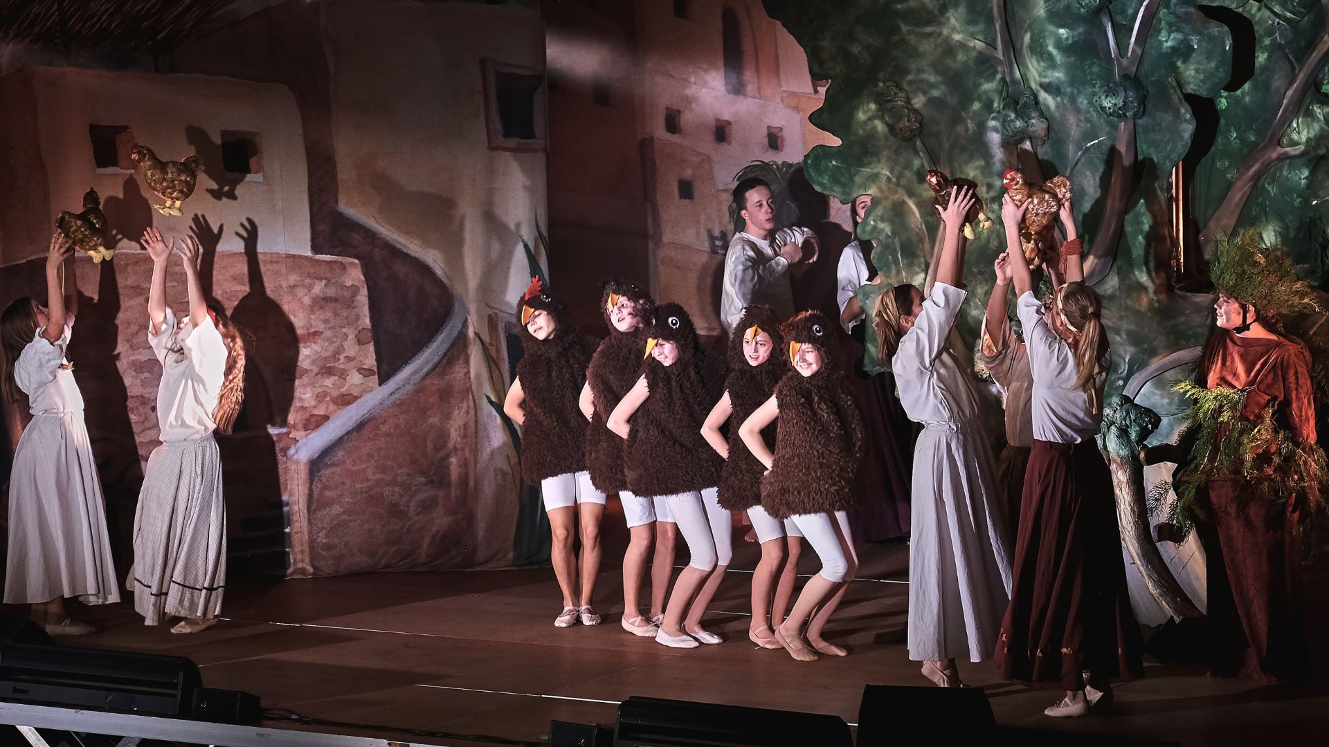 Schon der erste Auftritt, bei dem singende und tanzende „Bäume“ das Publikum begrüßen, zeigt den Schwung und die Energie der Aufführung. Die Darsteller beeindruckten mit präziser Choreografie (Magdalena Kritzinger) und klarem Gesang. Besonders humorvolle Elemente, wie die „Hühner“-Szene, lockerten die ernste Thematik auf.